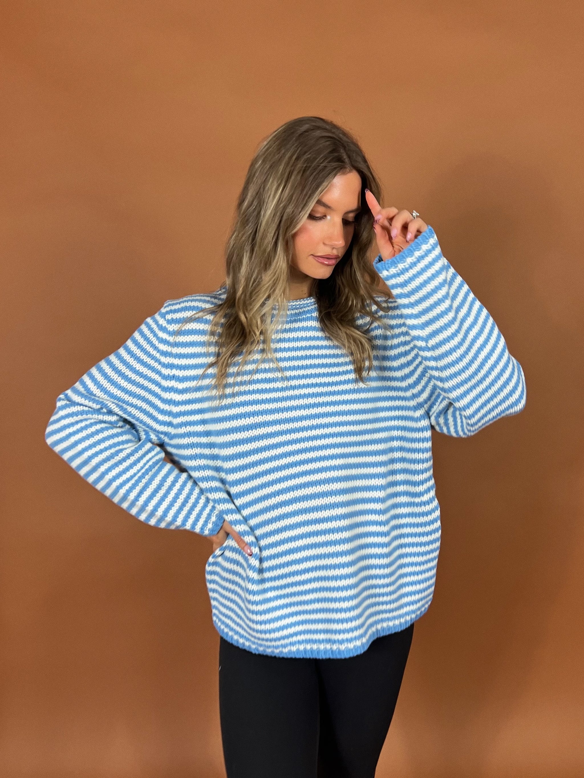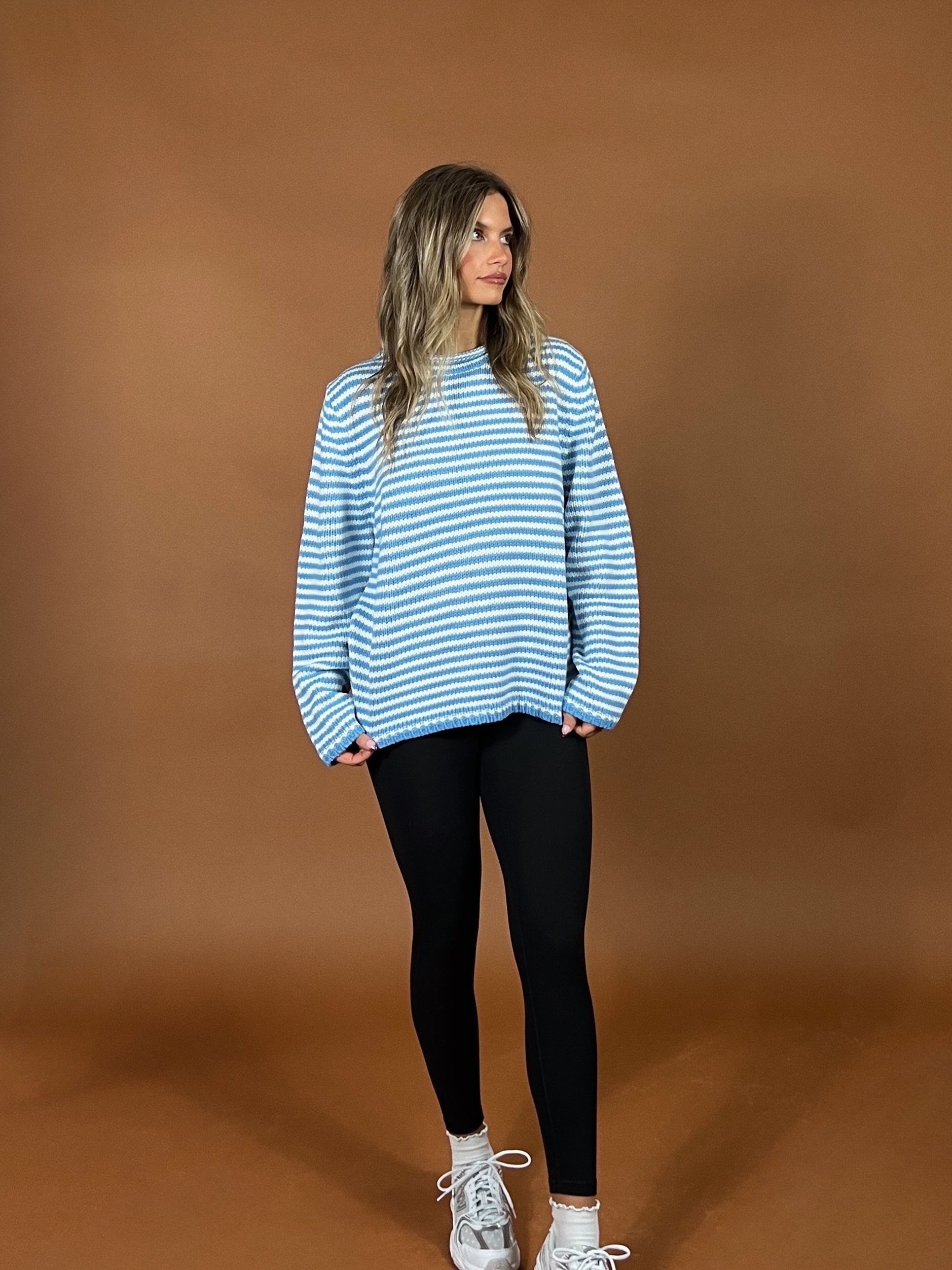 Soft, slouchy, and perfect for chill days. Features a classic navy stripe pattern with a relaxed drop shoulder fit and deep v neckline. Its lightweight...
