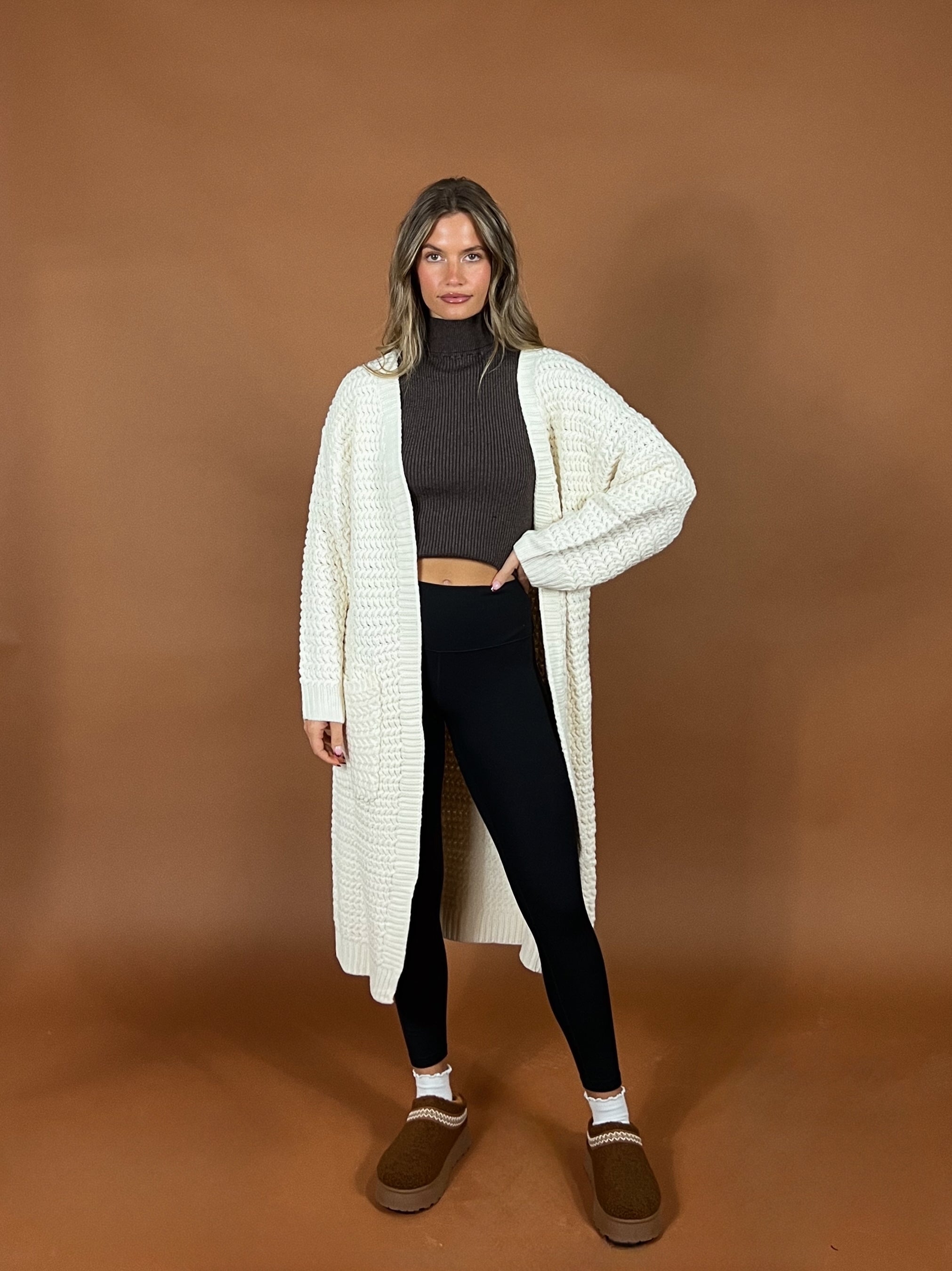 Soft spoken but never underestimated. A go to cardigan for crisp mornings and coffee runs. With its chunky cable knit texture, soft neutral hue, perfectly...