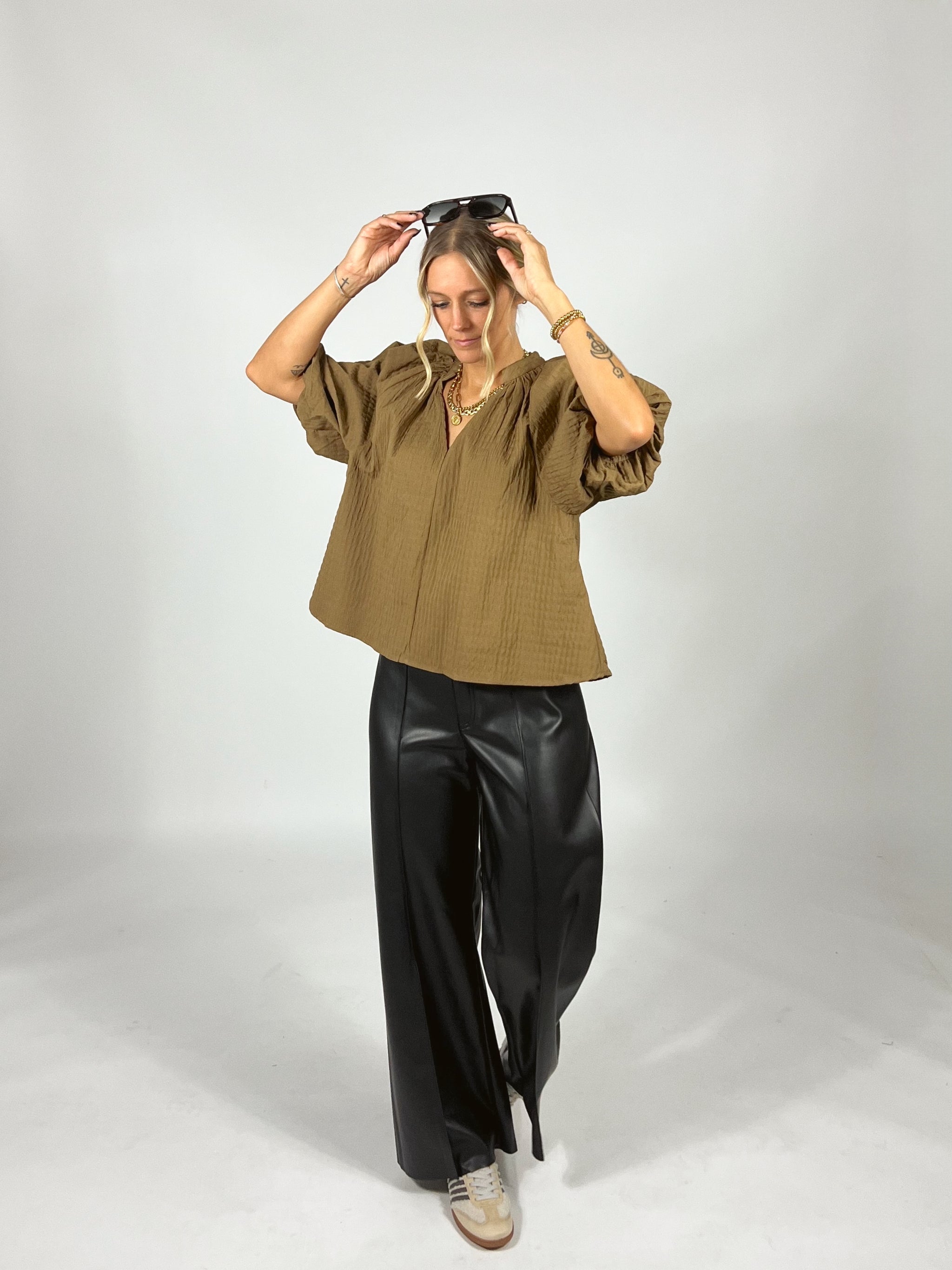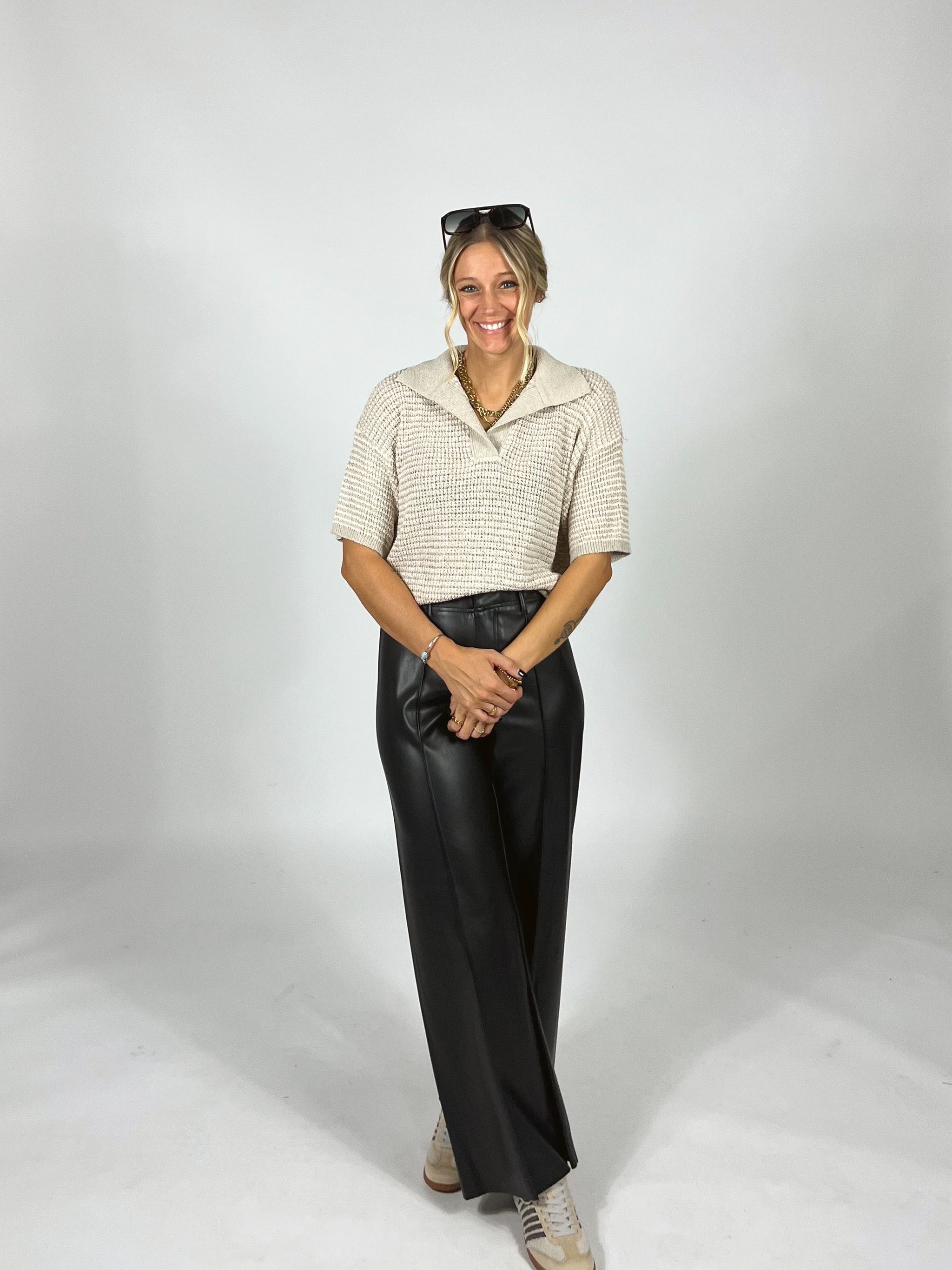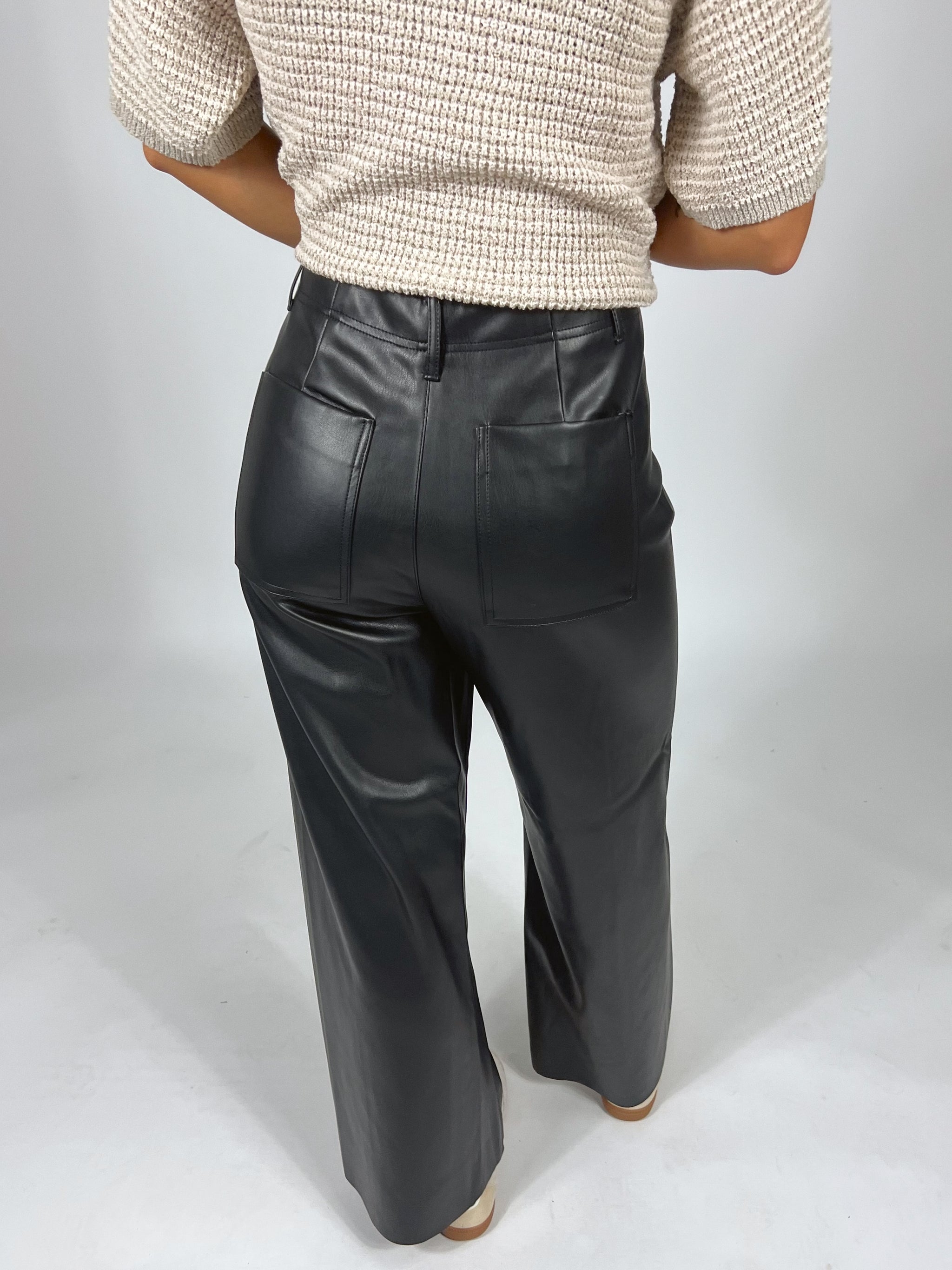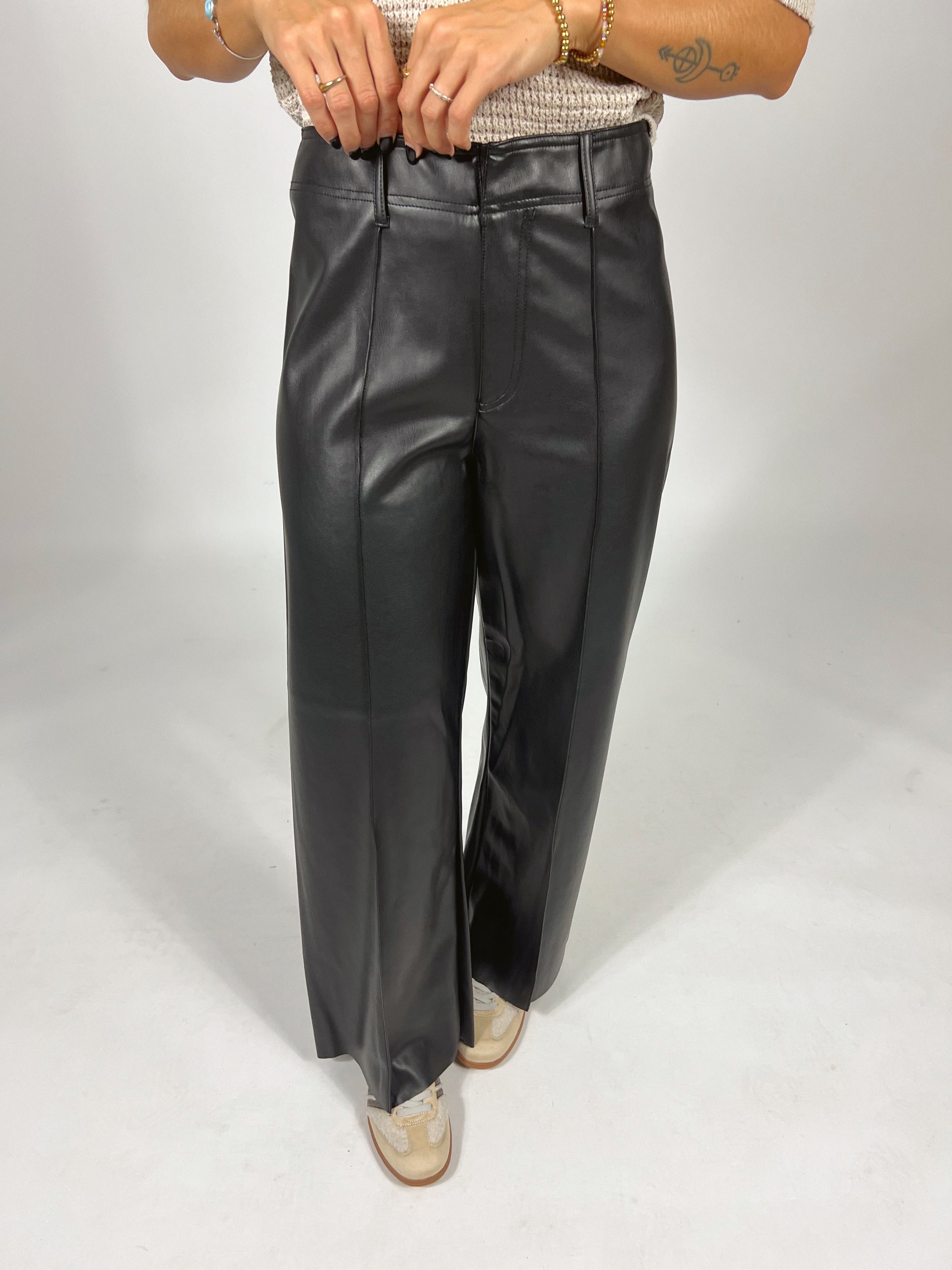 She's a rebel with or without the leather. Featuring a sleek faux leather finish, high waisted, straight leg fit, and pintuck detailing these pants bring...