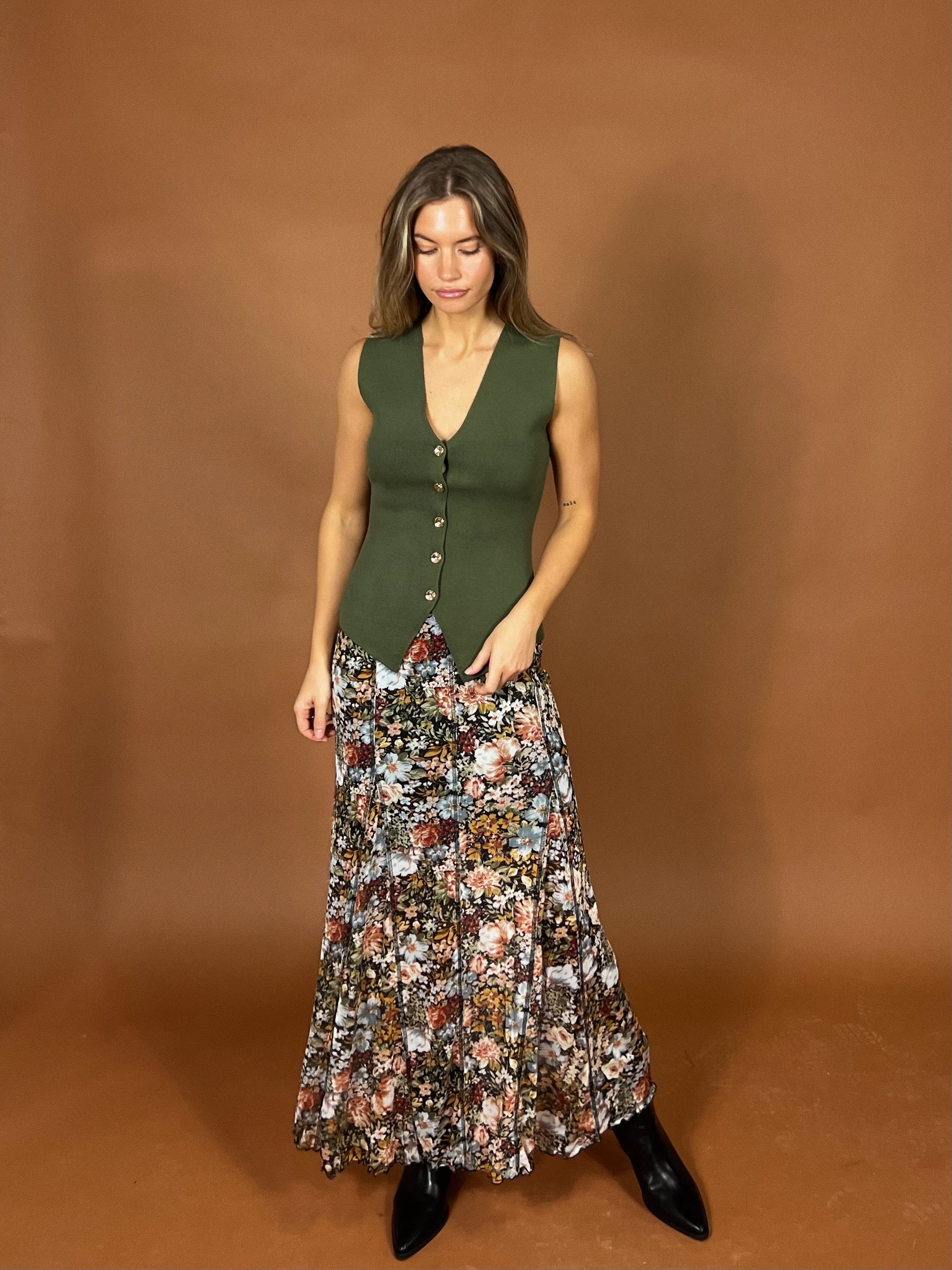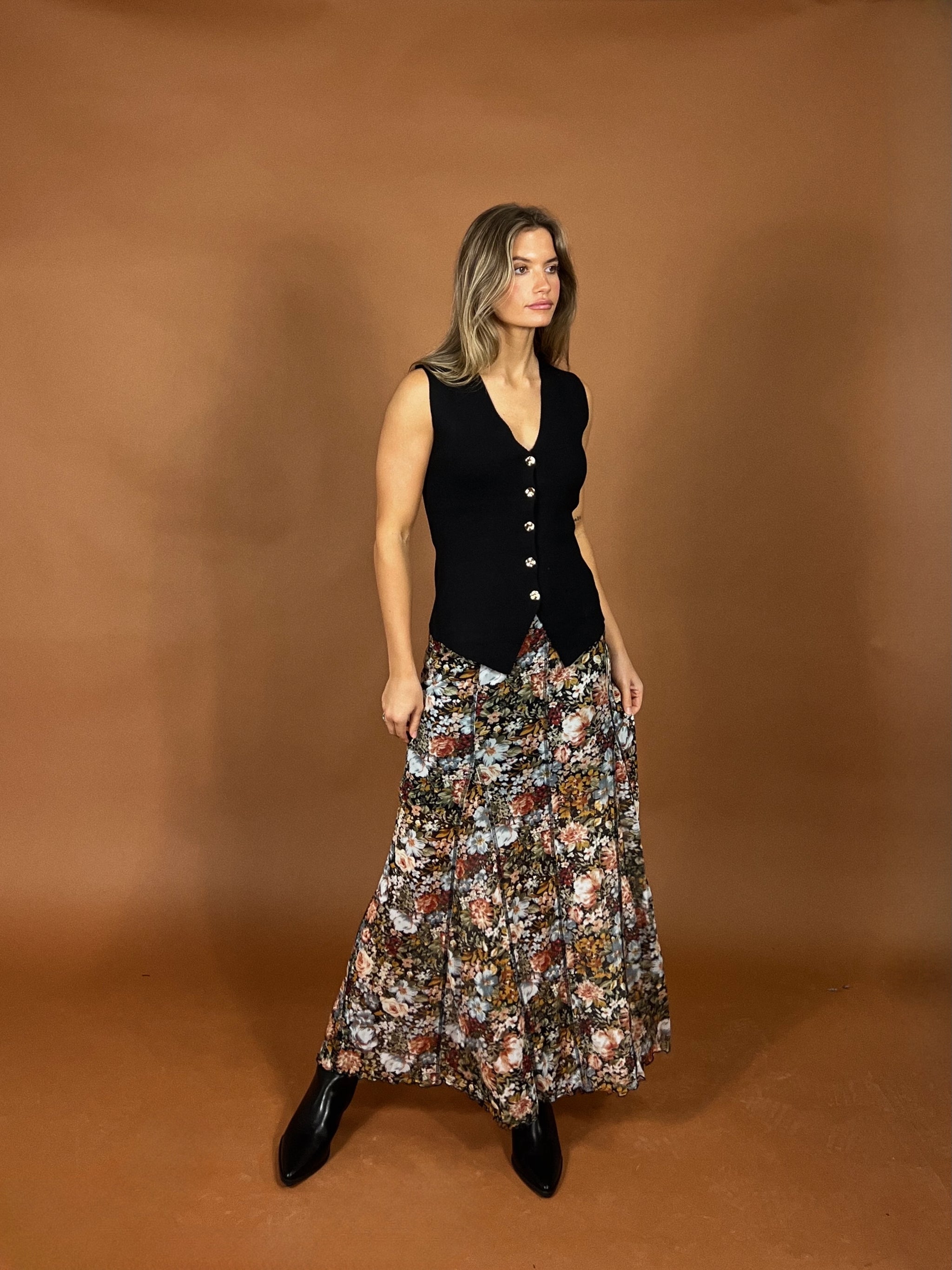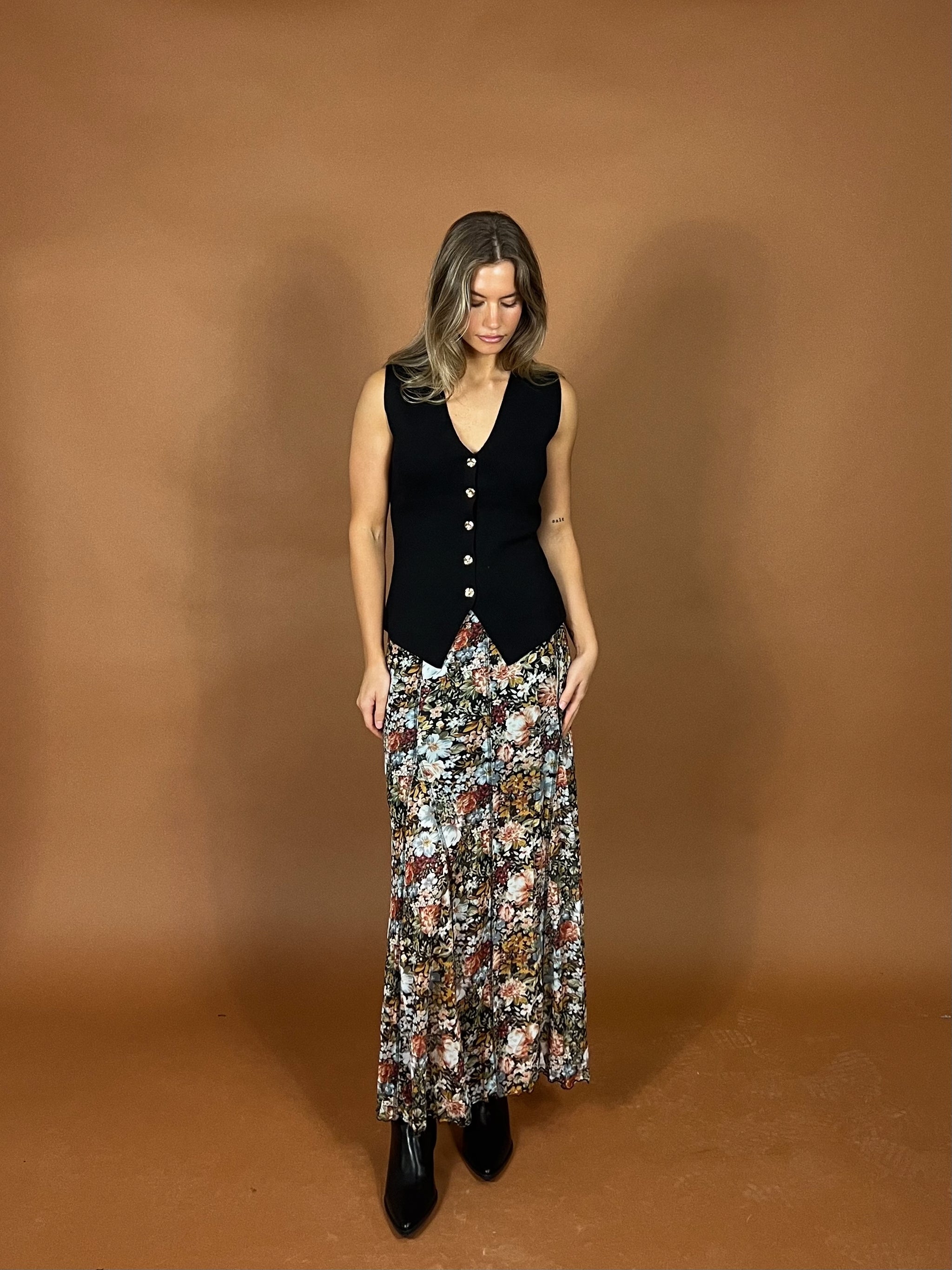 Cool, sleek, and a Fringe Best Seller. This high-waisted mesh maxi features a sheer overlay with bold red florals against a moody charcoal backdrop--giving it...