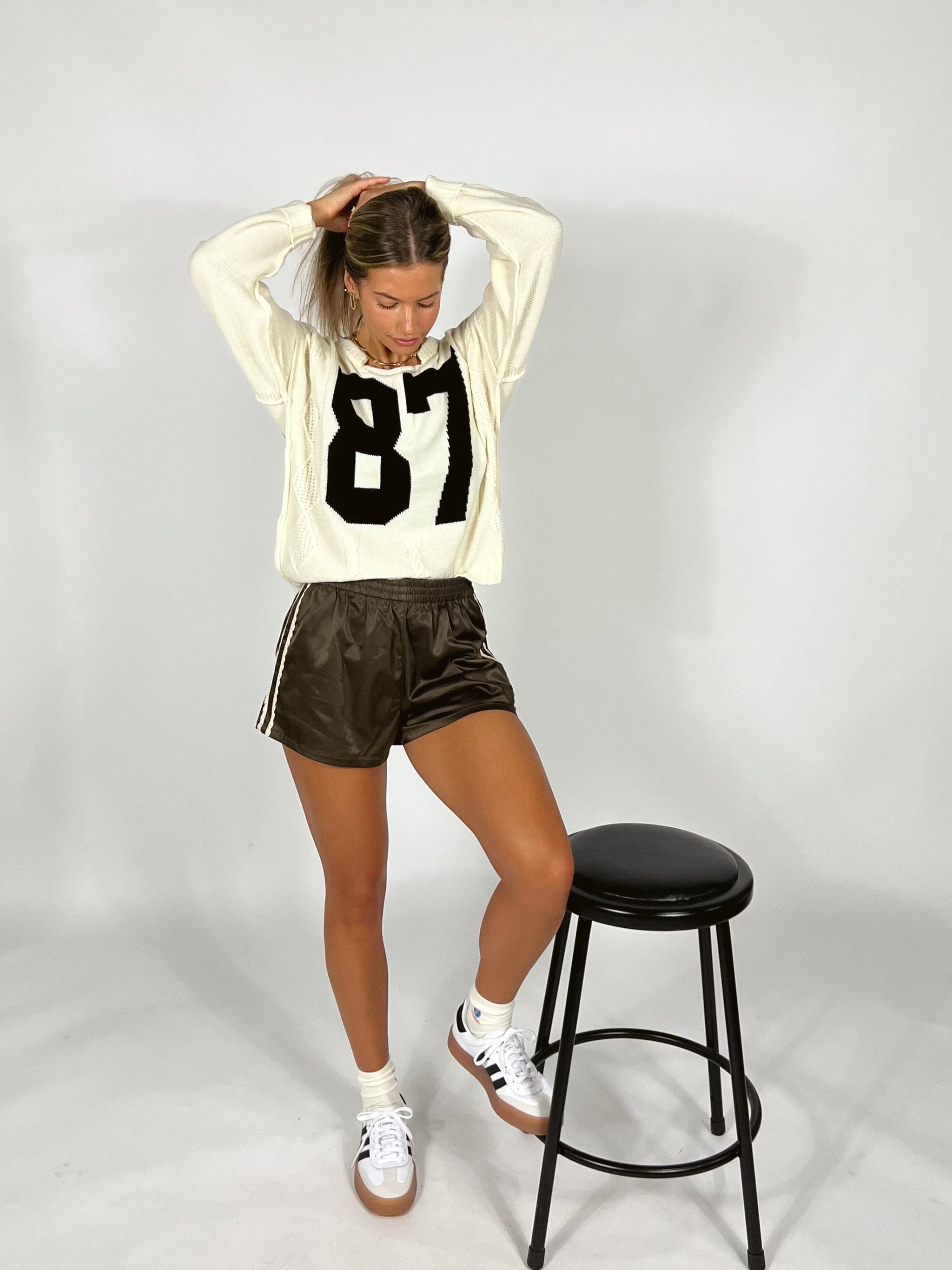 Cheering from the sidelines but stealing the show. A faux leather short decorated in pearl studs for a girly-meets-edgy look. High-waisted with a flattering fit,...