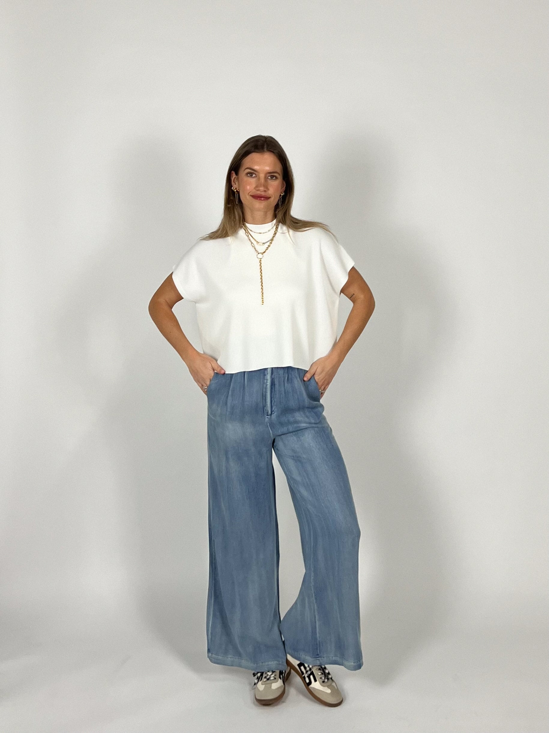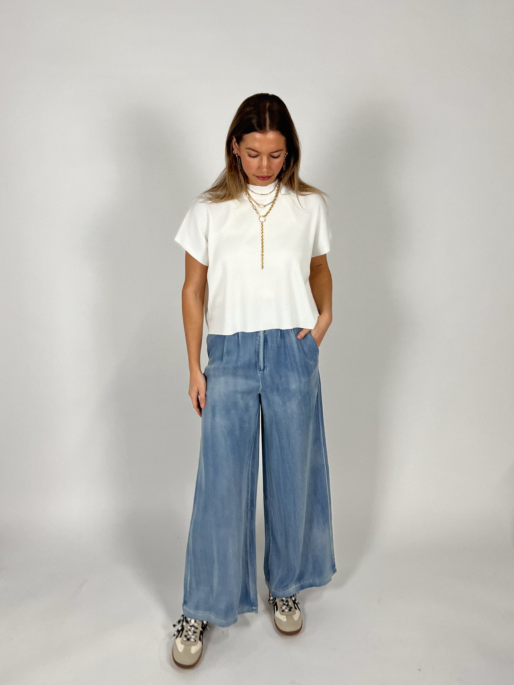 Elevated take on casual tailoring. Designed with a relaxed wide leg silhouette and soft pleating through the front, this pant features a comfortable elastic waistband...