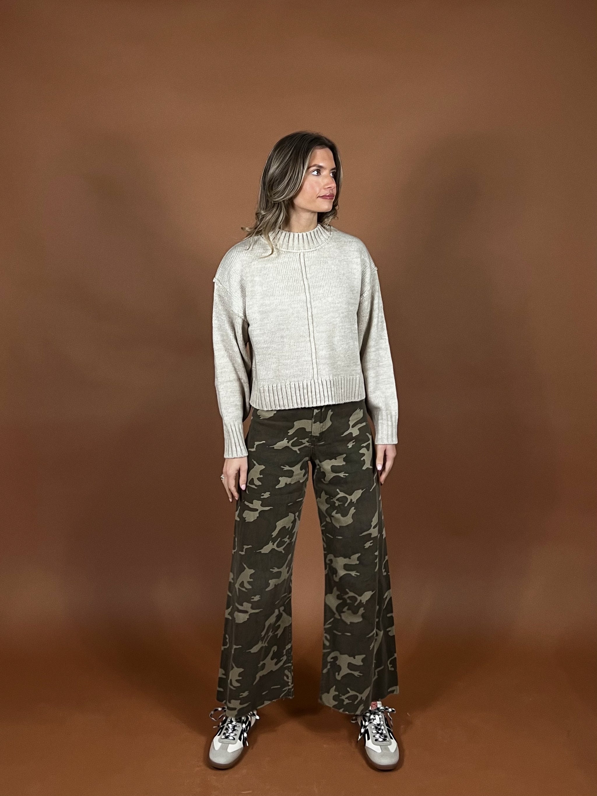 A best selling fit is back and in a cool camo! A wide leg fit in a stretchy denim with a high waist. Pair with almost anything for a cool girl twist on any outfit.