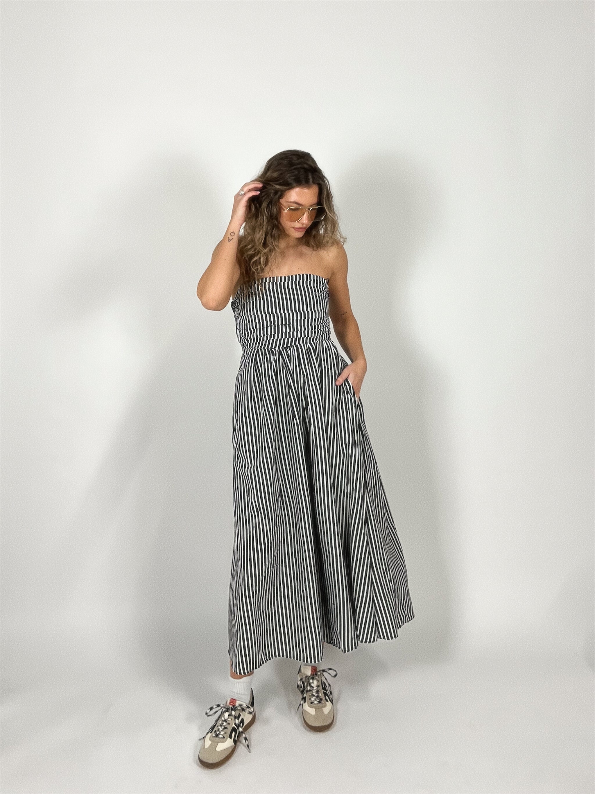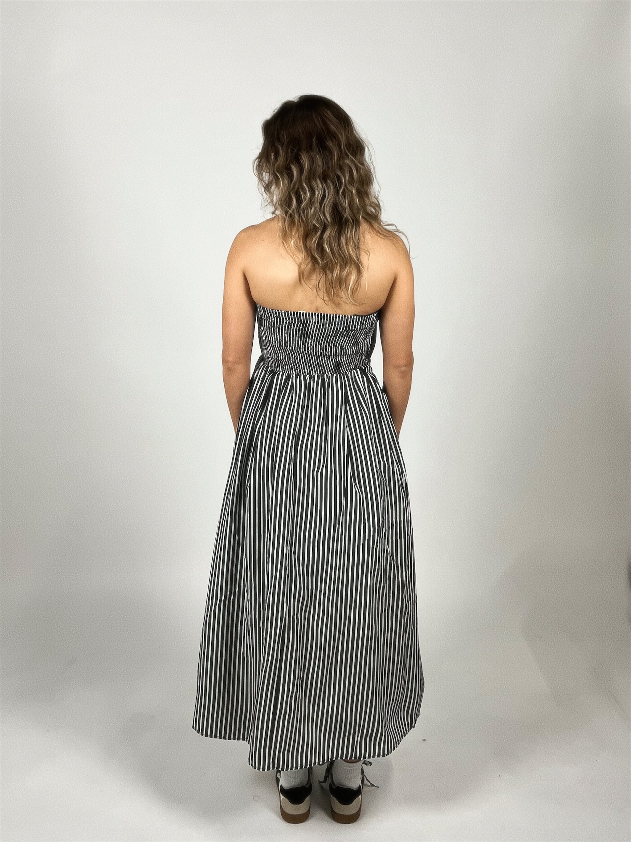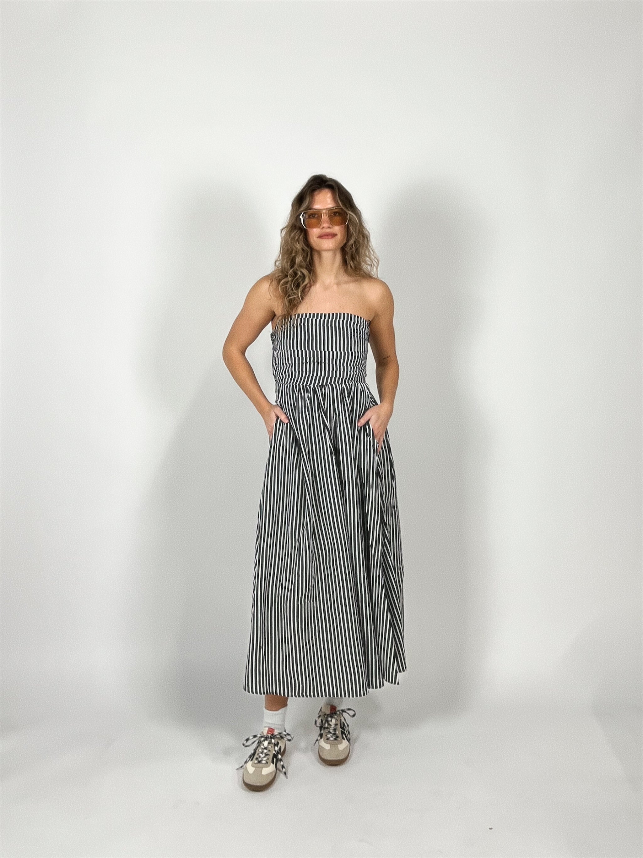 Easy and elevated. Features timeless vertical stripes, a strapless neckline, elastic backing, and a flowy hem that moves with you. Designed for days that turn...