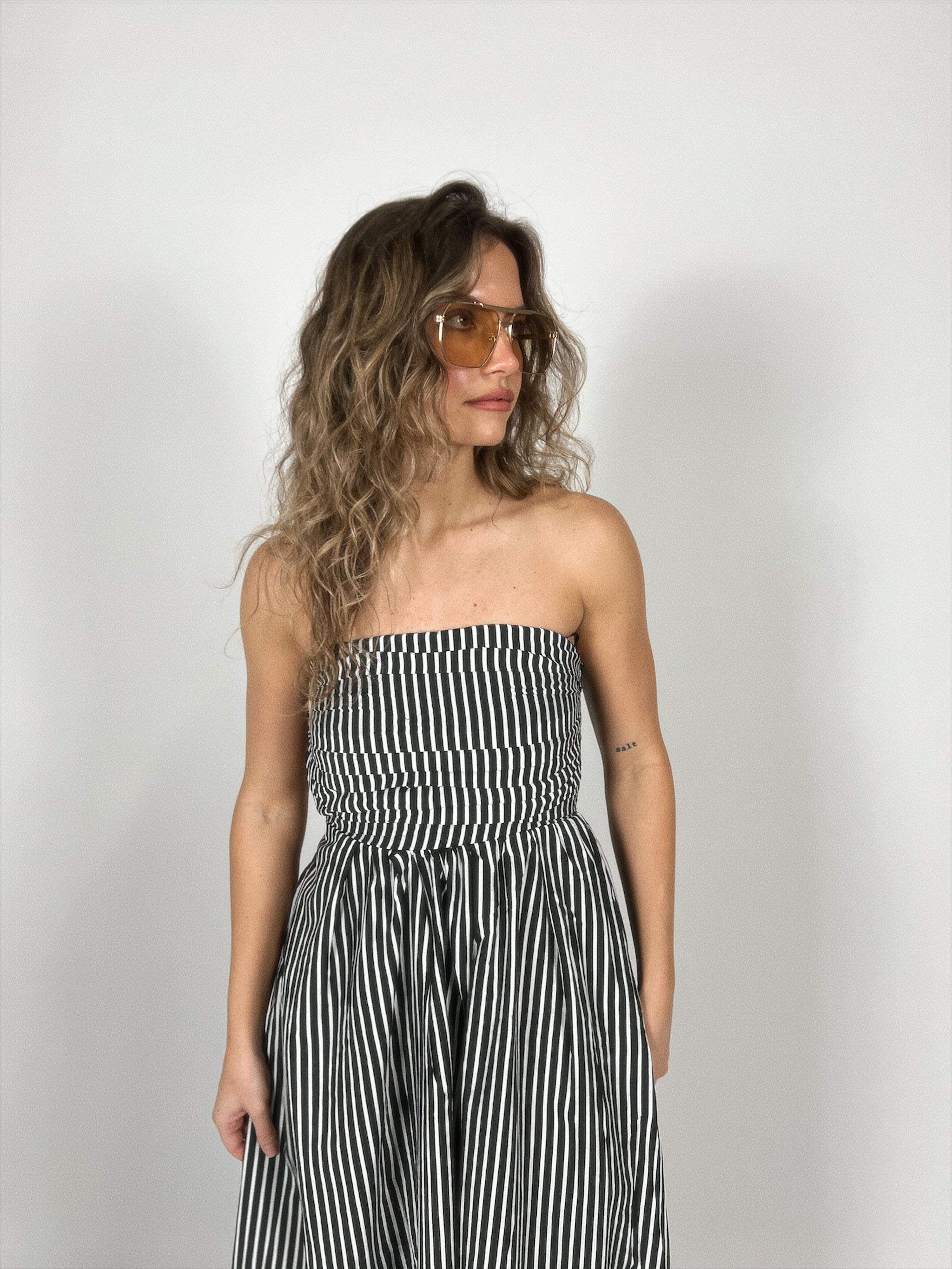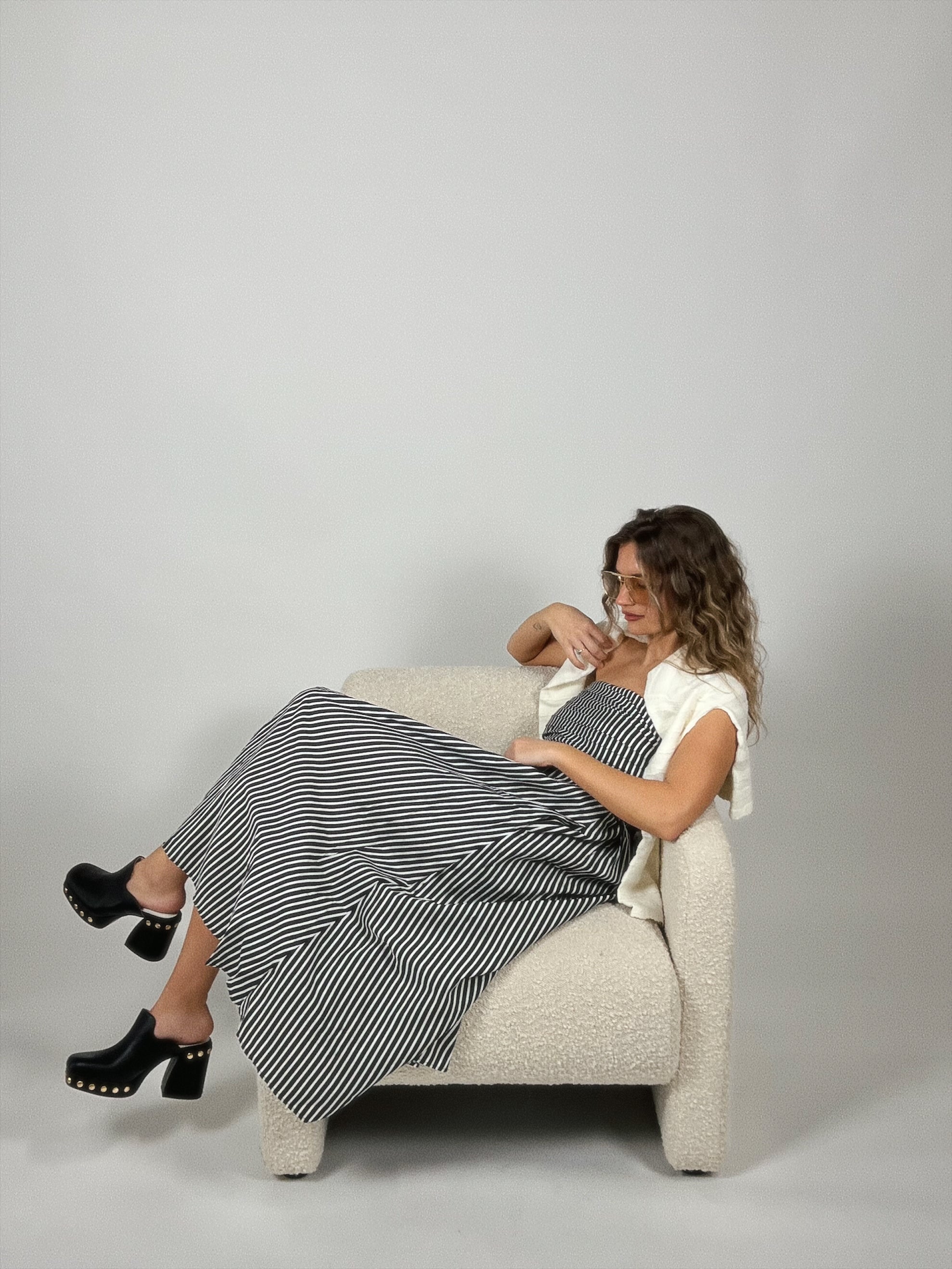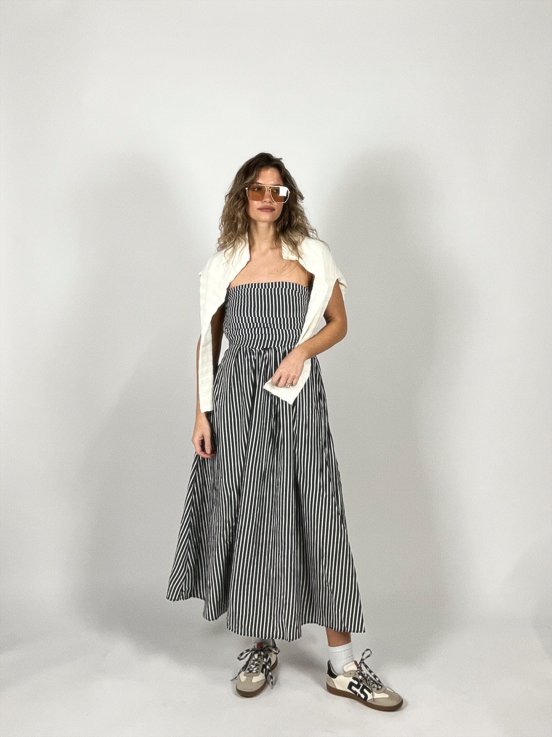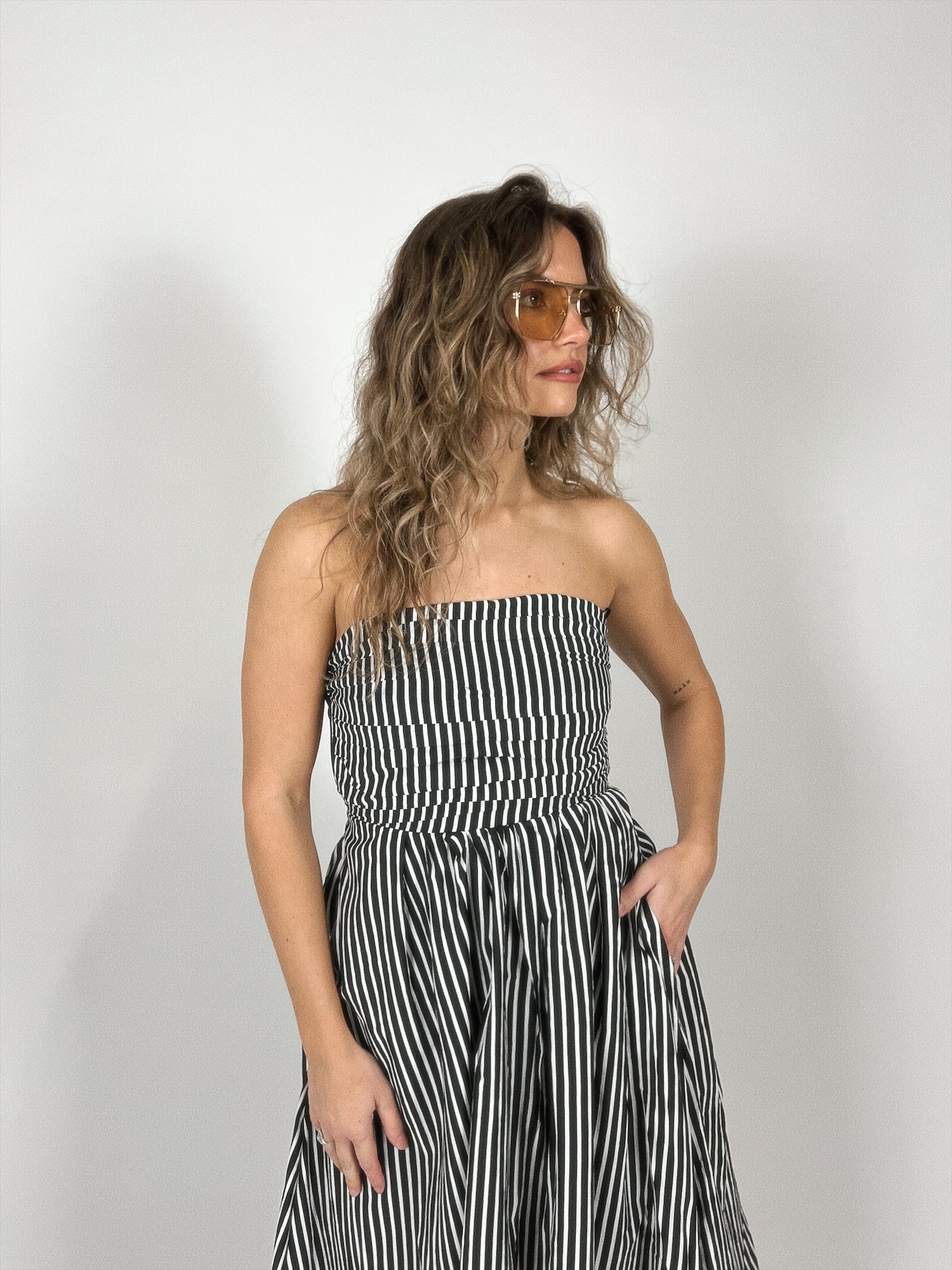 Easy and elevated. Features timeless vertical stripes, a strapless neckline, elastic backing, and a flowy hem that moves with you. Designed for days that turn...