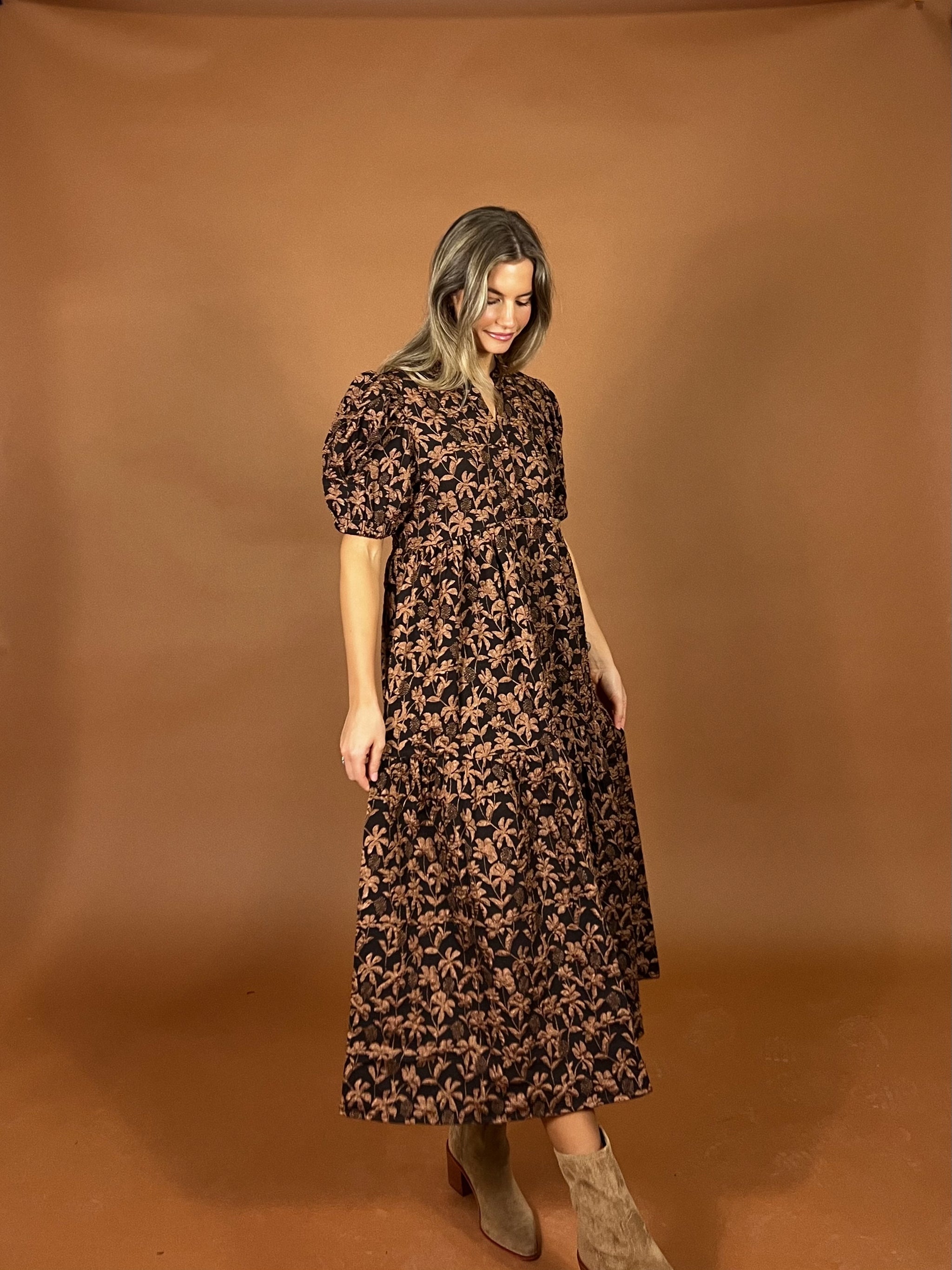 Stepping into the season with confidence -- and this dress. A timeless midi dress featuring rich autumn colors with a floral print that feels classic...