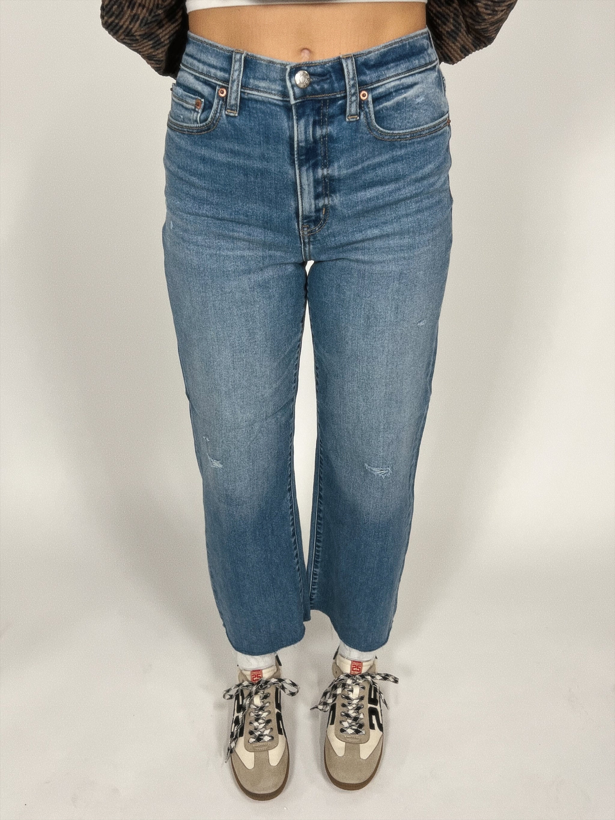 A Fringe BEST SELLING style. The Pleaser, a true high rise wide ankle, features scissor cut hems against a vintage-inspired medium wash with gentle knicks...