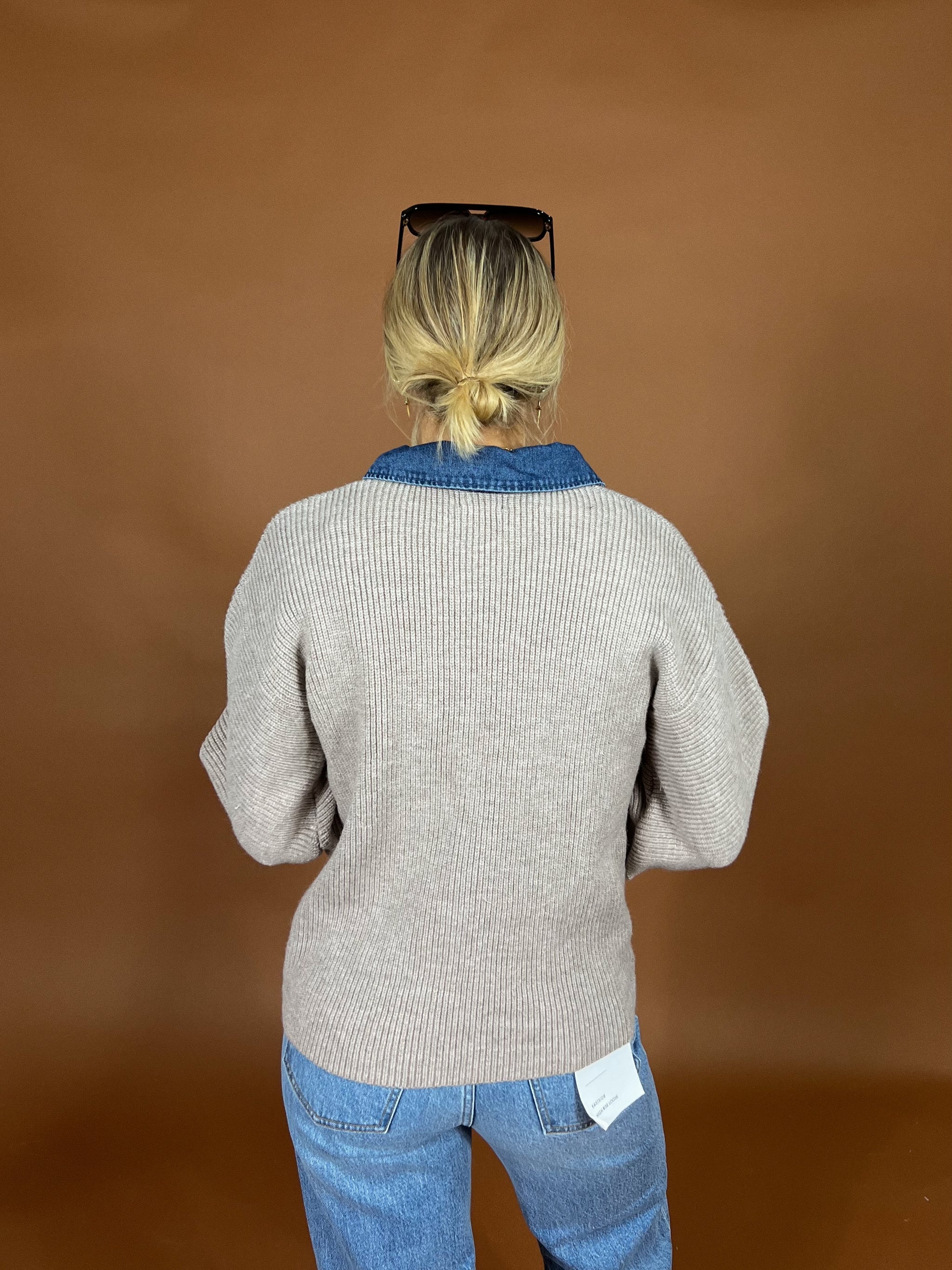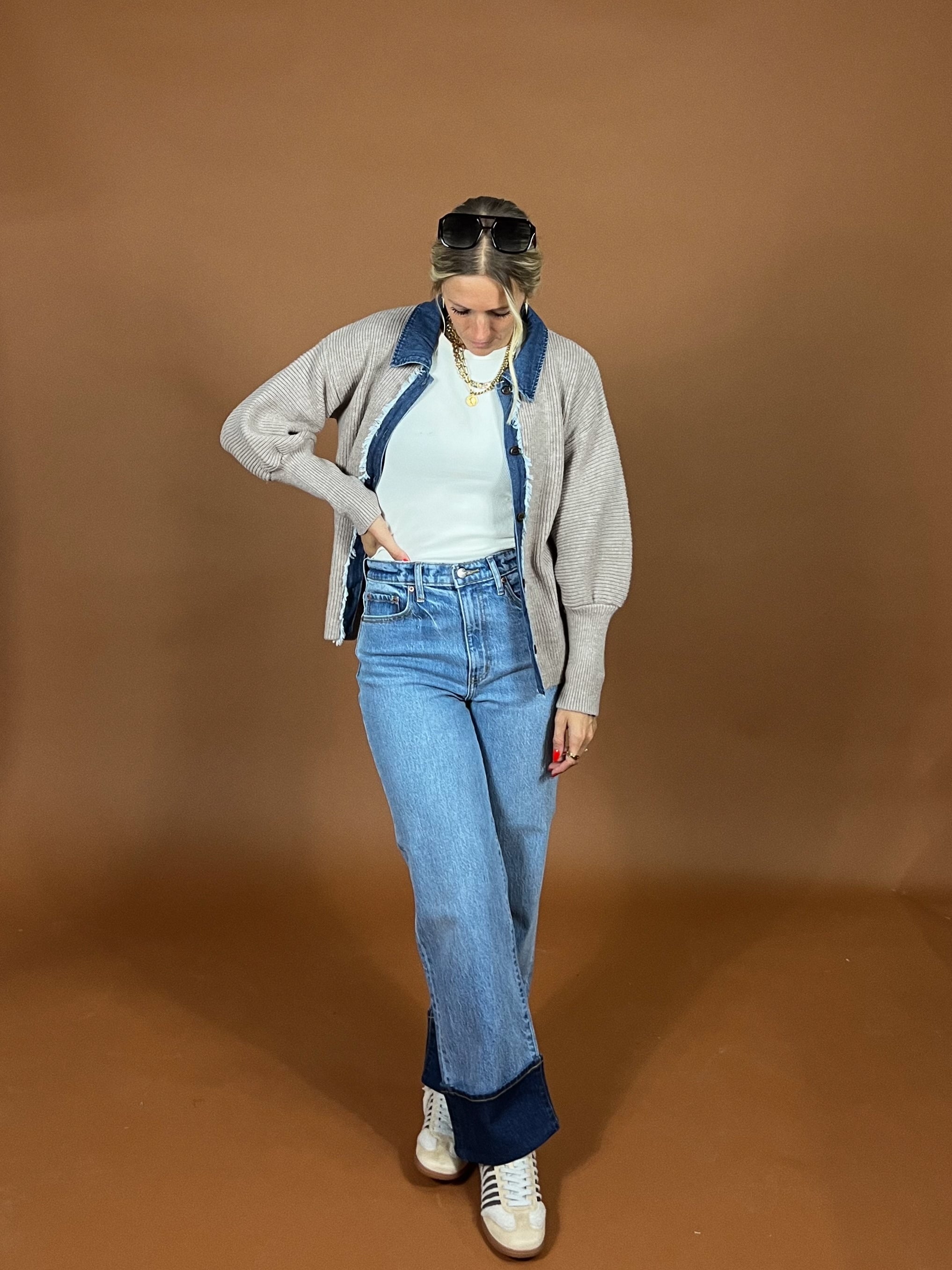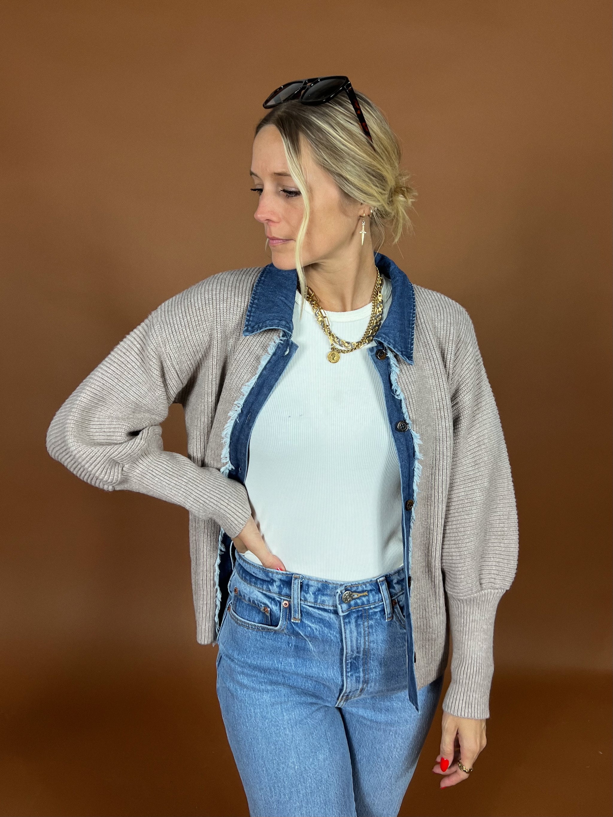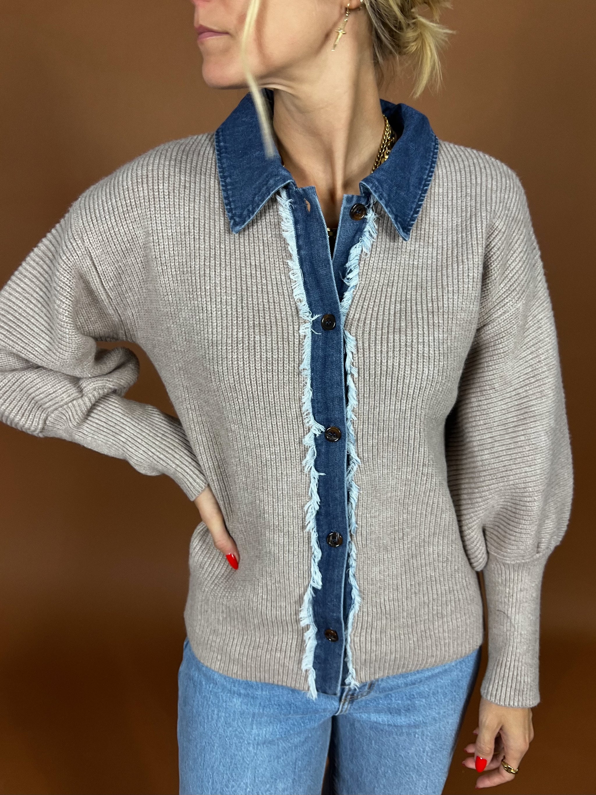 This cardigan blends a soft ribbed knit with rugged denim trim for the perfect mix of casual comfort and modern edge. With its frayed details and structured collar, it's the layering piece that takes you from busy week days to weekend coffee runs, effortlessly.