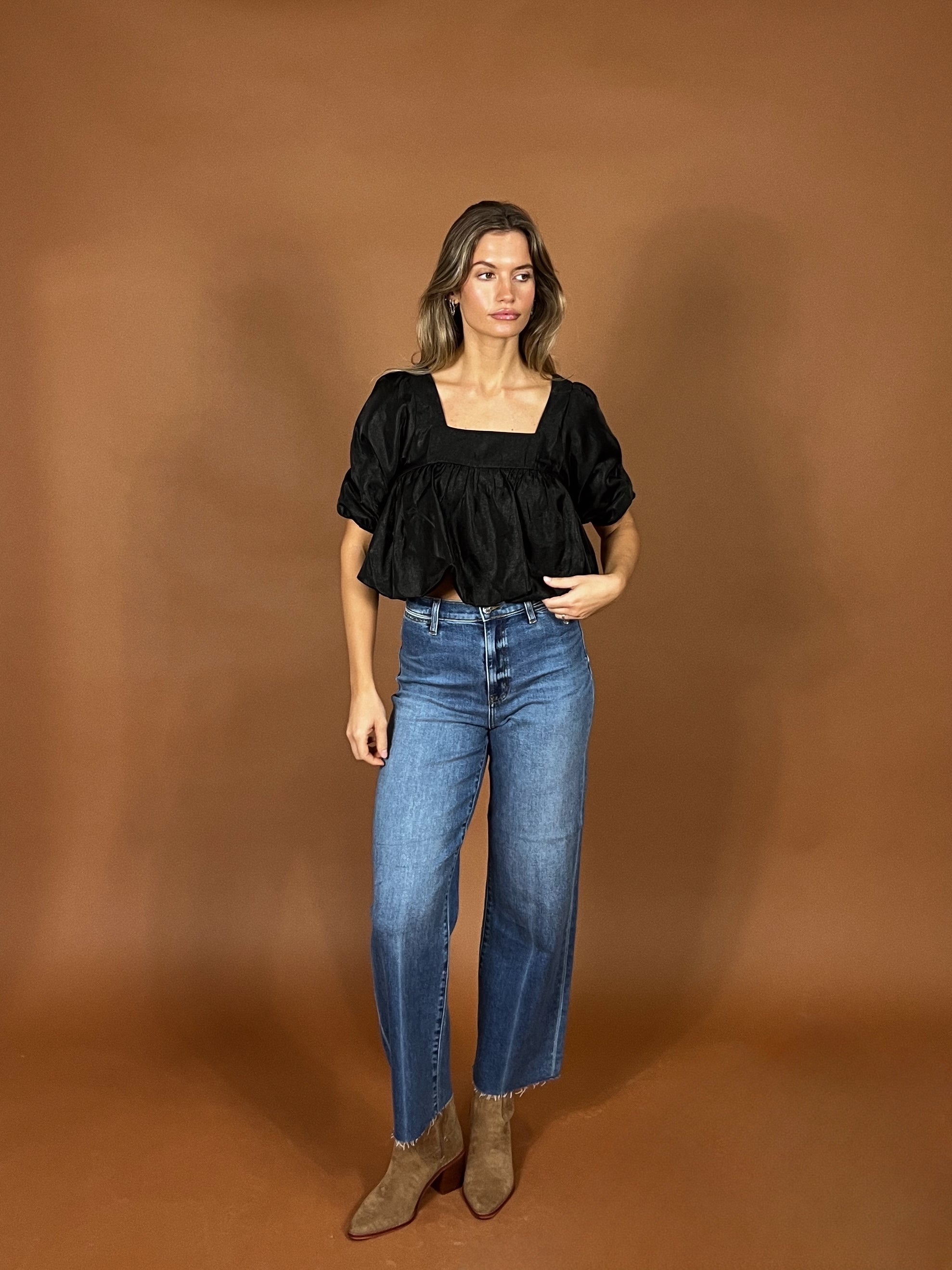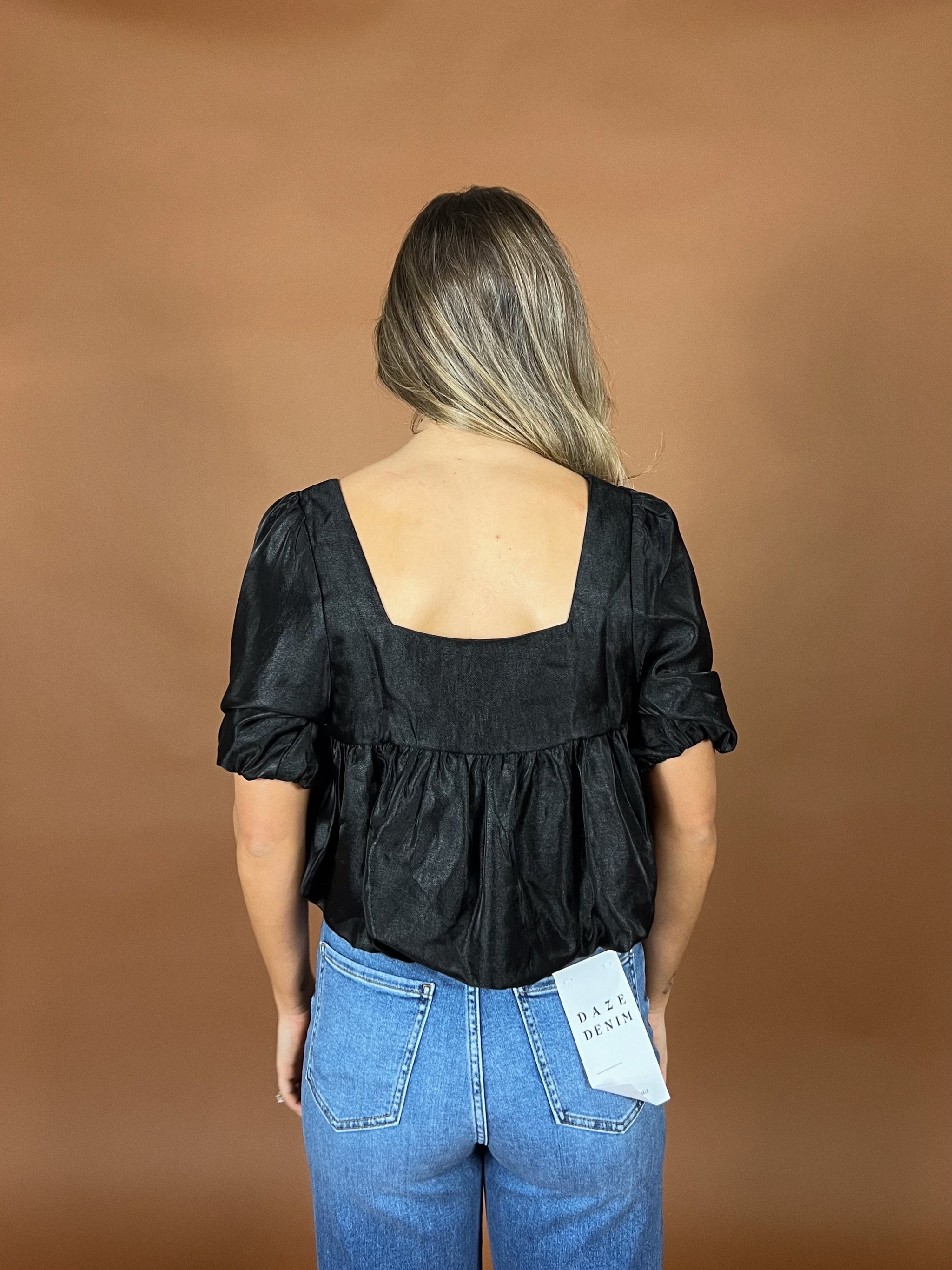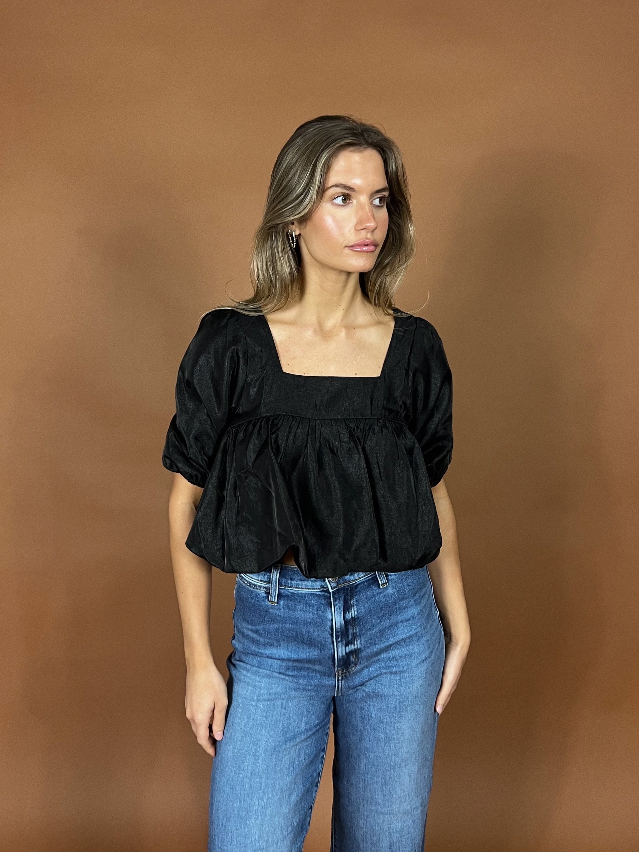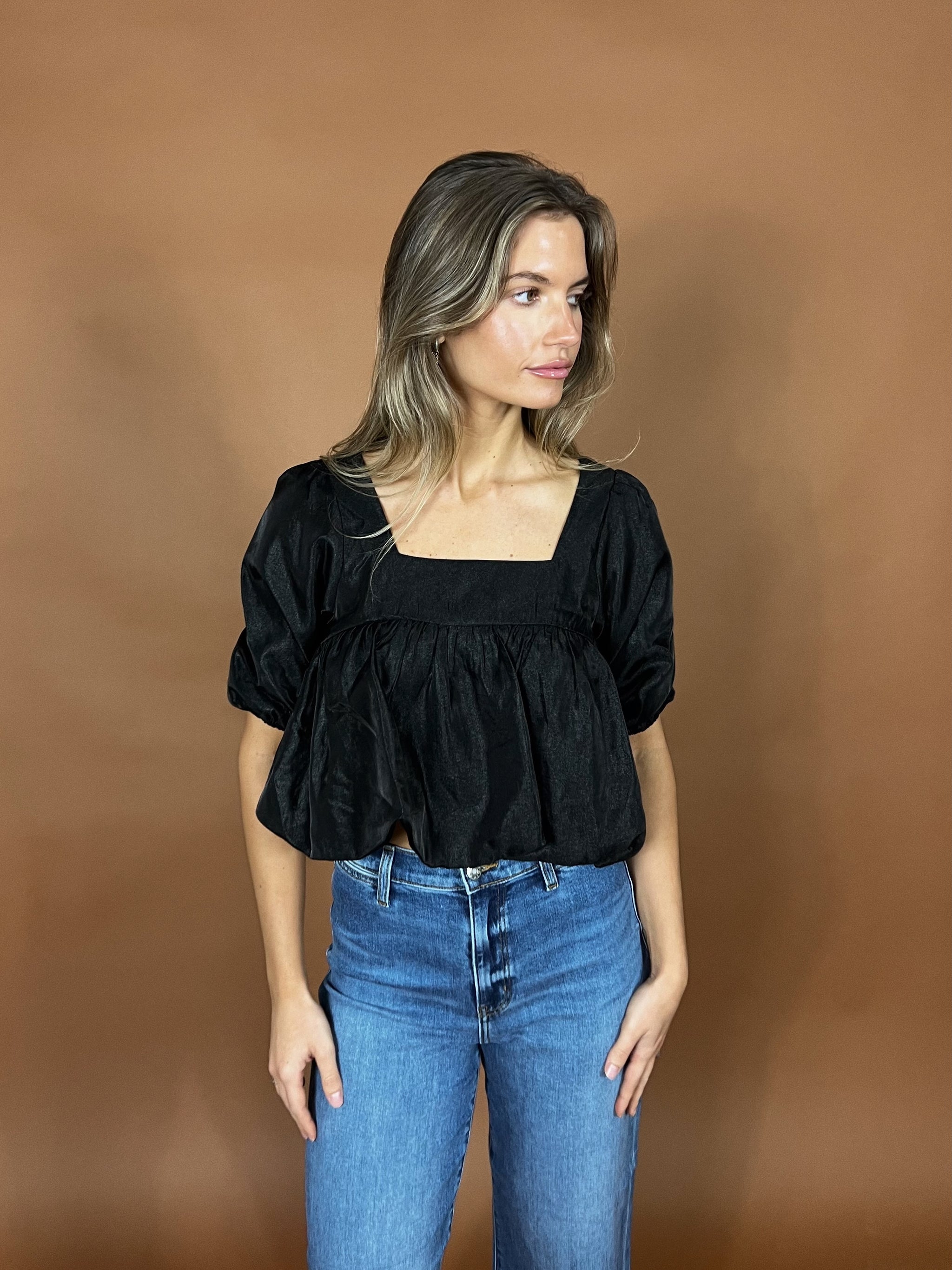 With puffed sleeves, square neckline, and bubble hem, this top brings a bold, flirty twist to a classic blouse. The silky sheen makes it dressy enough for cocktails, while the playful bubble shape keeps it cool enough for denim on game day. For an elevated, matching look pair the black Going Out Top with the Going Out Skirt.