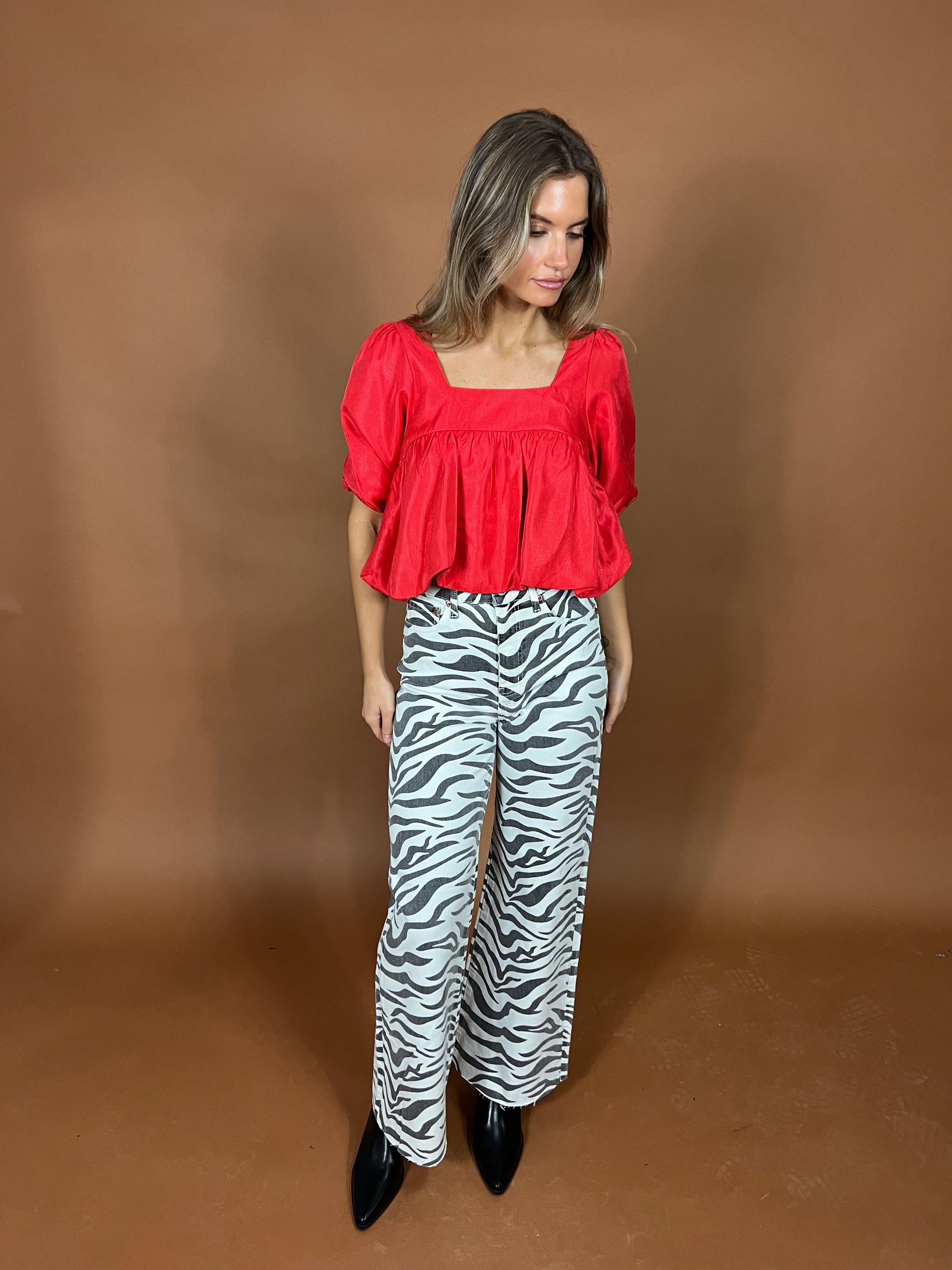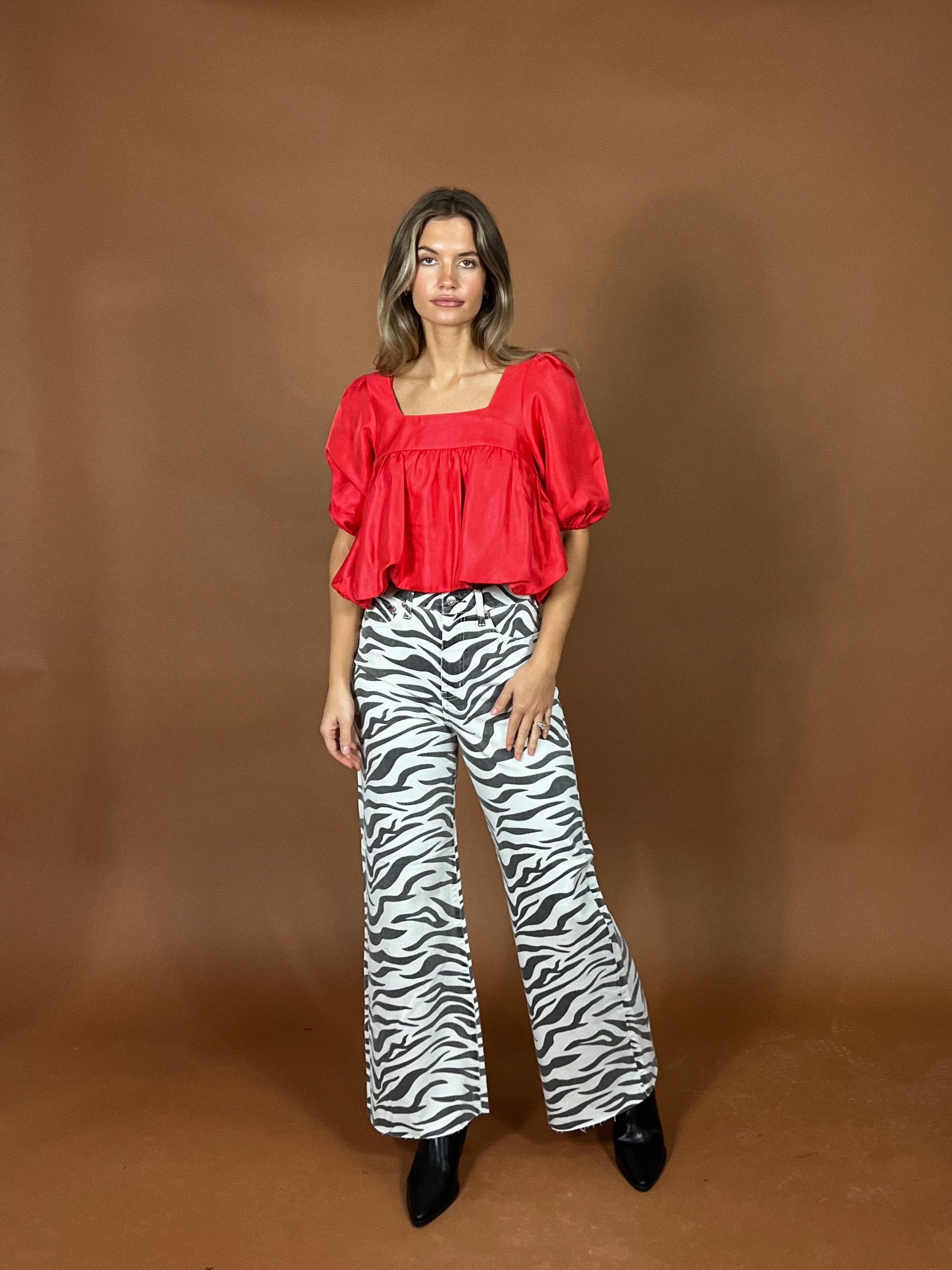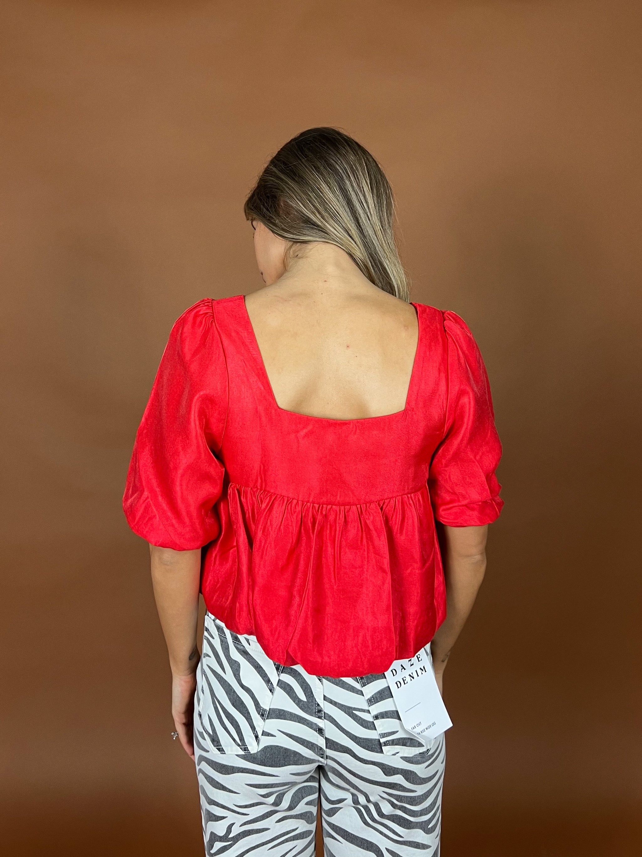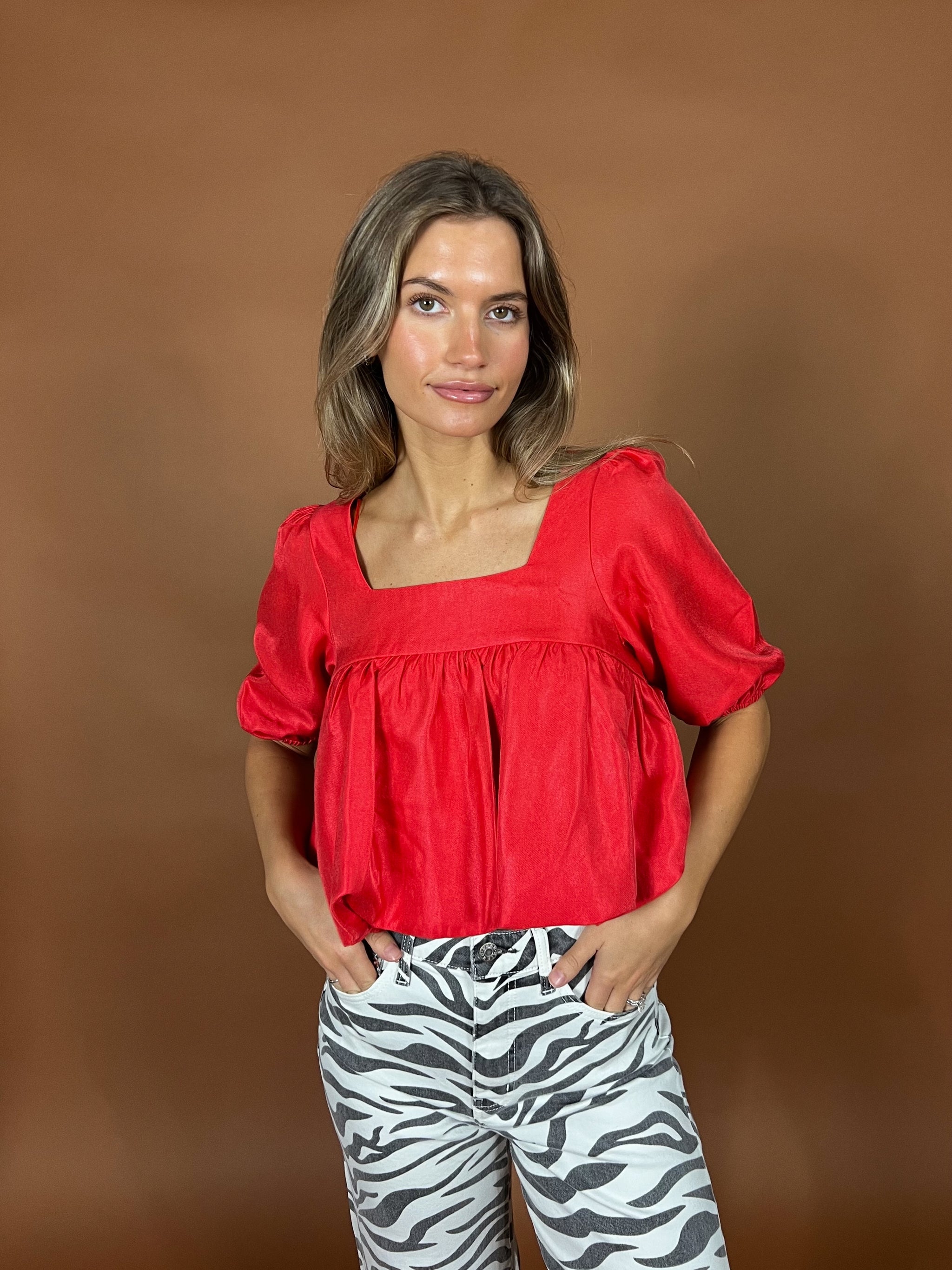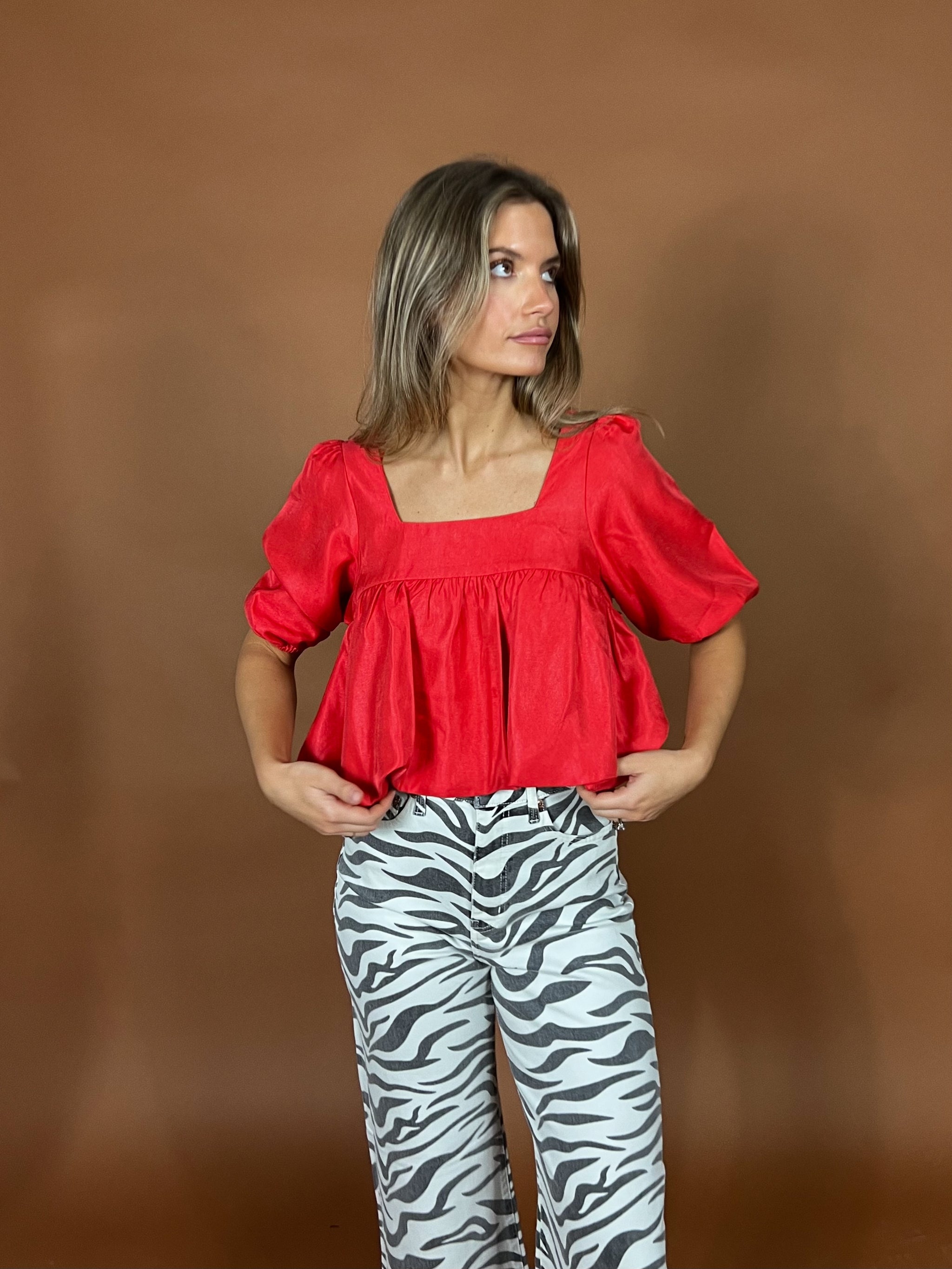 With puffed sleeves, square neckline, and bubble hem, this top brings a bold, flirty twist to a classic blouse. The silky sheen makes it dressy enough for cocktails, while the playful bubble shape keeps it cool enough for denim on game day. For an elevated, matching look pair the black Going Out Top with the Going Out Skirt.