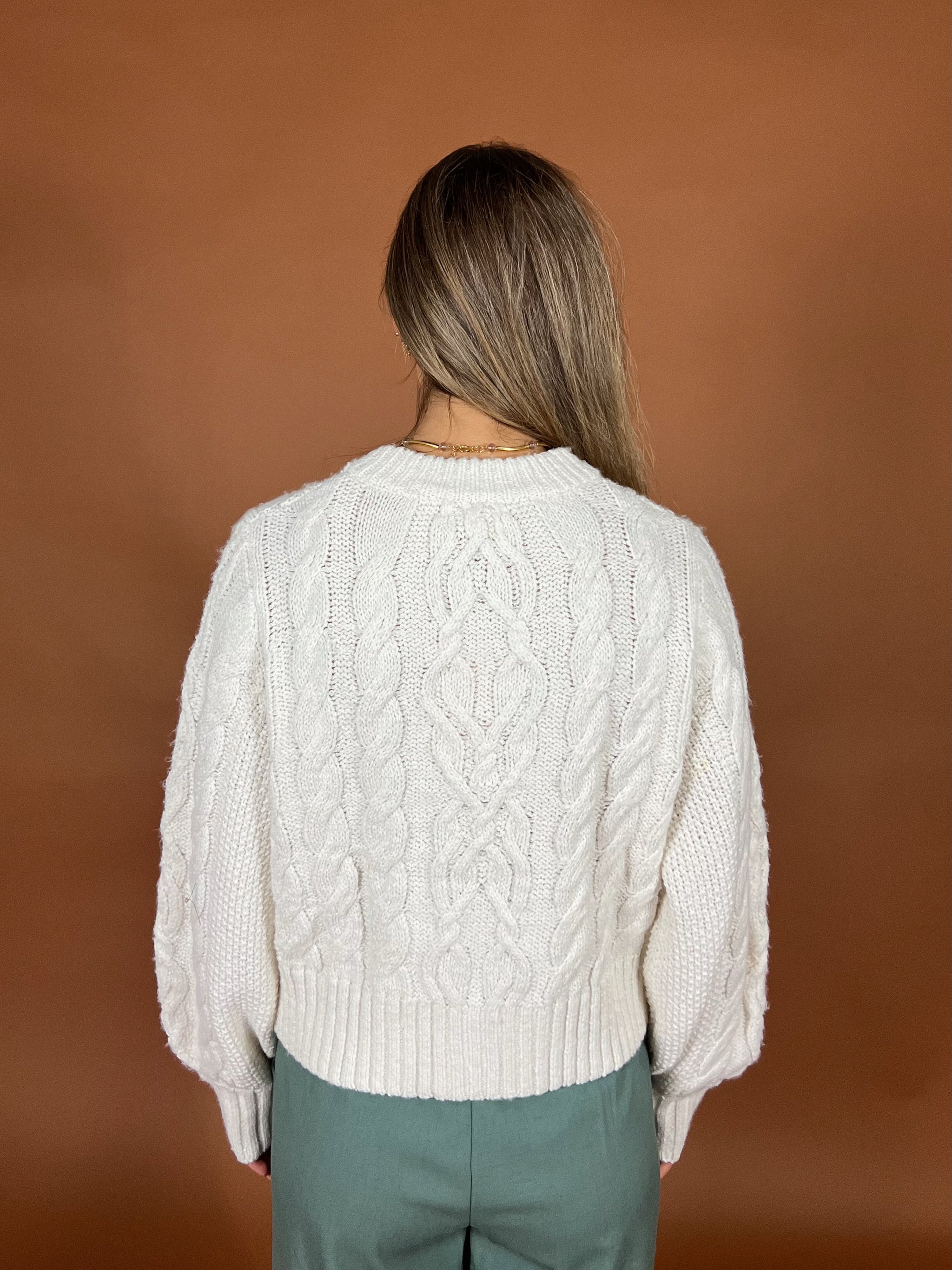 This cozy cable knit cardigan features intricate textures, gold button detailing, and a flattering fit that layers and charms. Wear it over your favorite graphic tee with leather pants for a cozy look with edge. Or pair with denim and sneakers for a full on 'it's my day off' feel.