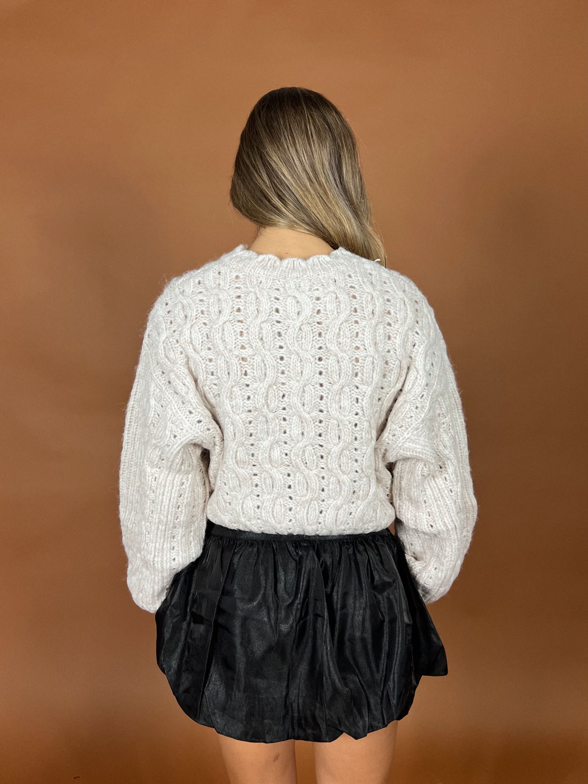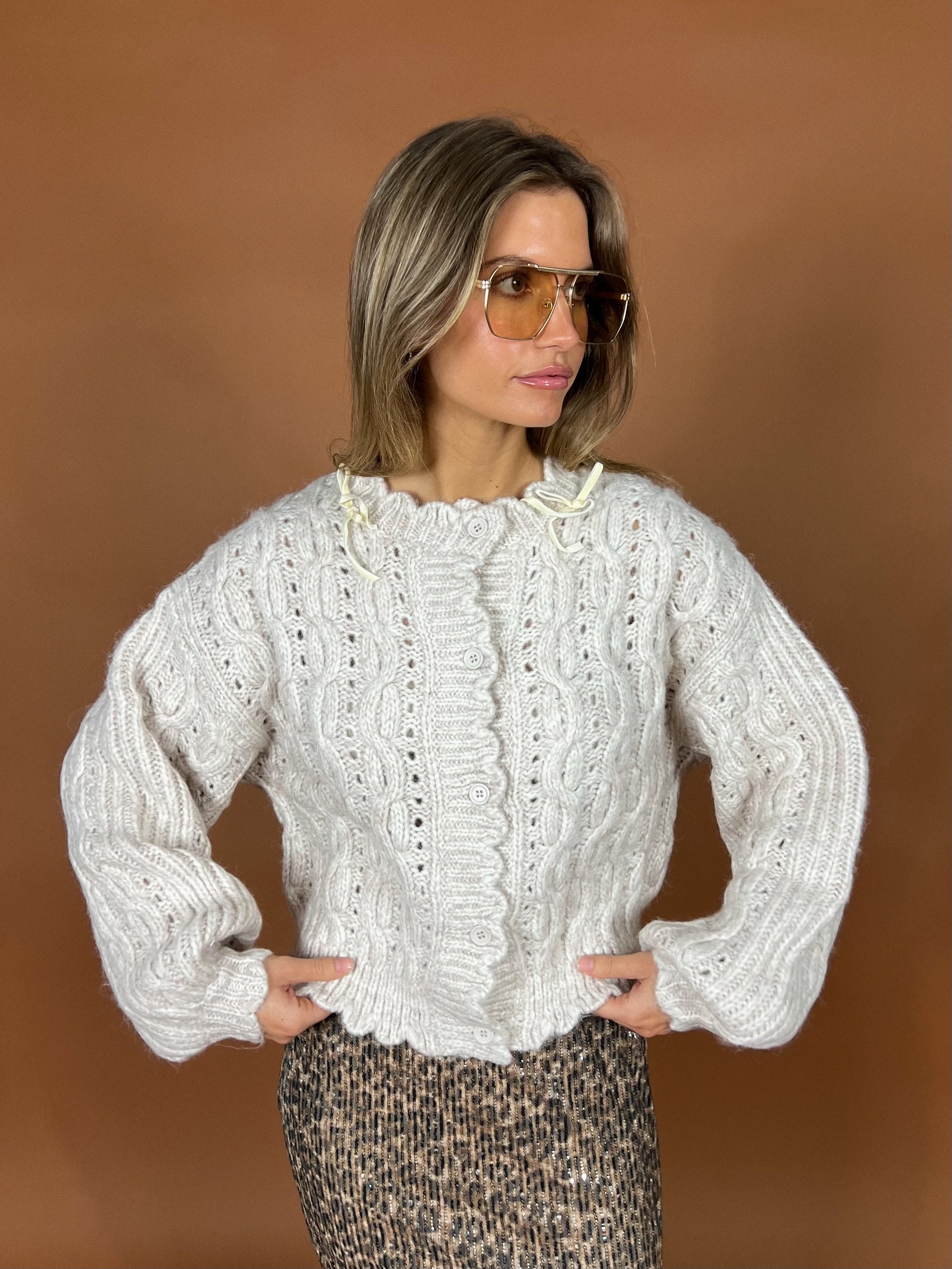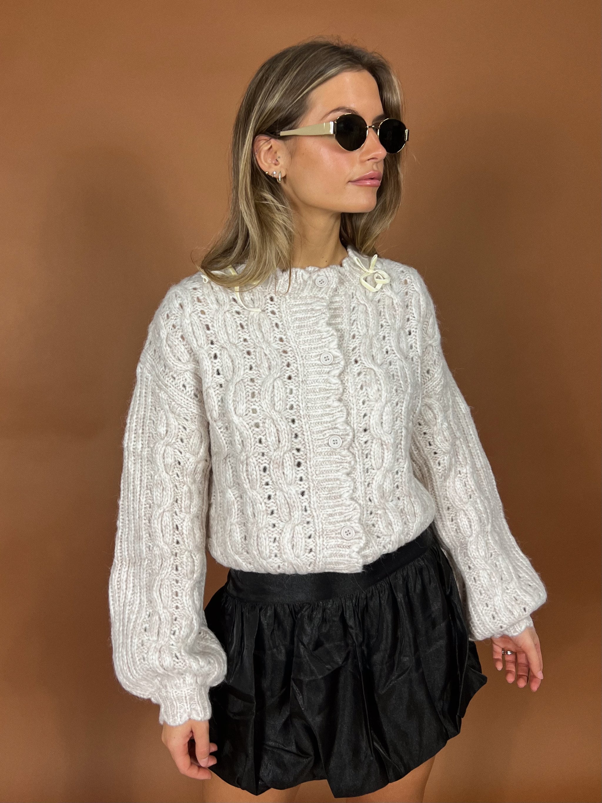 A go to cardigan for crisp mornings and coffee runs. With its chunky cable knit texture, soft neutral hue, perfectly slouchy fit, and bow detailing, this sweater does all of the talking. Dress it up with trousers or throw it on with your favorite denim for that effortless look.