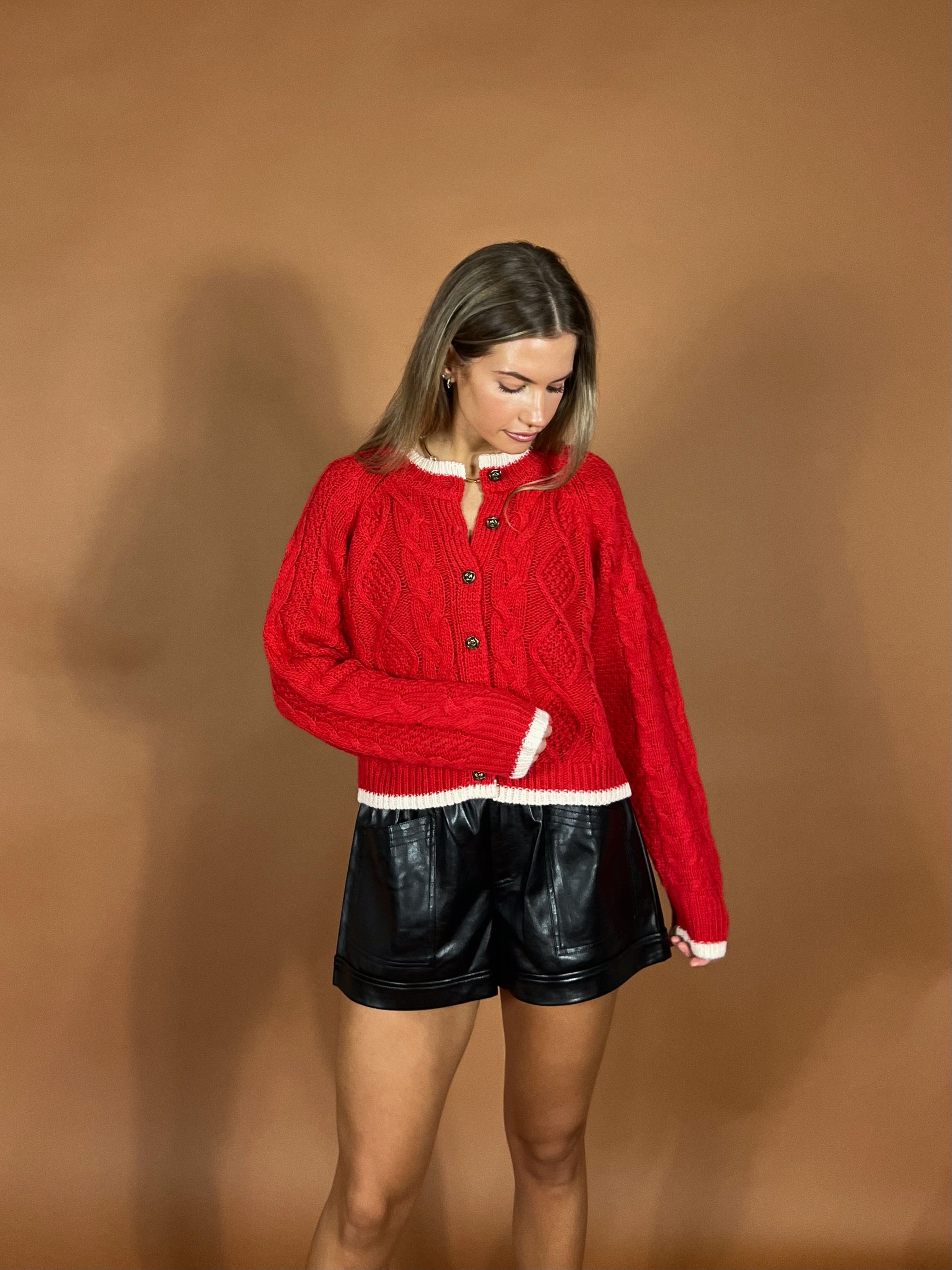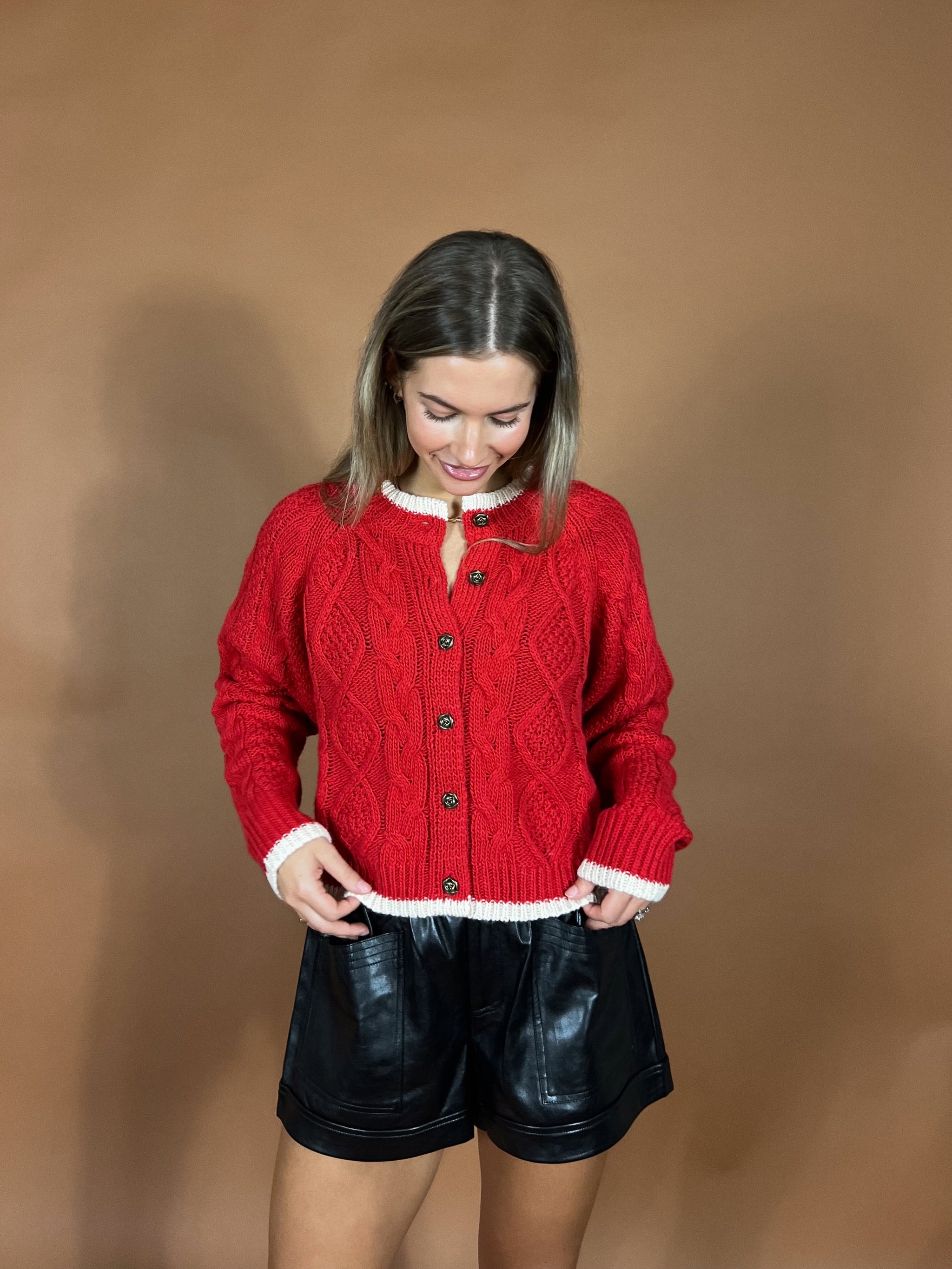 Featuring a chunky cable knit texture with contrast cream trim and brass, floral style buttons, this piece brings that perfect mix of classic and playful. It's hip length, relaxed fit pairs effortlessly with denim, leather, or even thrown of a slip dress.