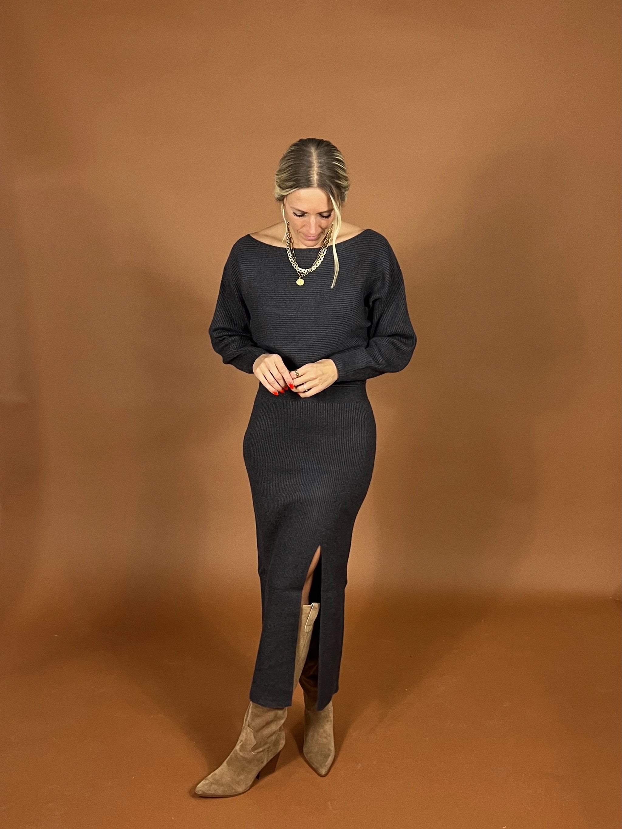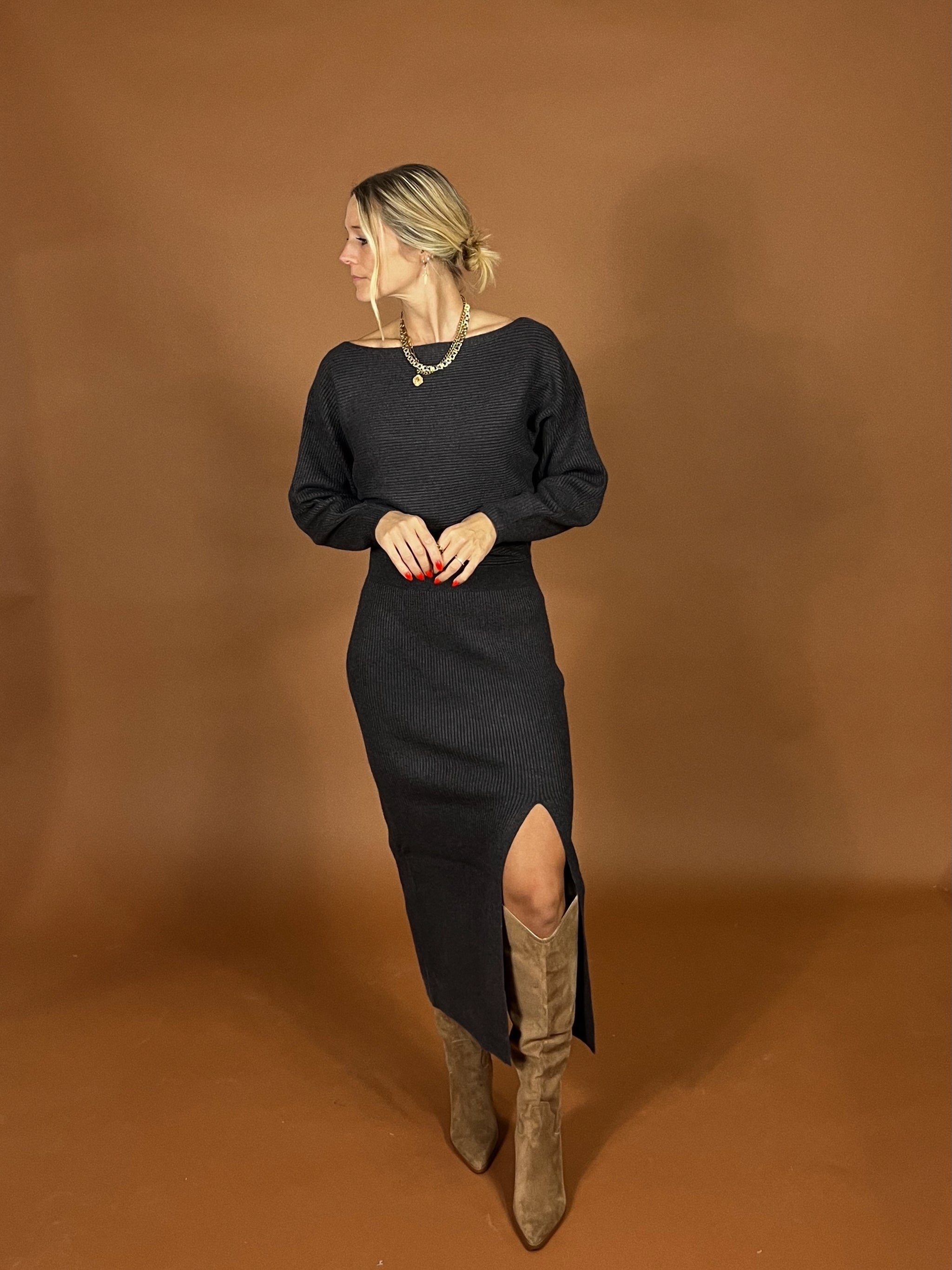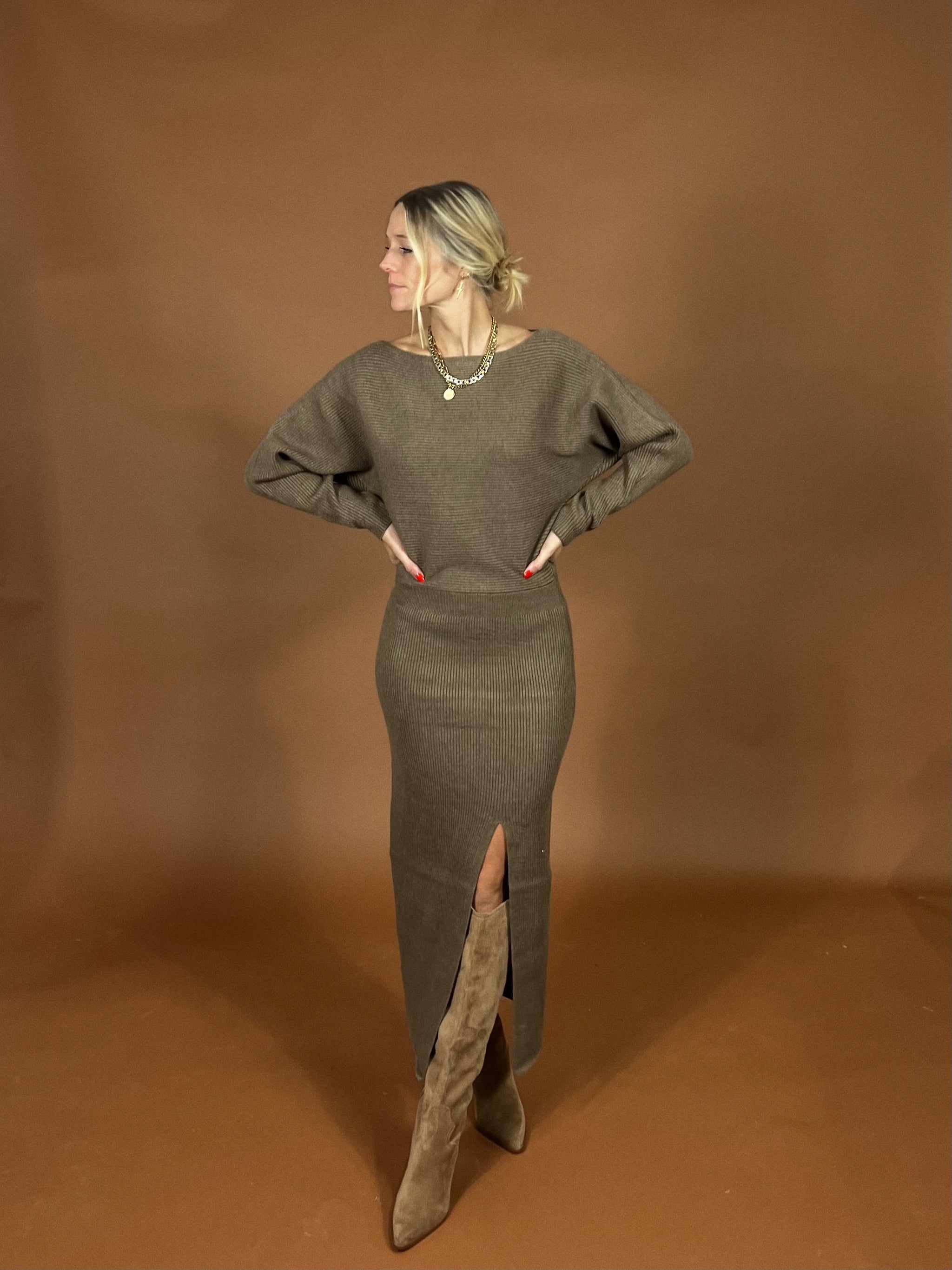 Featuring an off the shoulder neckline that drapes just right, ribbed knit texture, and a sultry side slit, this midi dress is equal parts chic and laid back. The warm whiskey hue makes it a fall wardrobe essential -- pair with loafers for a cool girl touch boots for a night out.
