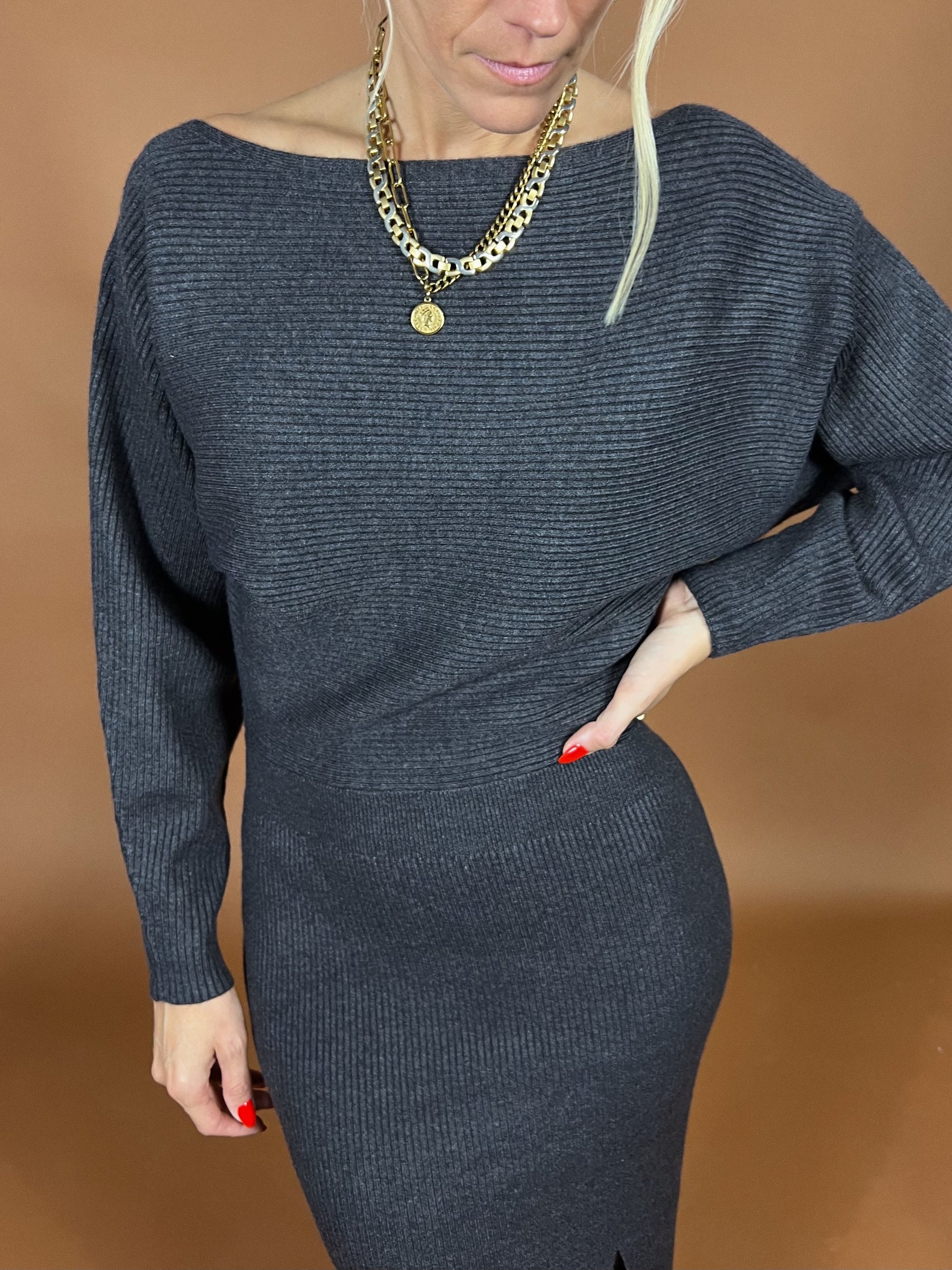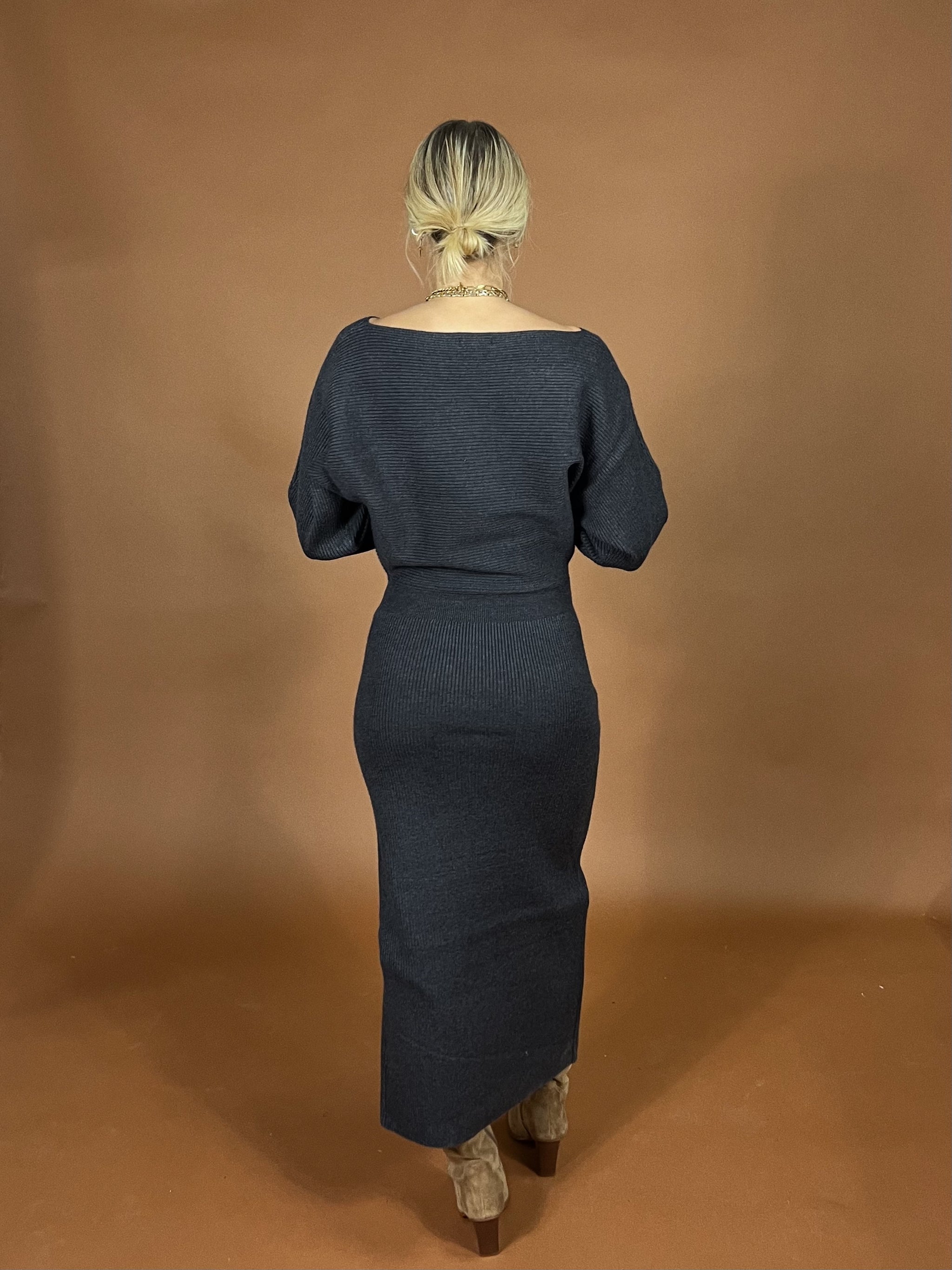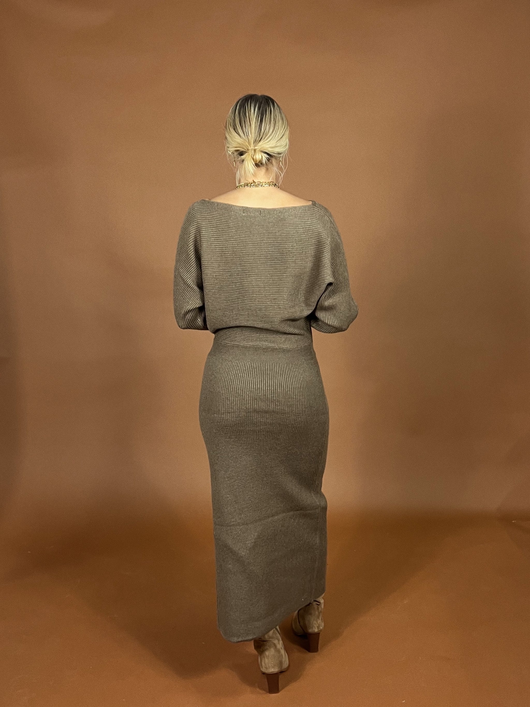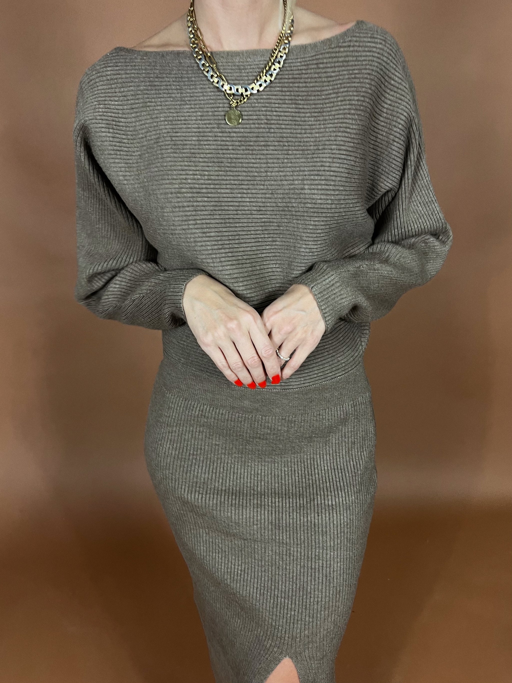 Featuring an off the shoulder neckline that drapes just right, ribbed knit texture, and a sultry side slit, this midi dress is equal parts chic and laid back. The warm whiskey hue makes it a fall wardrobe essential -- pair with loafers for a cool girl touch boots for a night out.