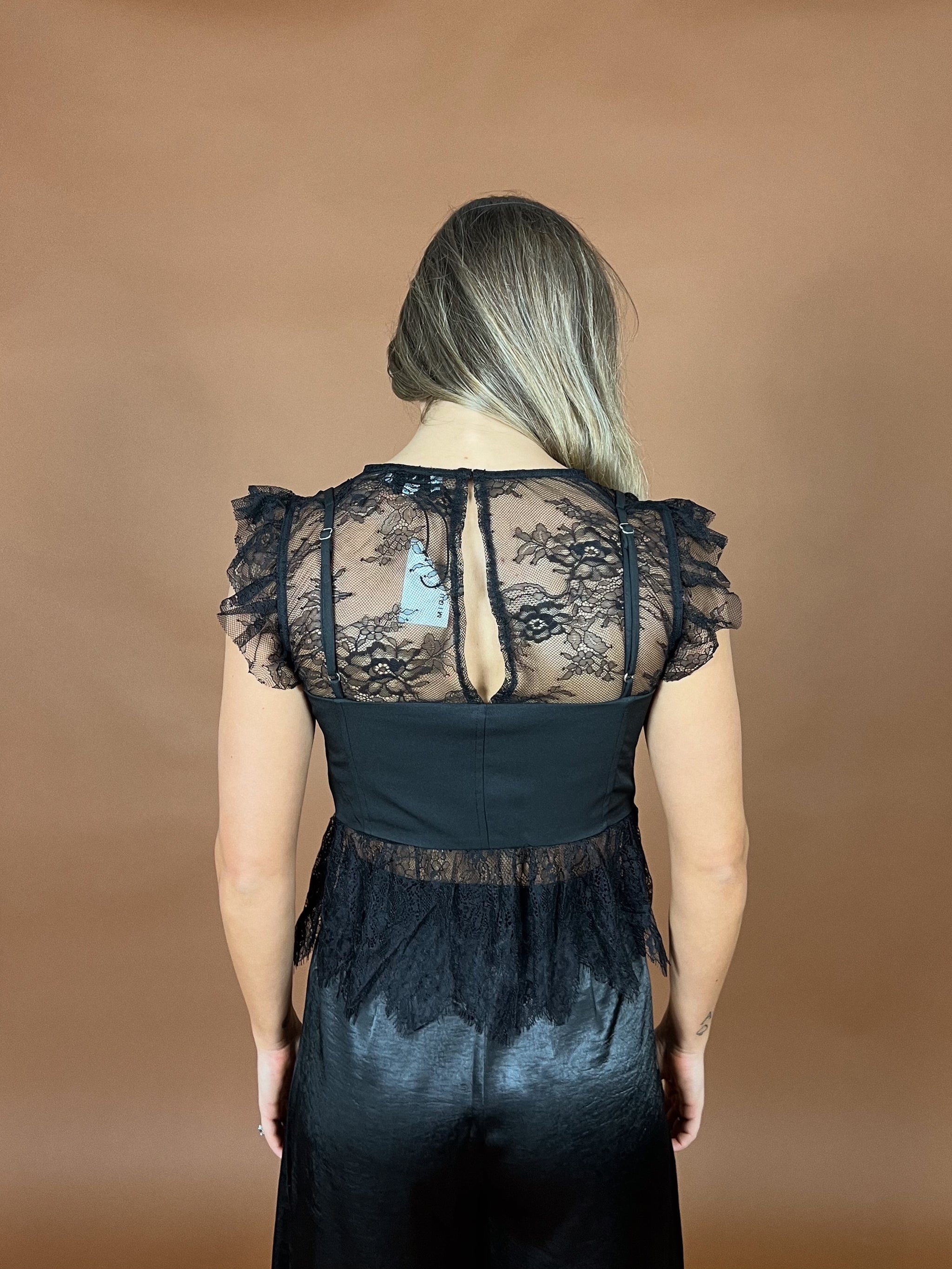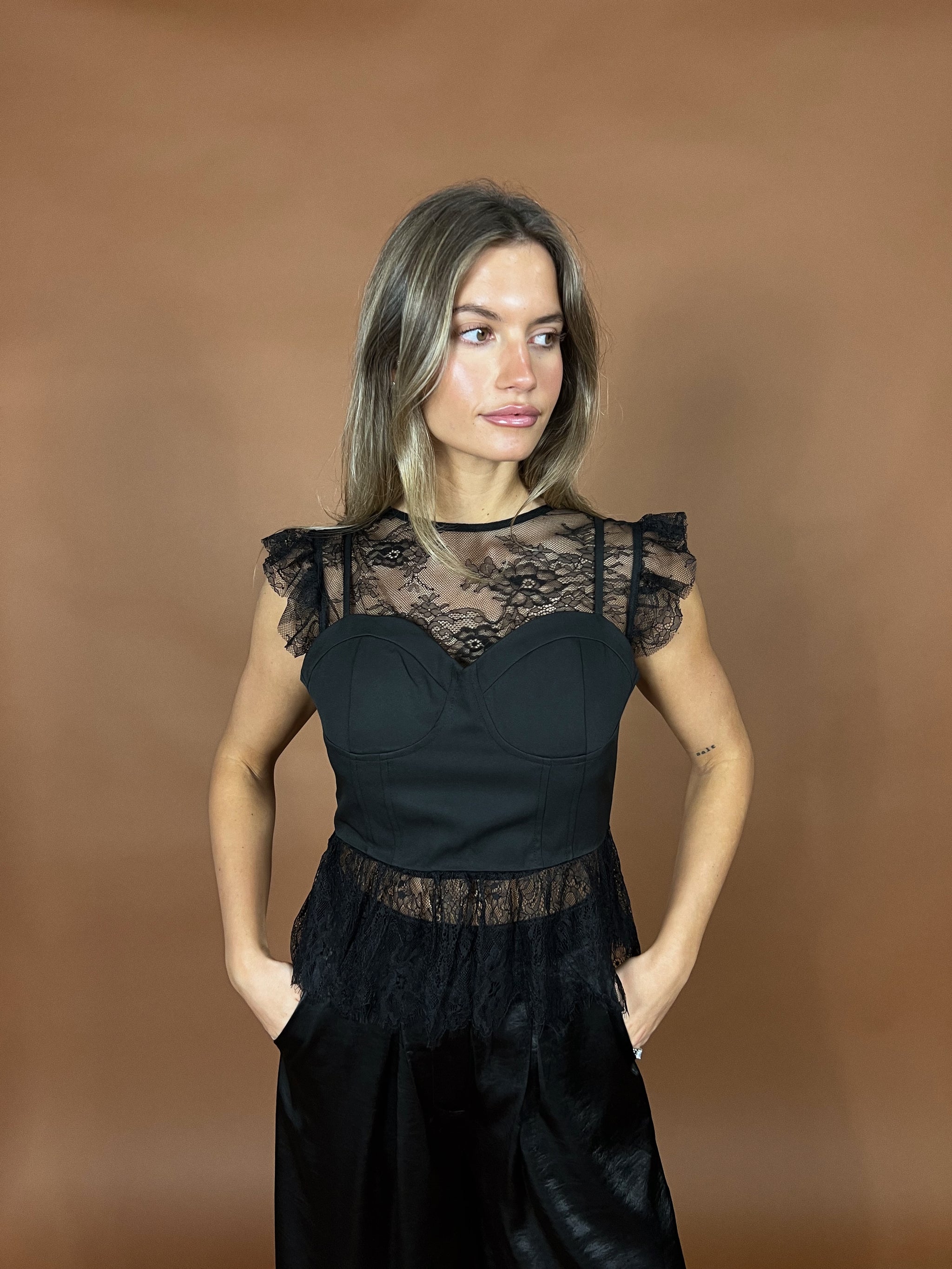 Black tie optional, but this top isn't. Featuring a structured satin style bodice and a delicate lace overlay that adds instant drama. The sheet lace...