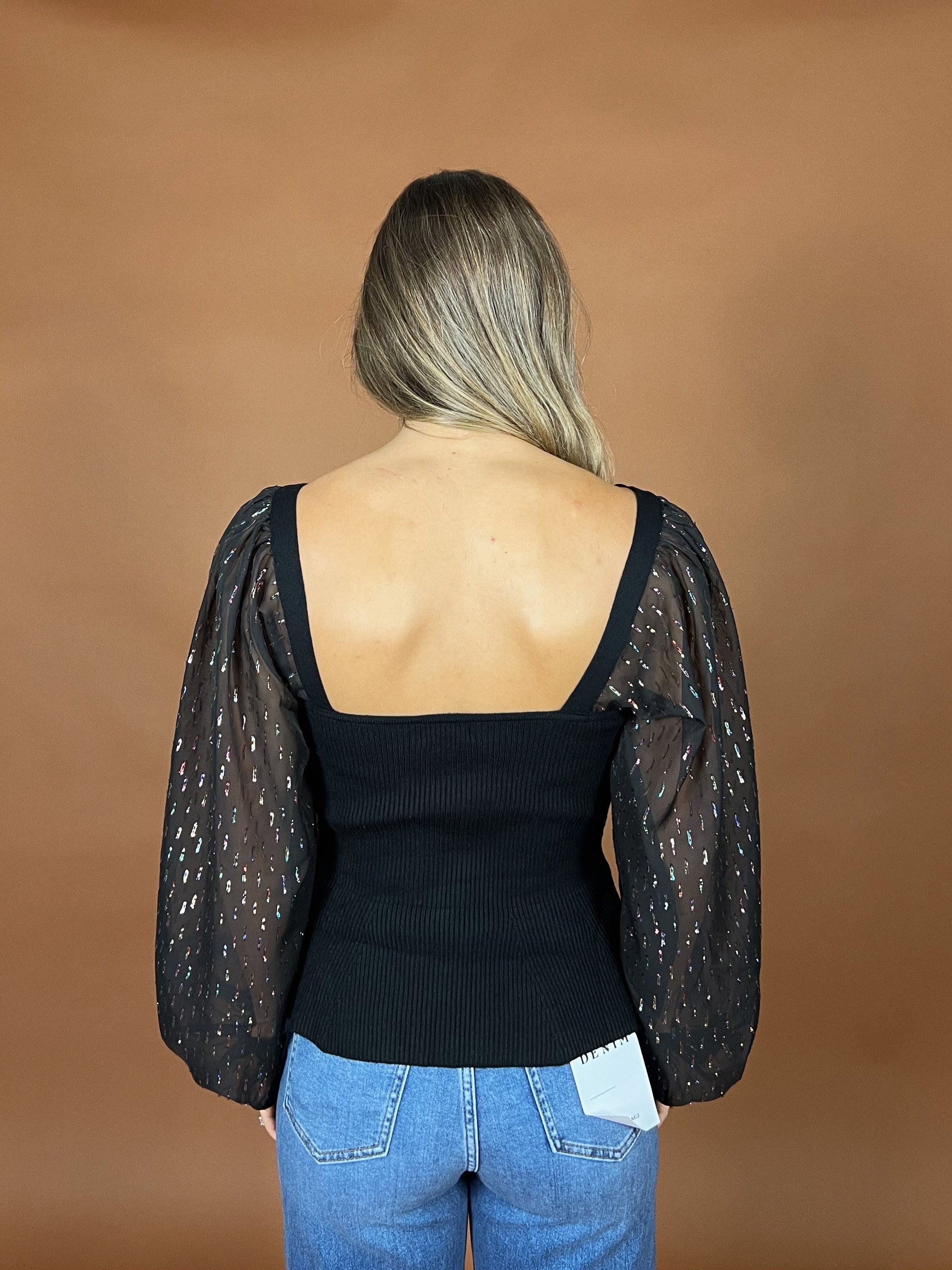 Cozy and totally captivating. This dreamy knit top features a fitted ribbed bodice and a soft sweetheart neckline, balanced by sheer, billowy sleeves threaded with...