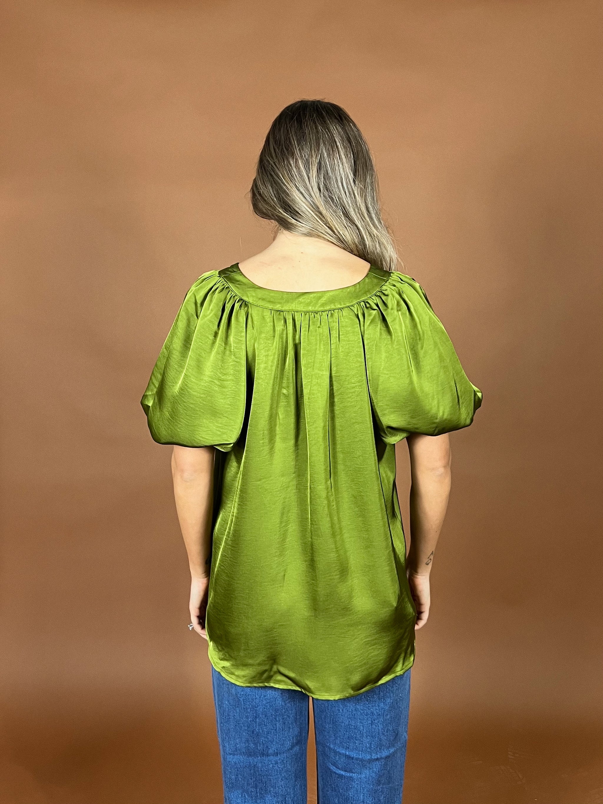 Sleek. Simple. Versatile. Bring an effortless edge to any outfit with this relaxed fit, glossy olive satin top. Features a soft round neck, and rolled...