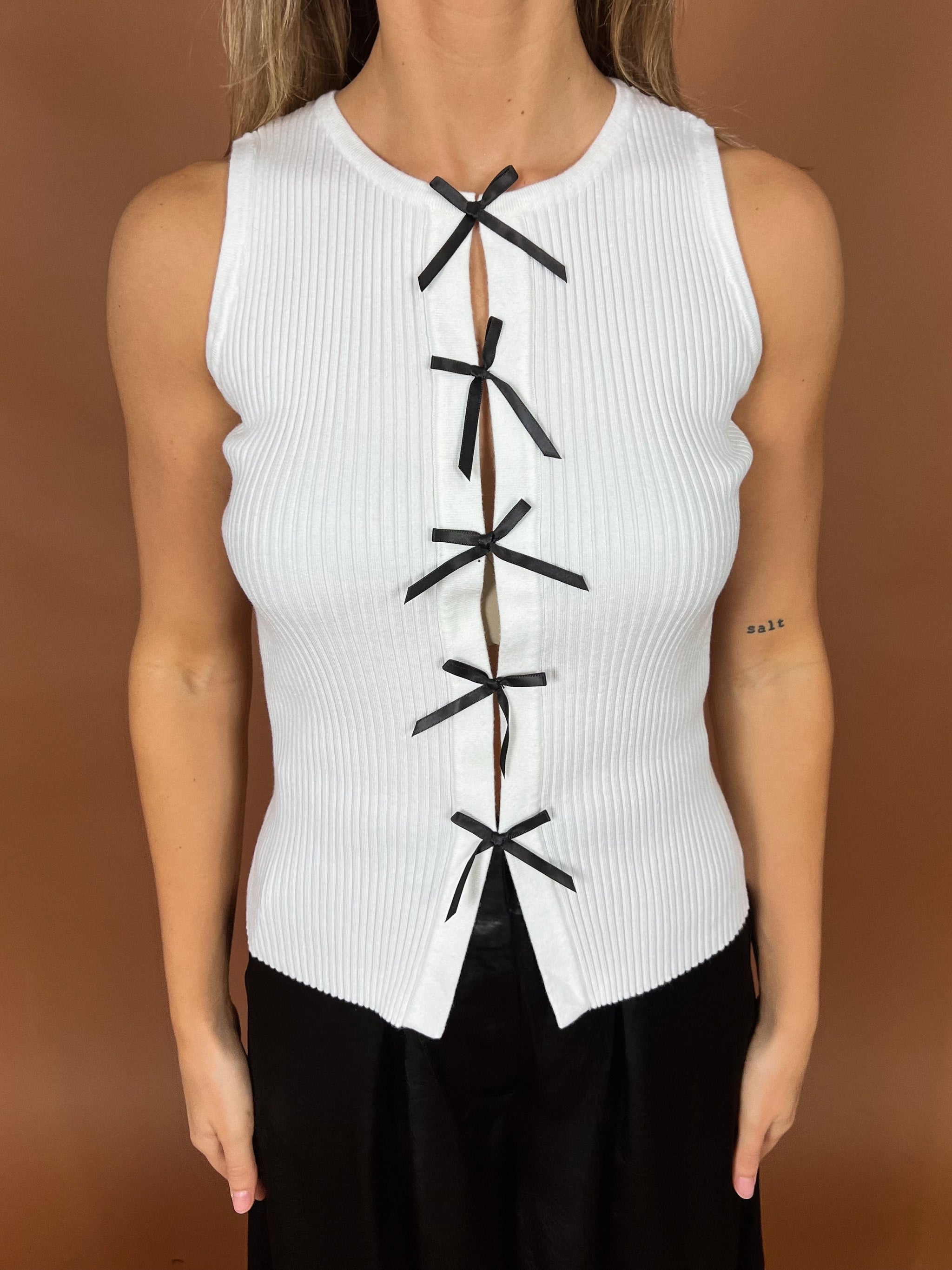 Meet your new it-girl: Luna. This sleek knit tank features a body-hugging ribbed texture with delicate bows down the front for a subtle statement. The...