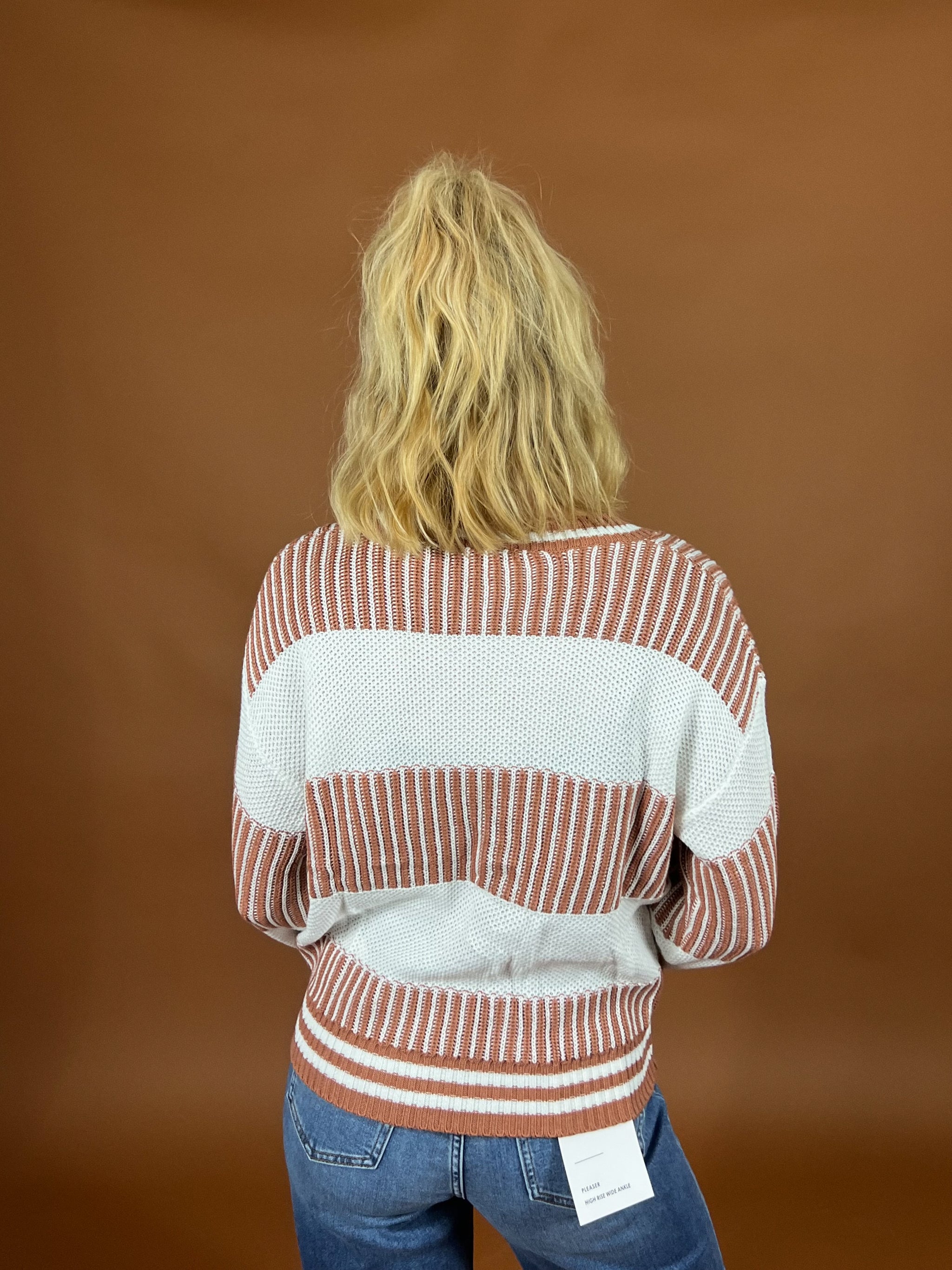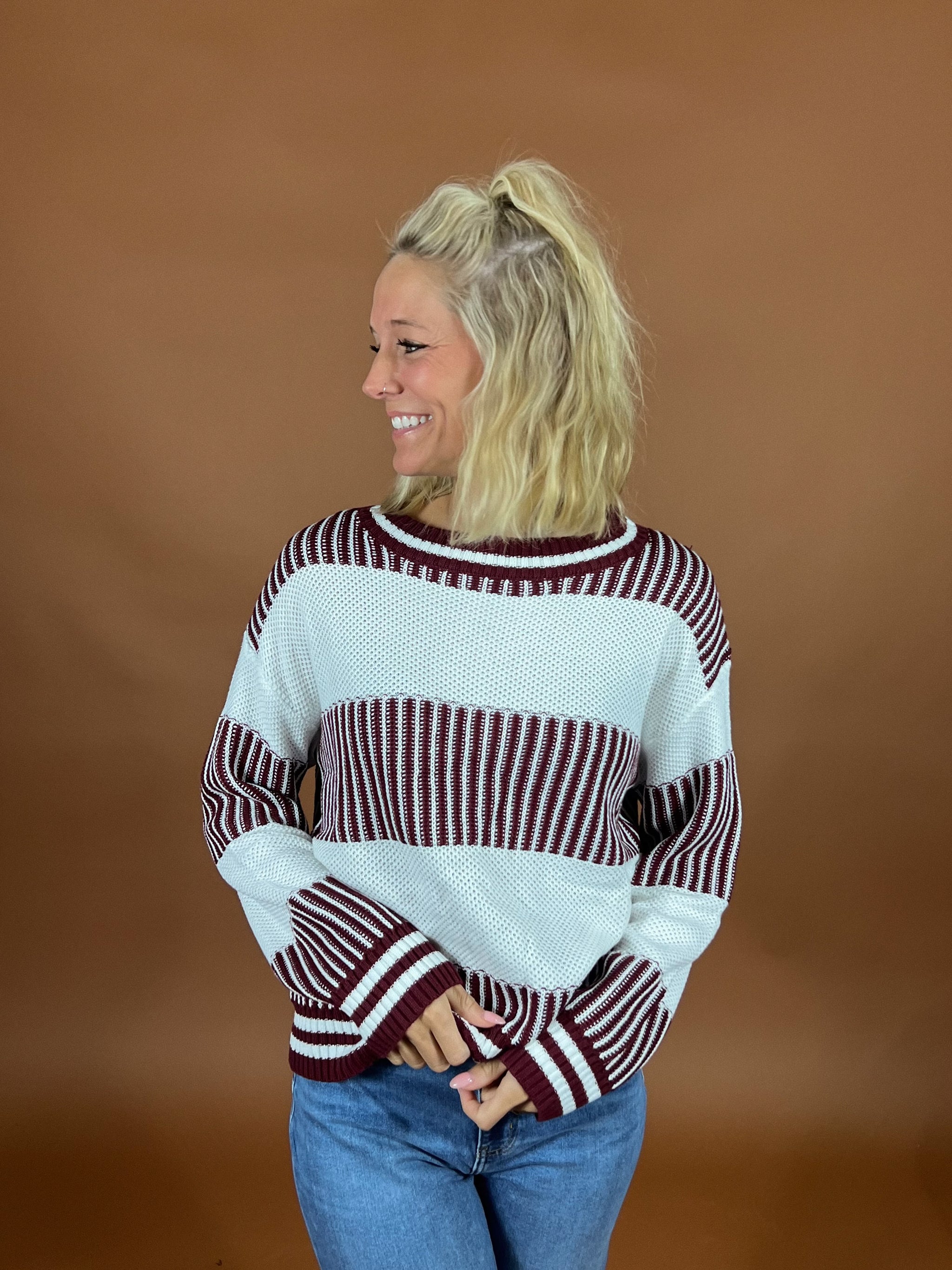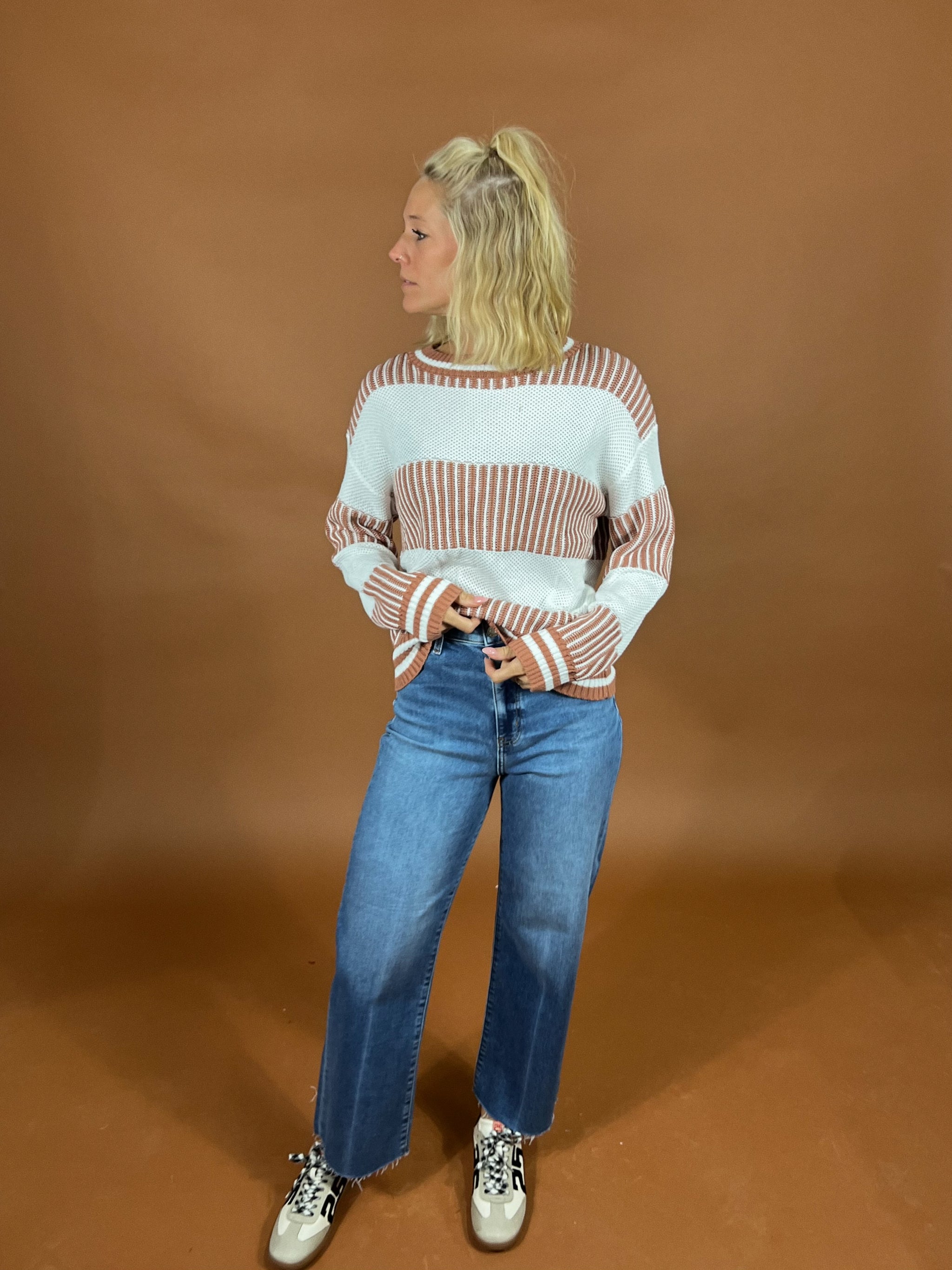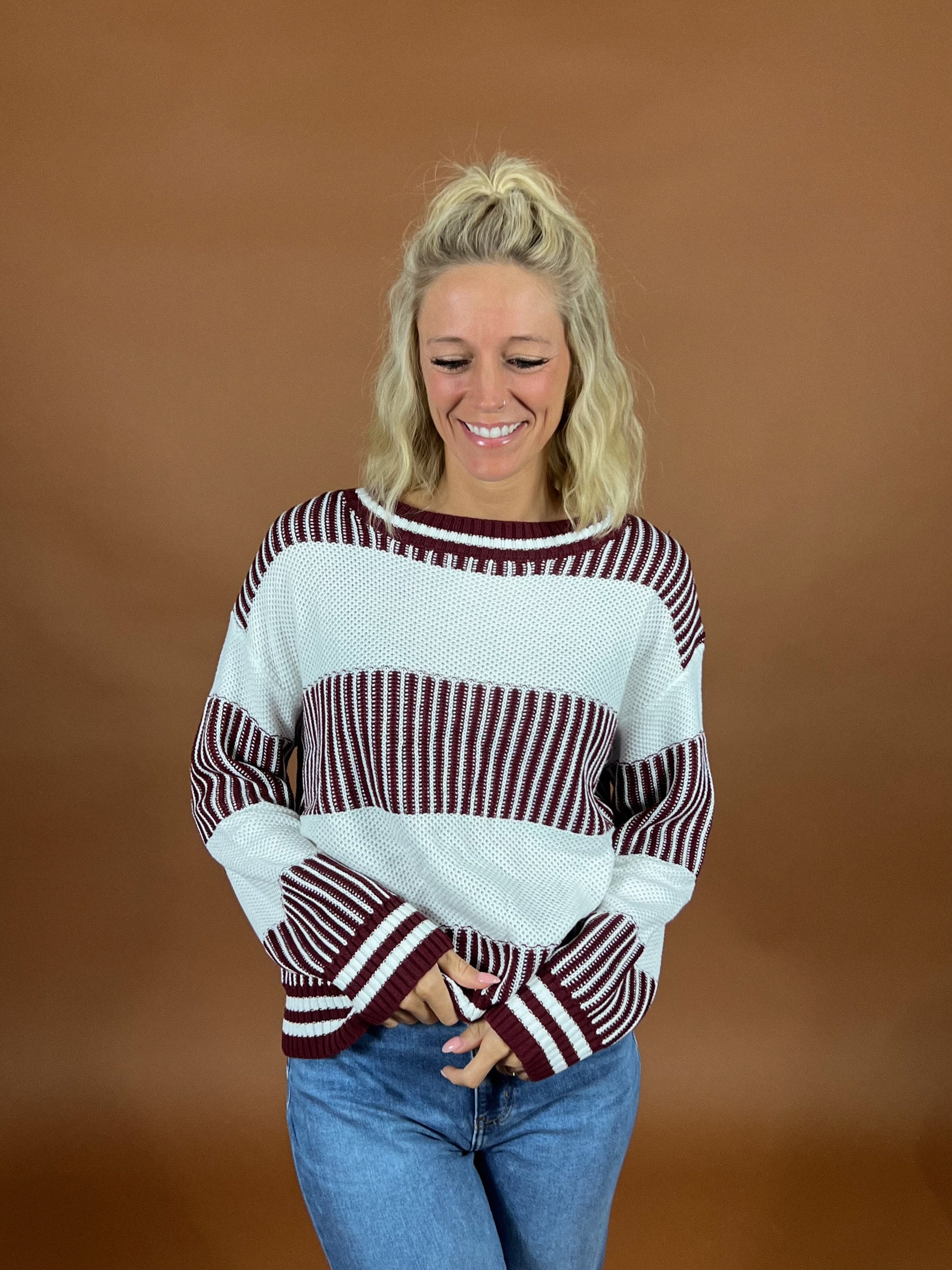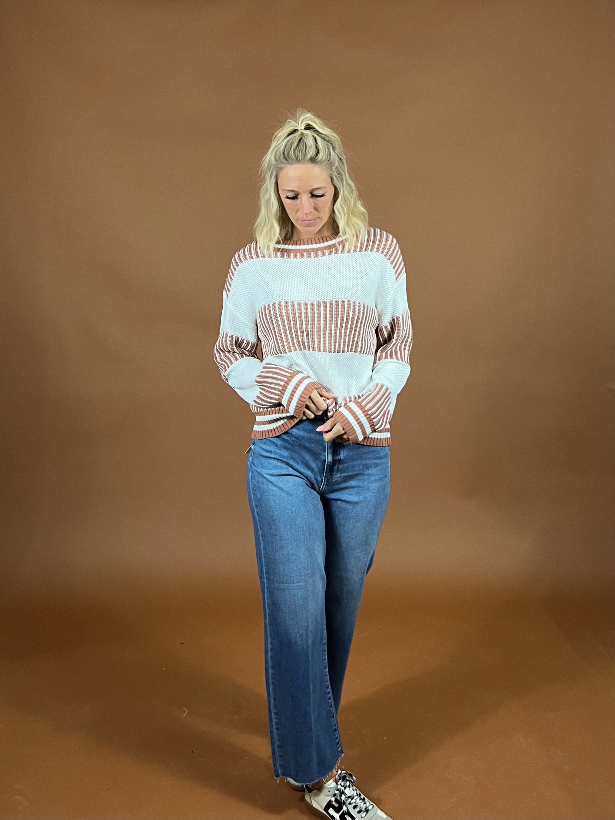 A chunky, color-block striped knit with major personality—think cozy comfort meets playful edge. Designed with extra-wide sleeves, a relaxed fit, and a textured stripe pattern, it brings that effortless “I just threw this on and still look amazing” energy. Pair it with denim, leggings, joggers—literally anything—and you’ve got an instant outfit.