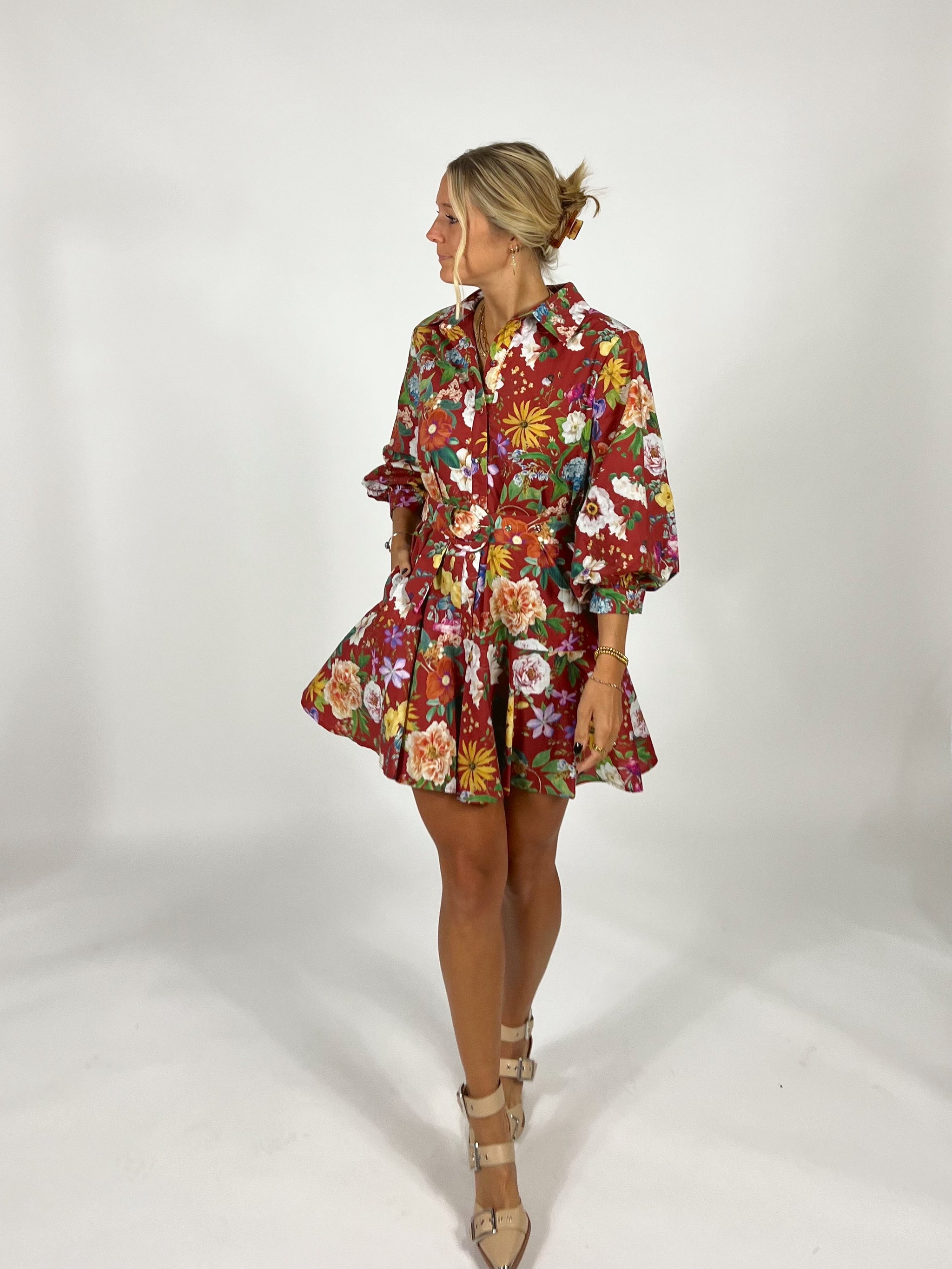 A embroidered-esc floral printed dress with contrast stitching along the neckline. A dropped waist for an flowy and breathable fit with a hidden zipper closure...
