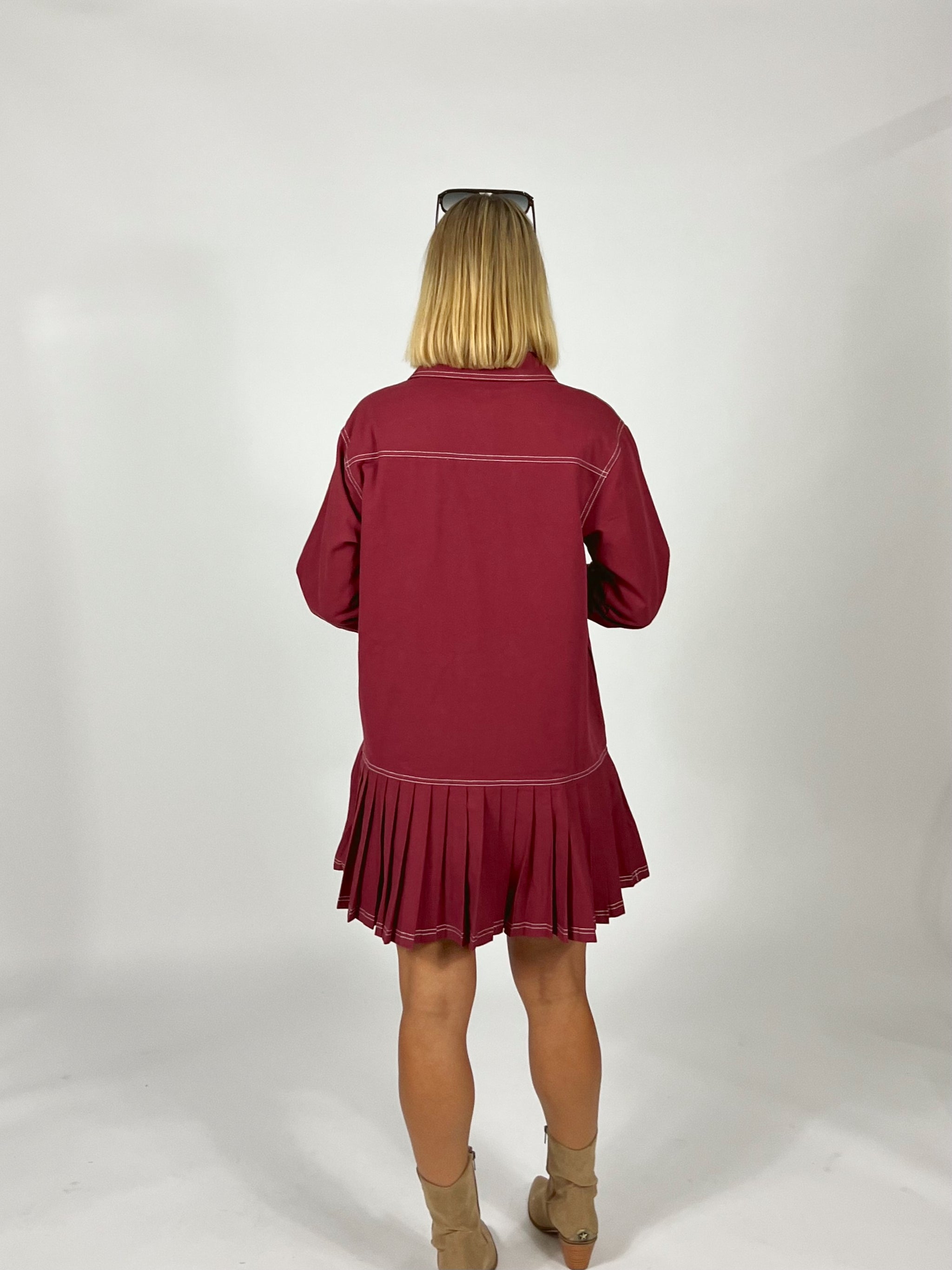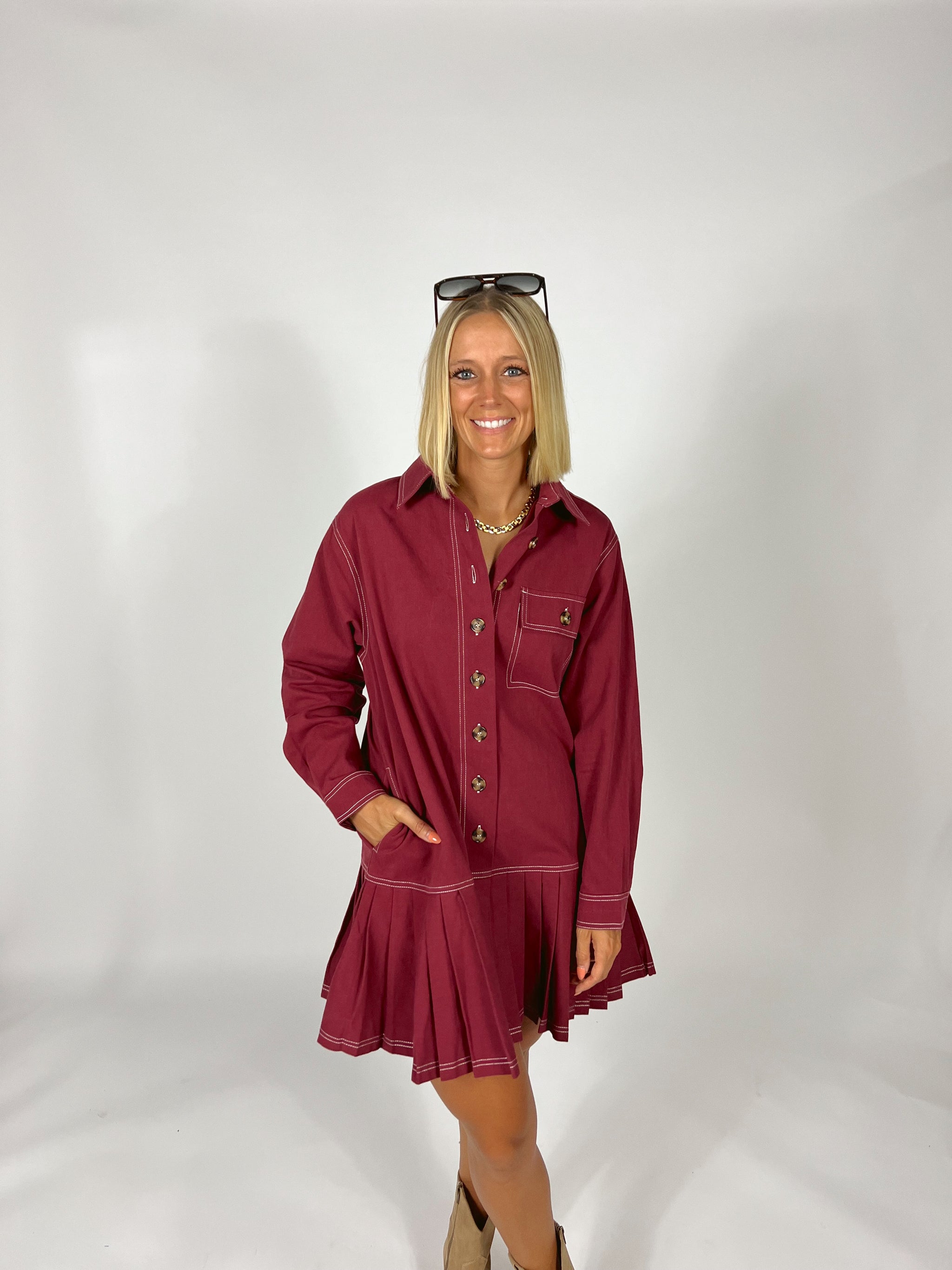 Pleat your case. A rich crimson hue, bold contrast stitching, and pleated hem, take a classic form in this dress. The structured silhouette and button...