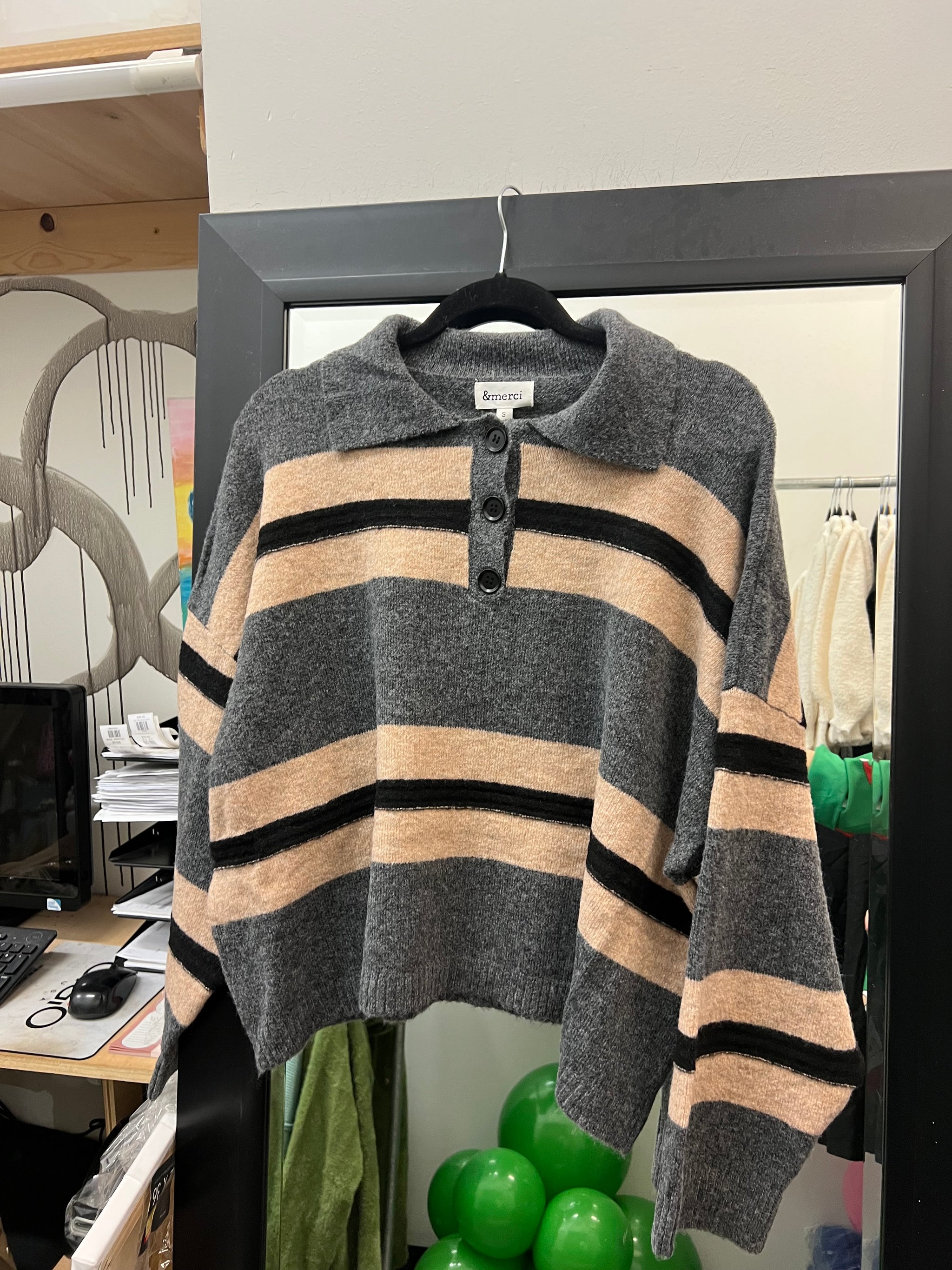 Smart, slouchy, and perfectly undone. Featuring bold neutral stripes and a relaxed button up, collared neckline, it gives that effortlessly cool "borrowed from the boys"...