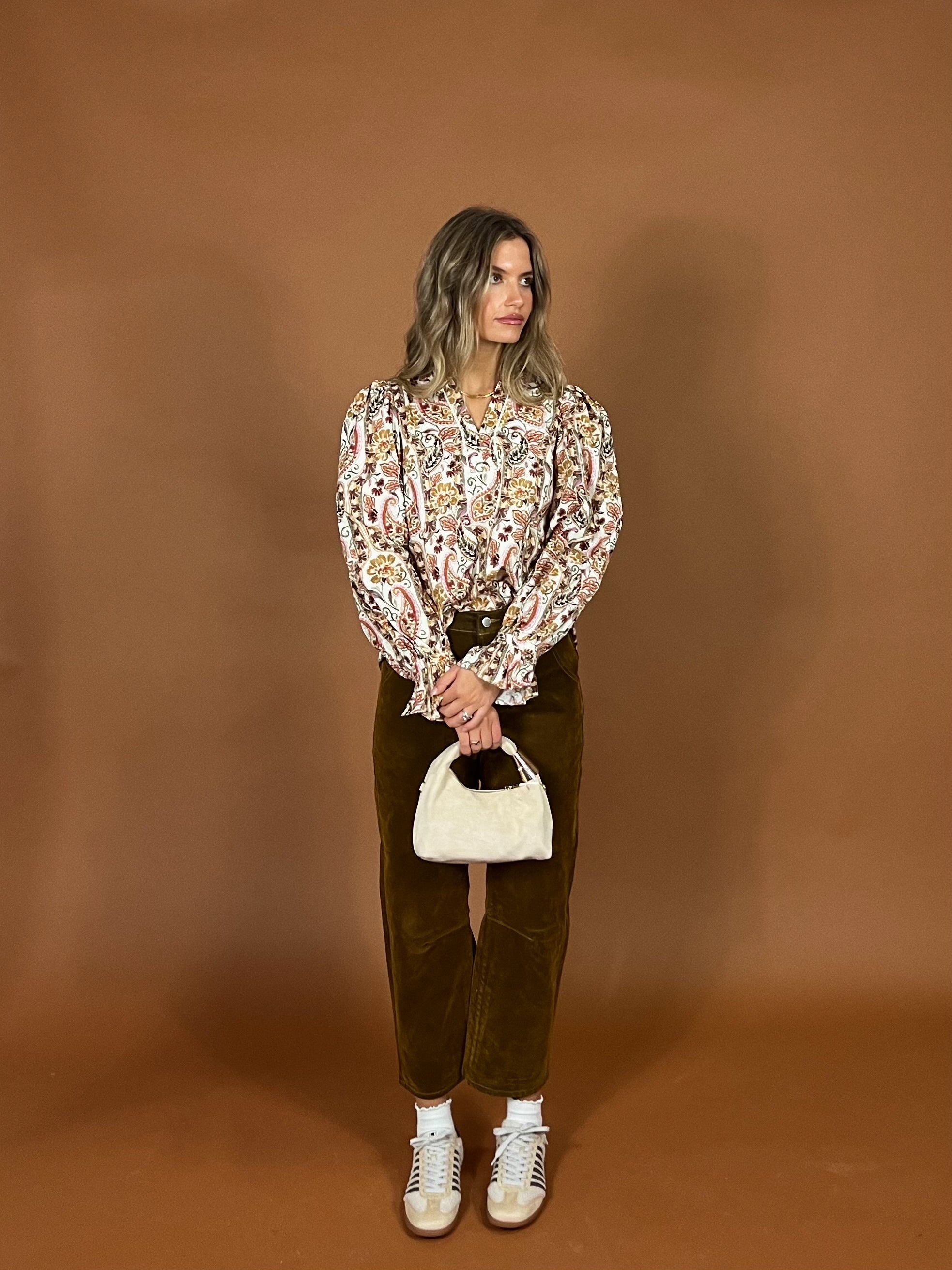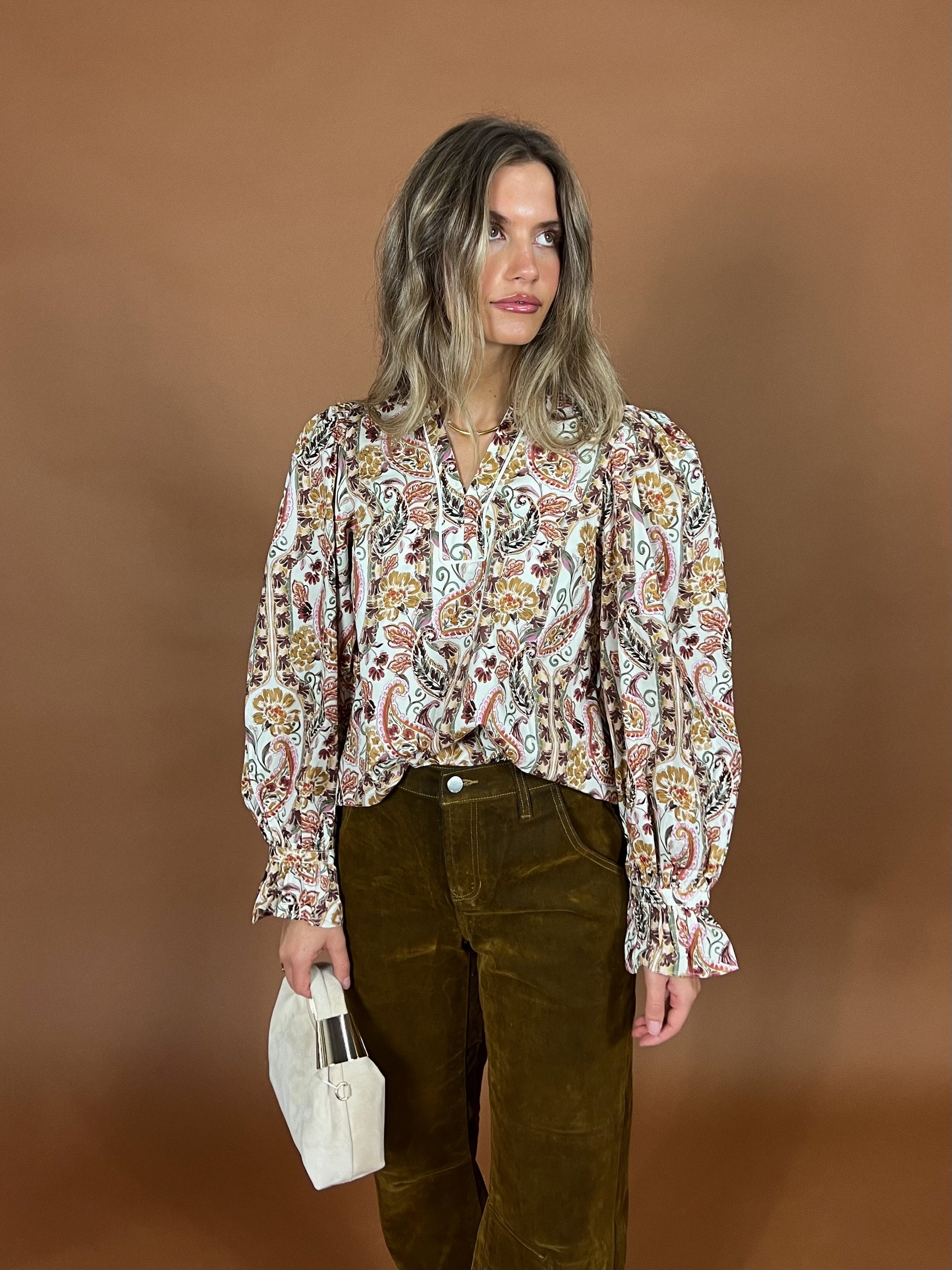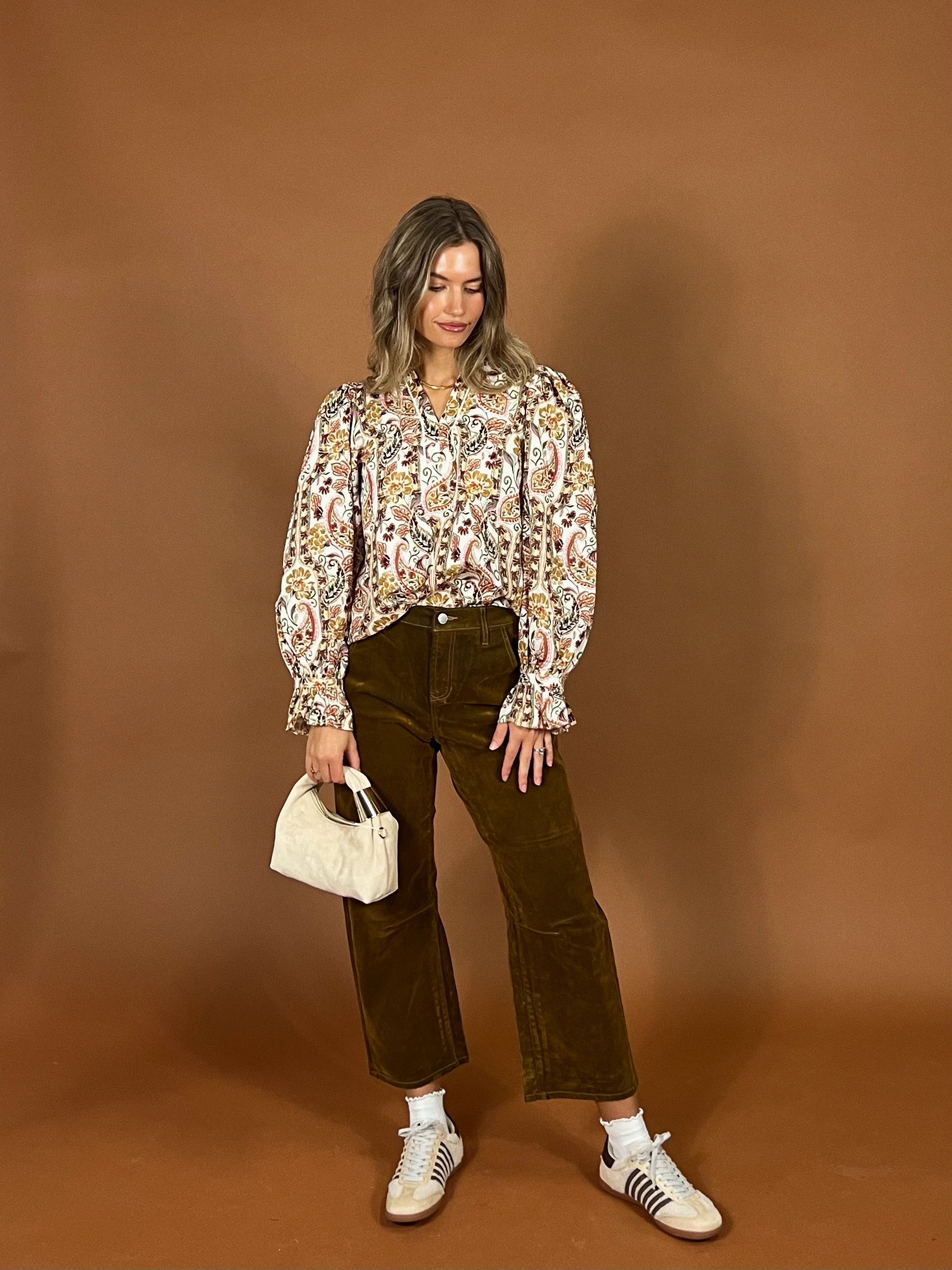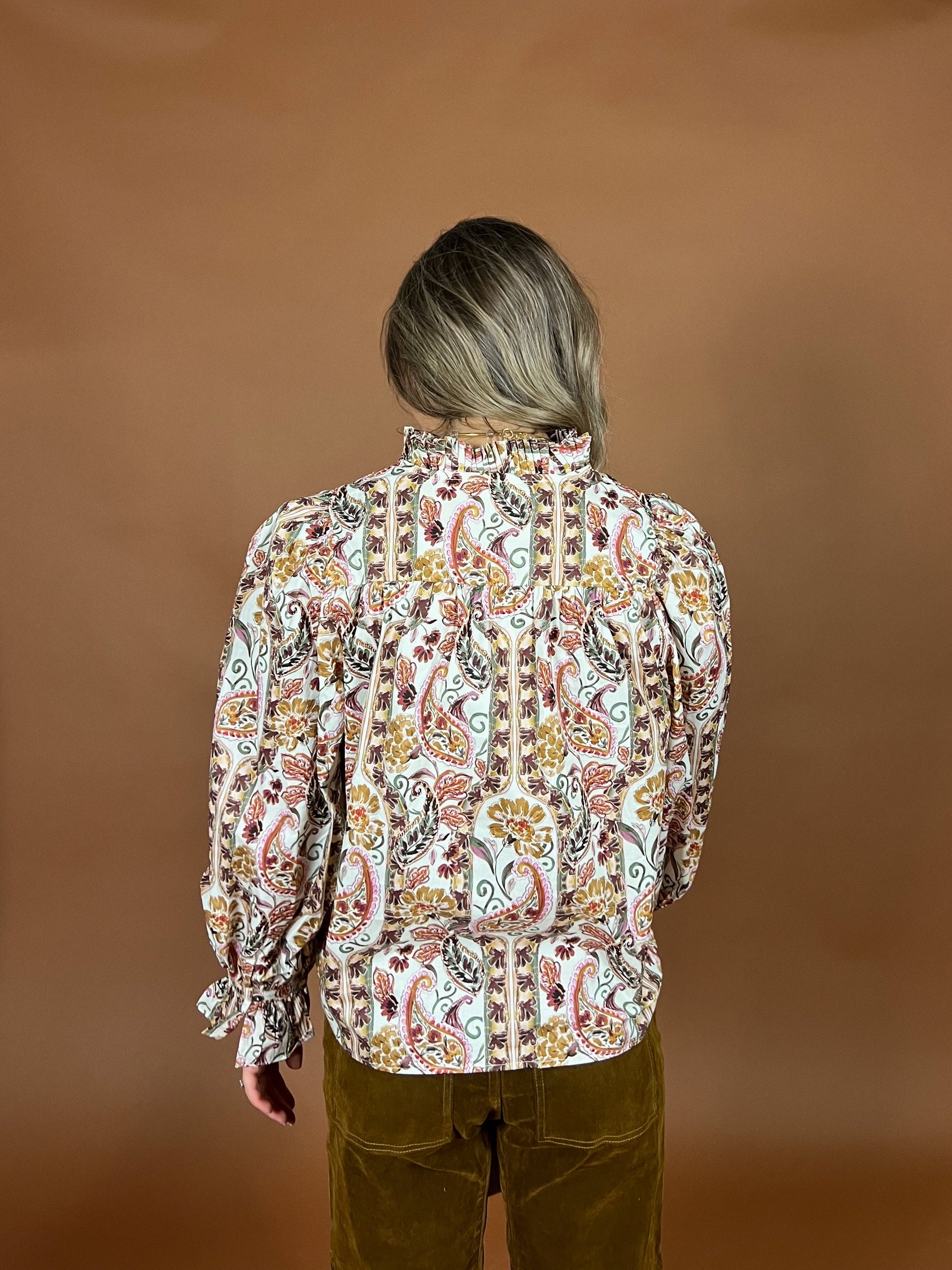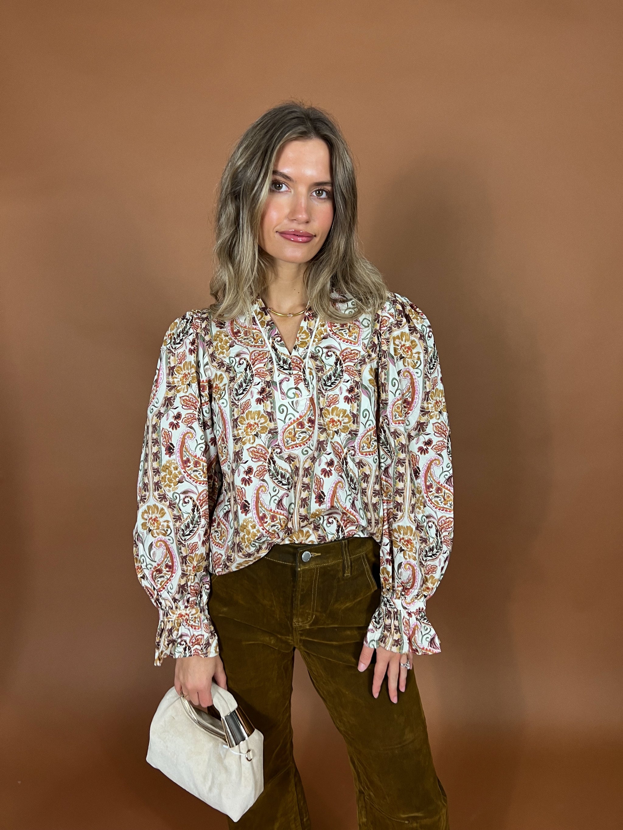 Your new bestie; the Clara. Features a vintage inspired, warm paisley print, subtle ruffle details, and a relaxed yet feminine fit. This blouse brings effortless...