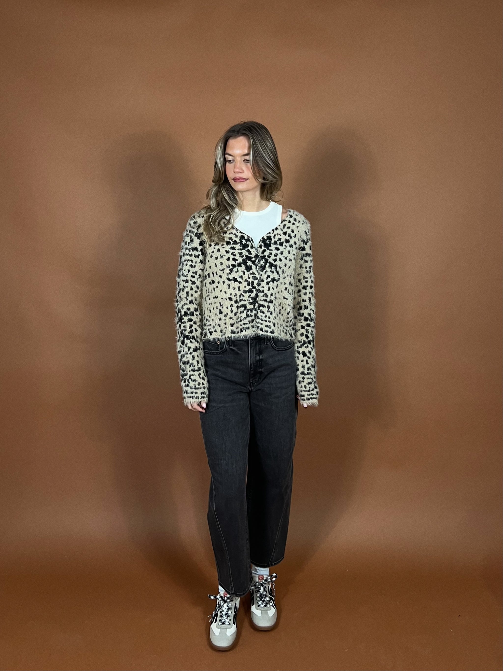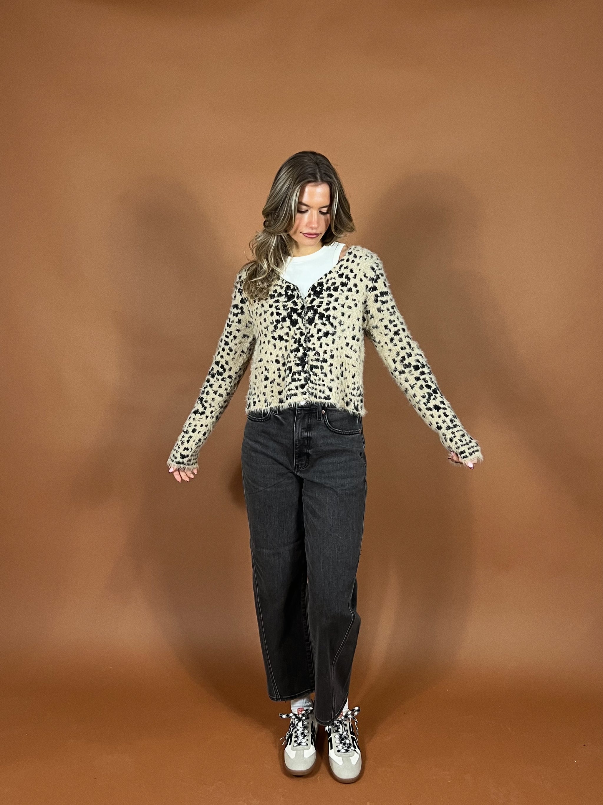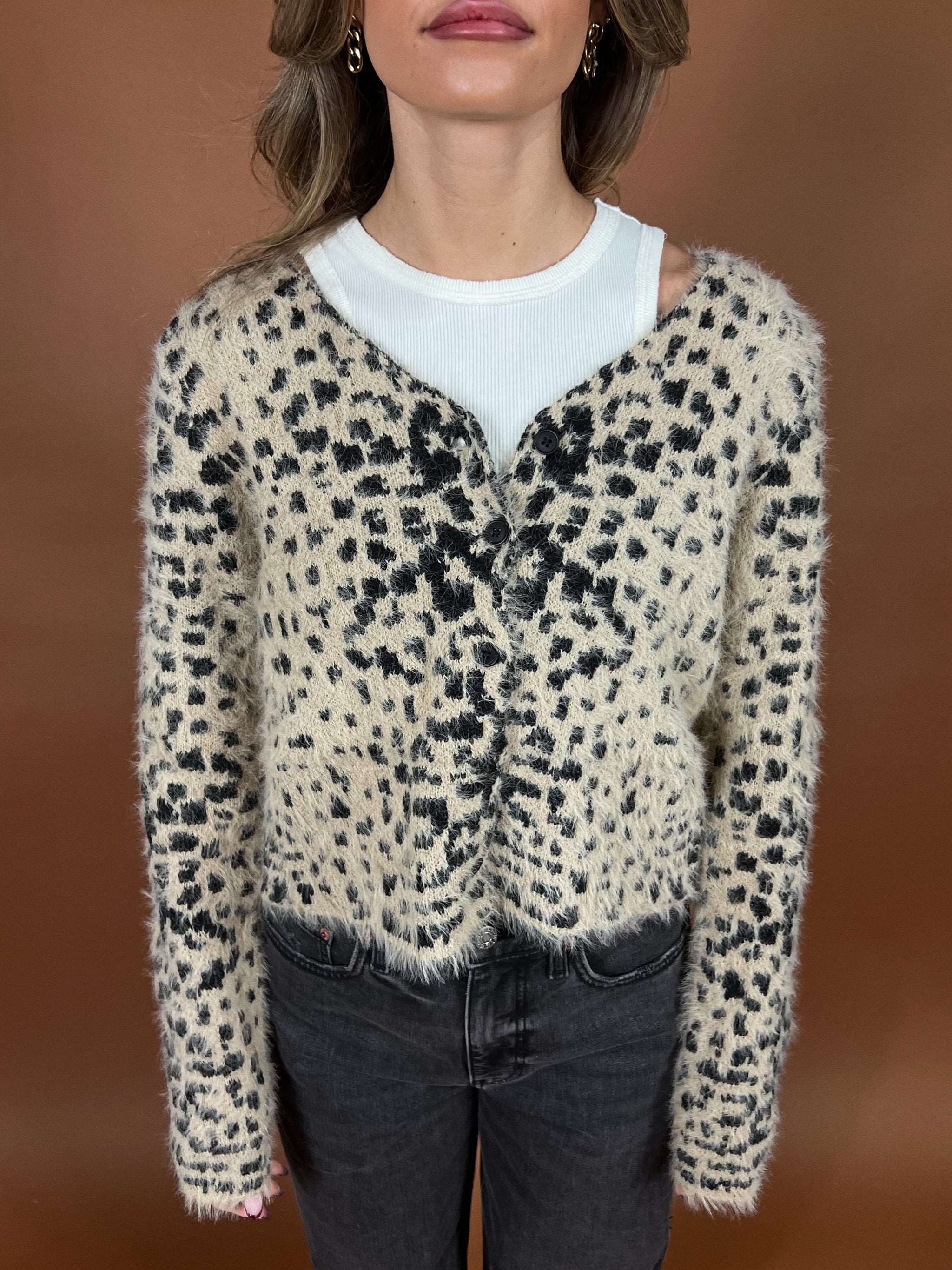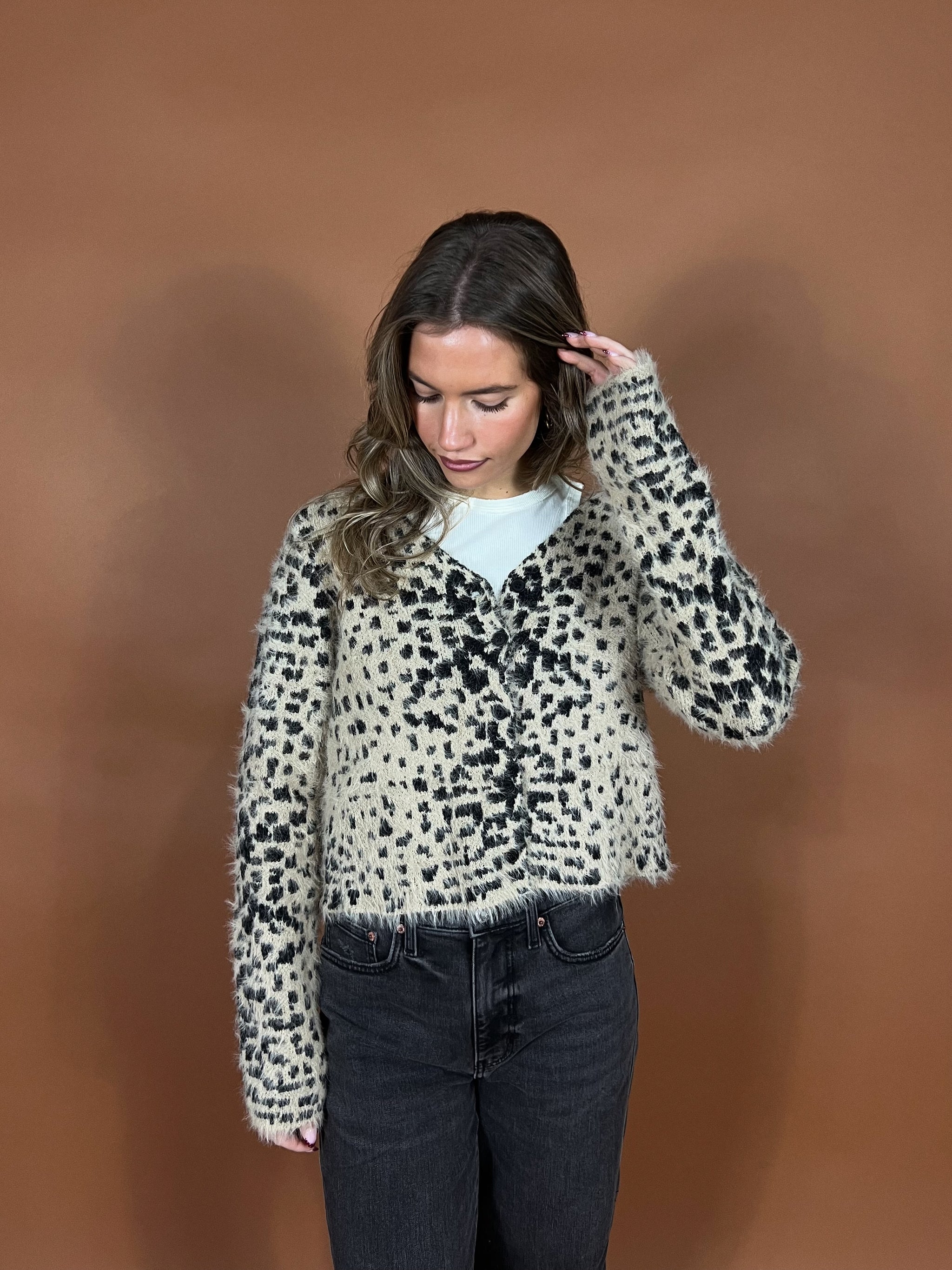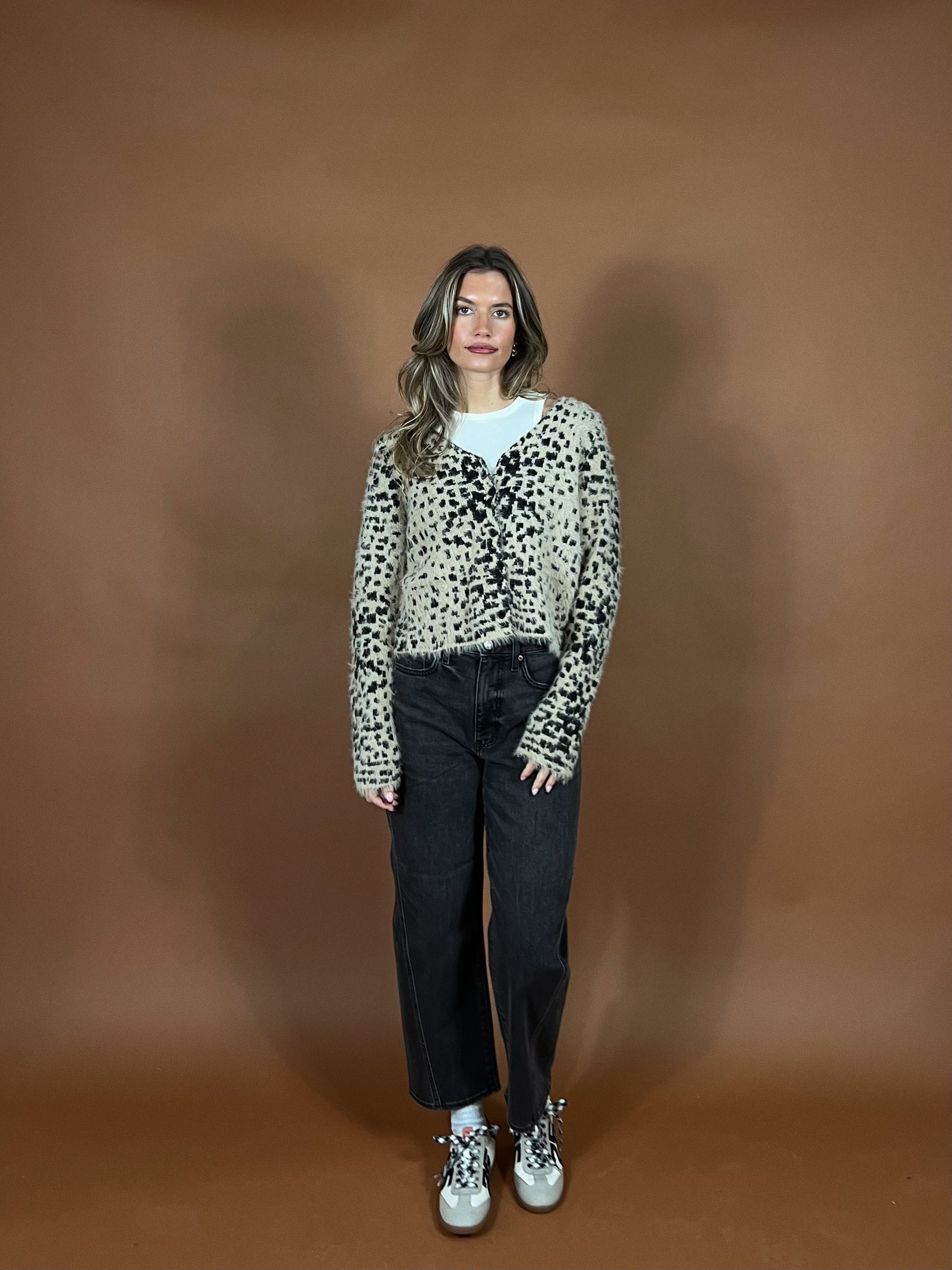 Hand-crafted vibes meet modern styling with its bold black-and-cream diamond pattern, intricate open-crochet detailing, and sweet button-front closure. Lightweight with a structured feel, it layers beautifully over tanks, tees, or a crisp button-down — or wear it on its own for a cool, simple moment.