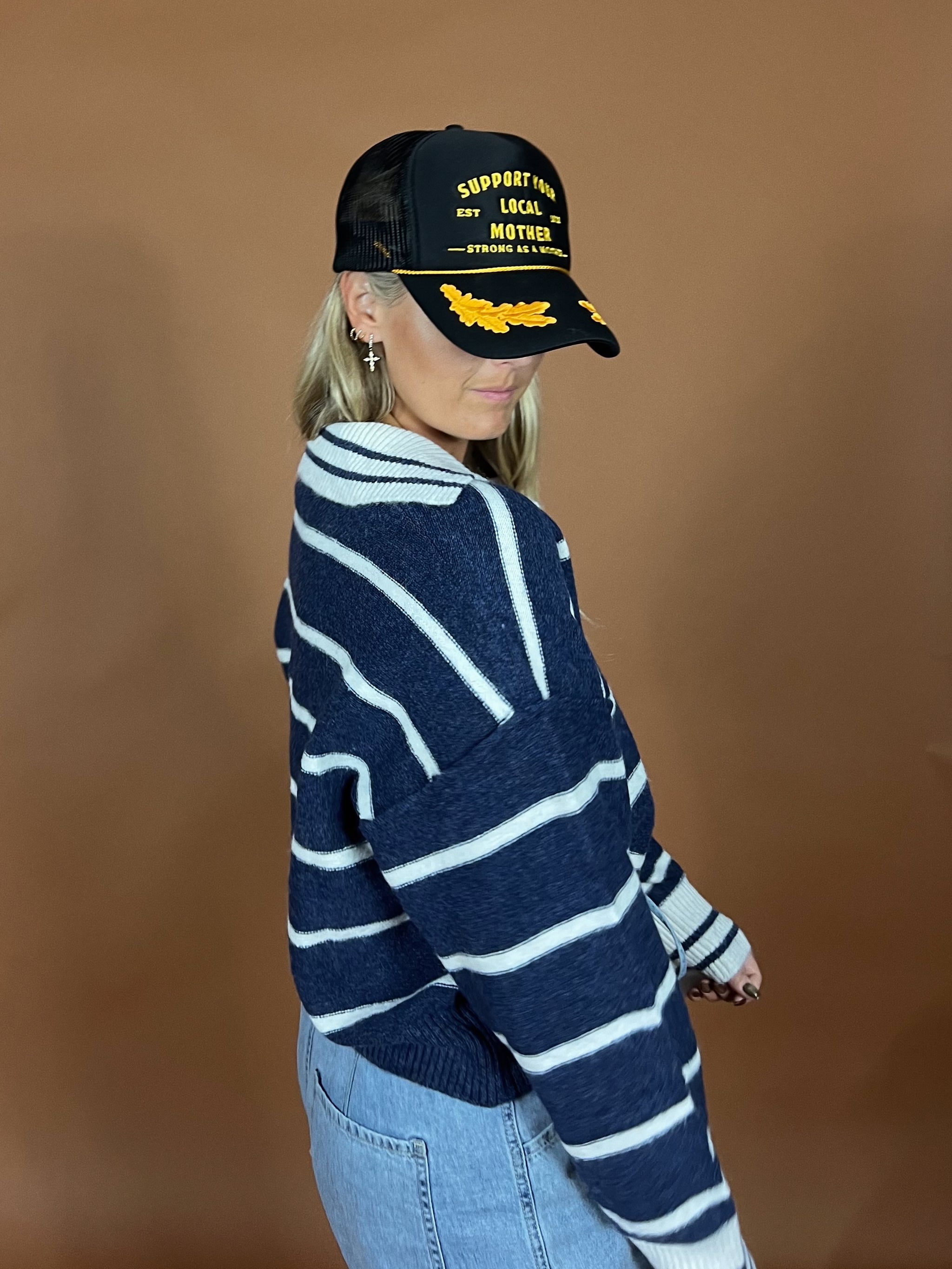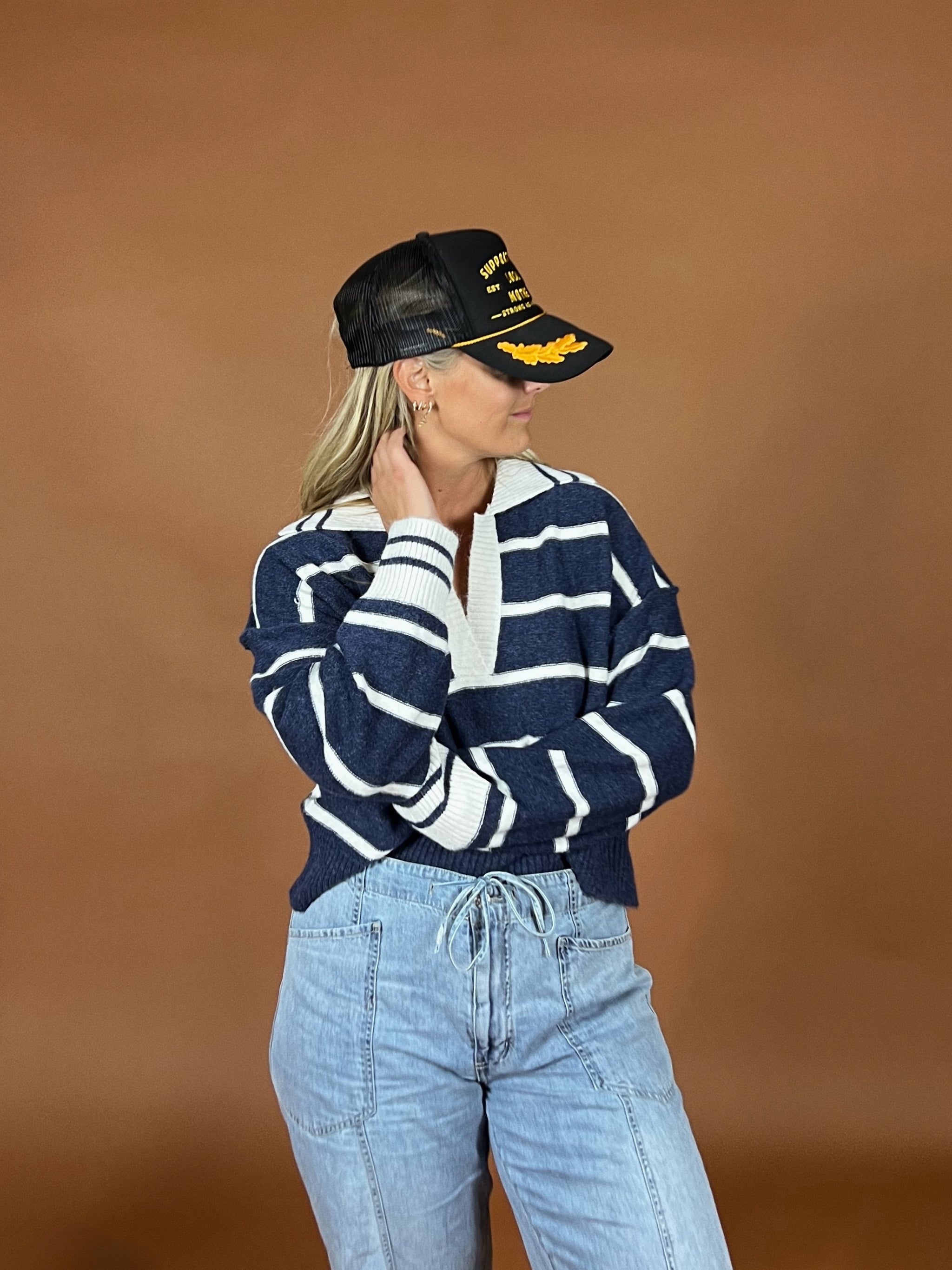 Soft, slouchy, and perfect for chill days. Features a classic navy stripe pattern with a relaxed drop shoulder fit and deep v neckline. Its lightweight...