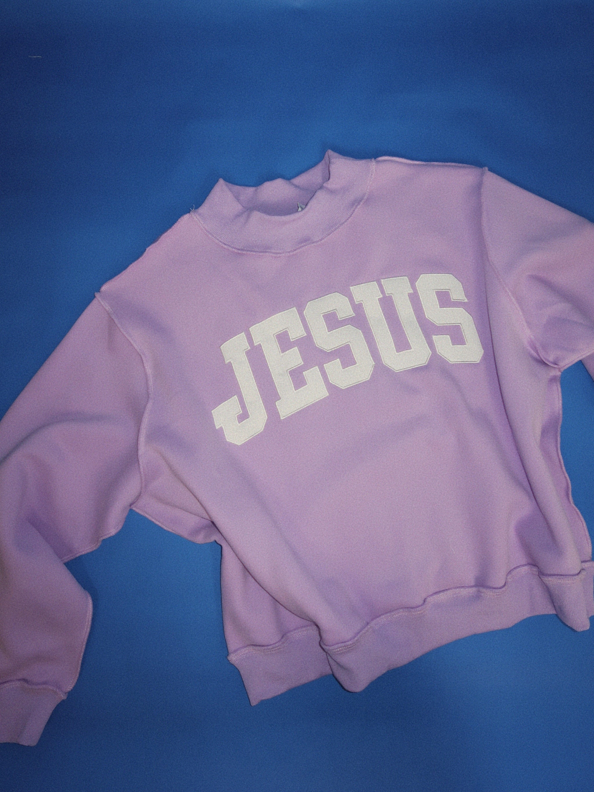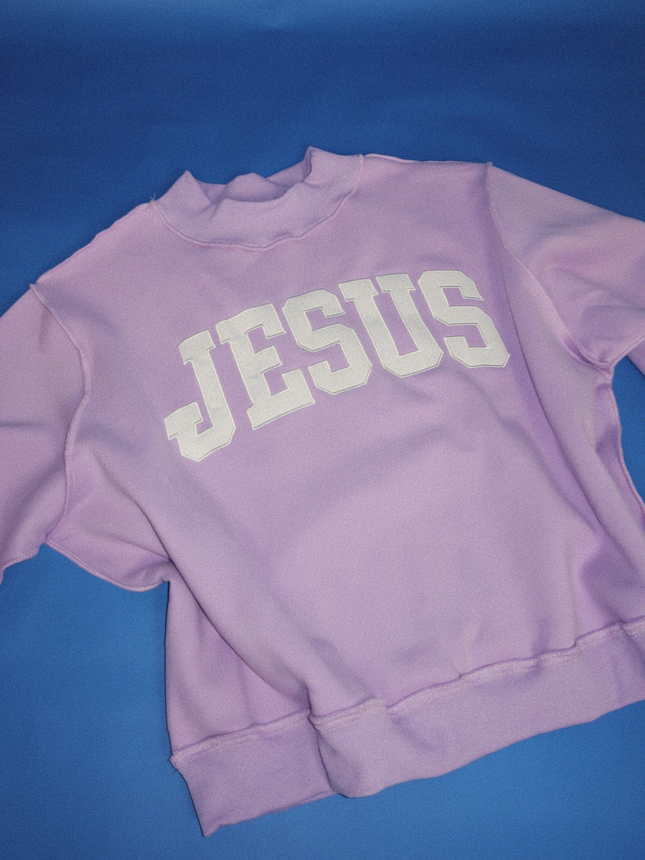 'JESUS' embroidered mock neck sweatshirt Mock Neck Drop Shoulder, long sleeves Soft, cozy fleece Oversized fit Not reversible True to size.