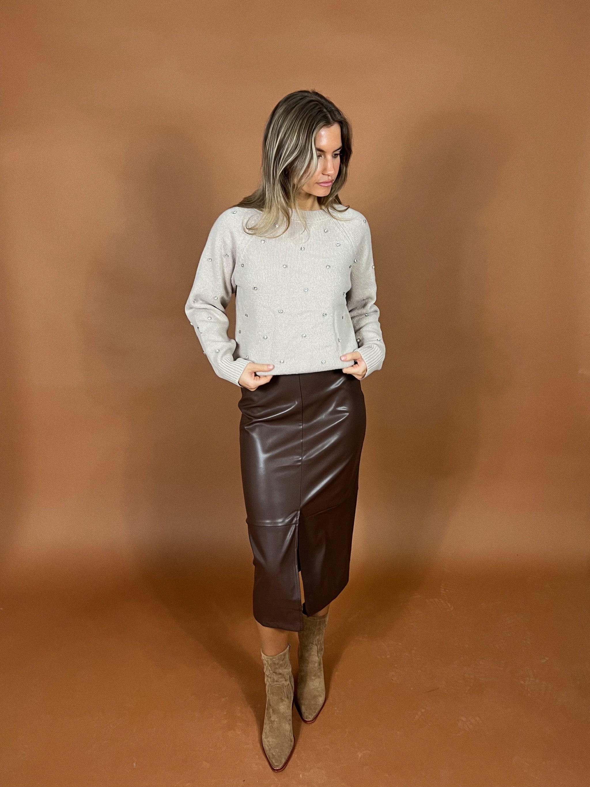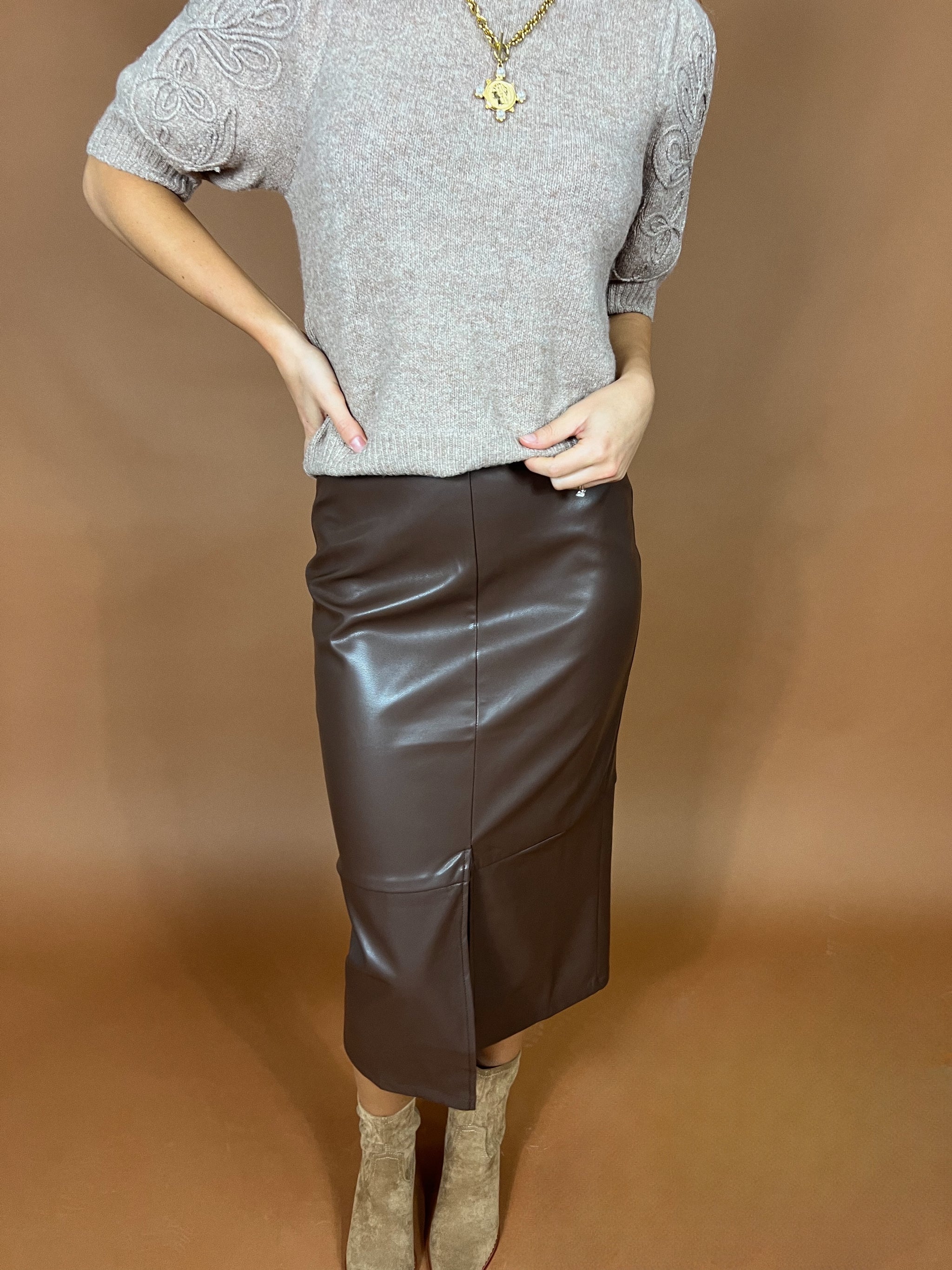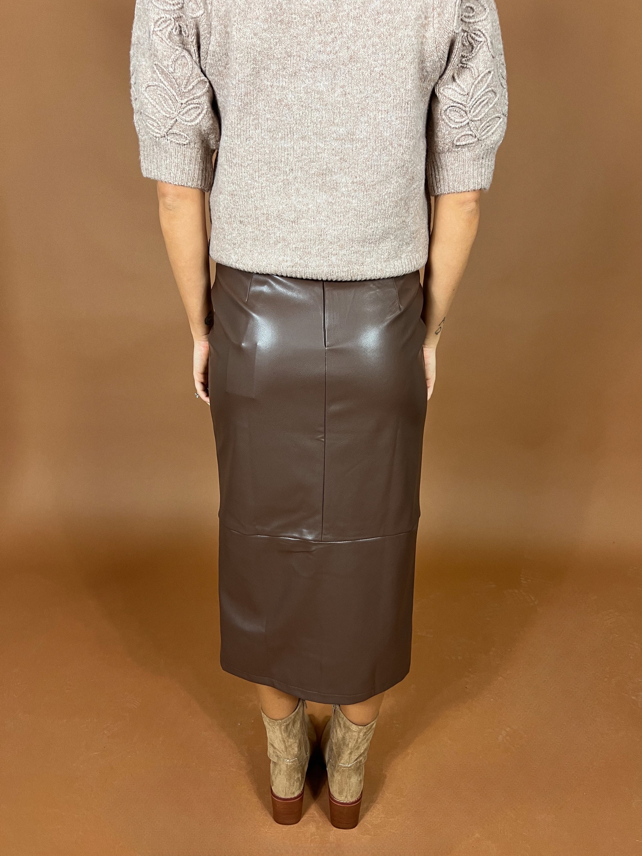 Sleek, structured, and endlessly wearable. Made from buttery faux leather in a rich espresso, this skirt flatters with its high waisted silhouette and tailored column...