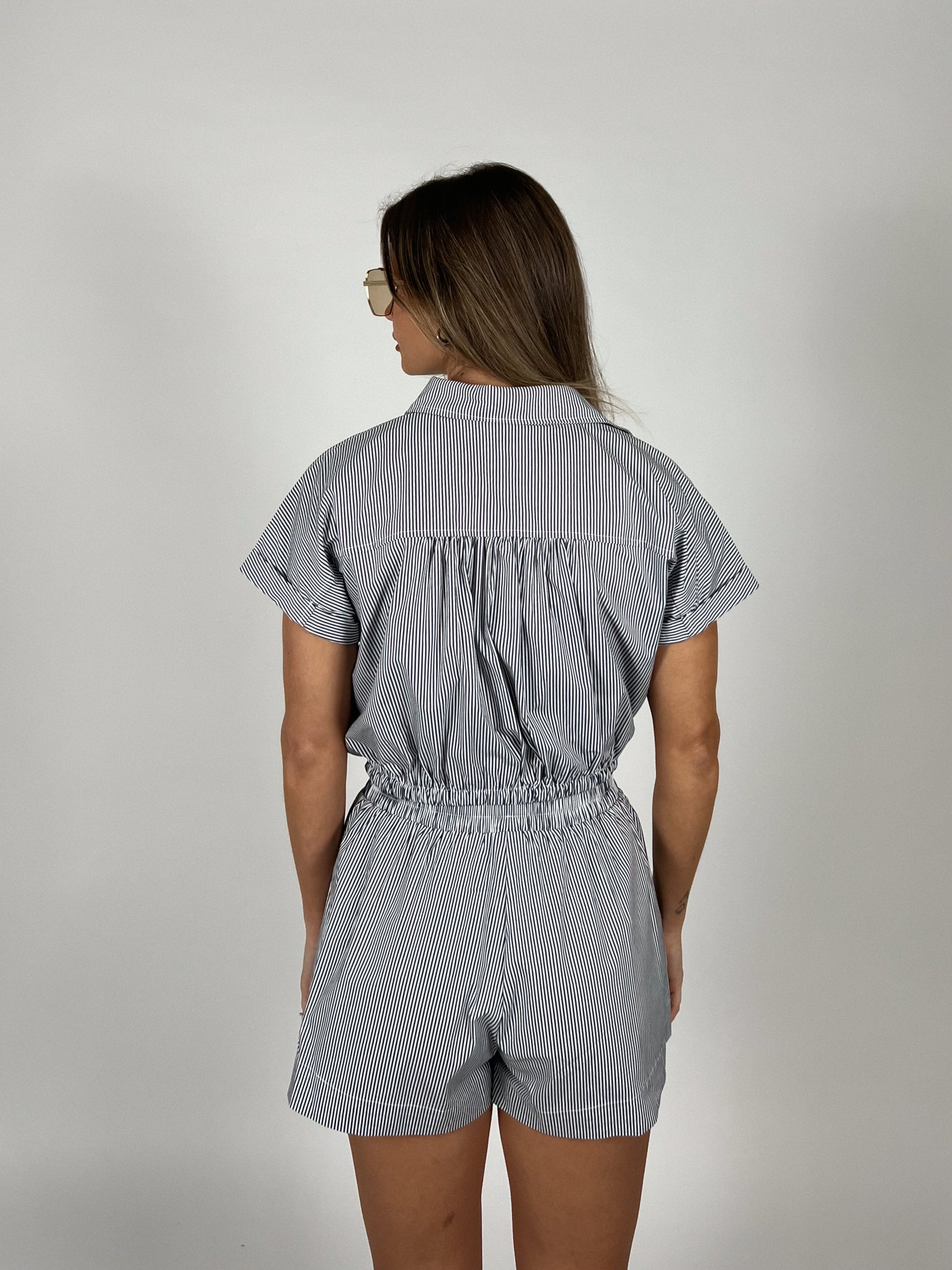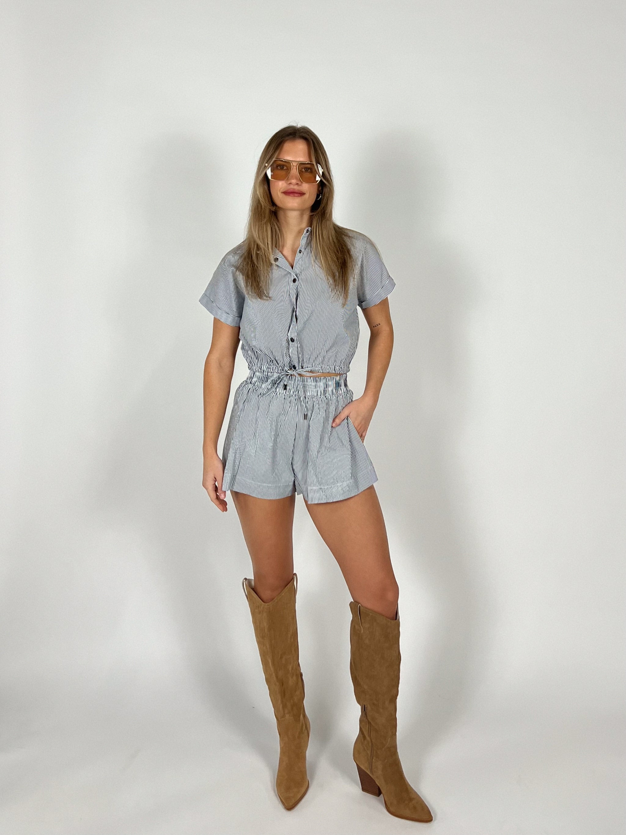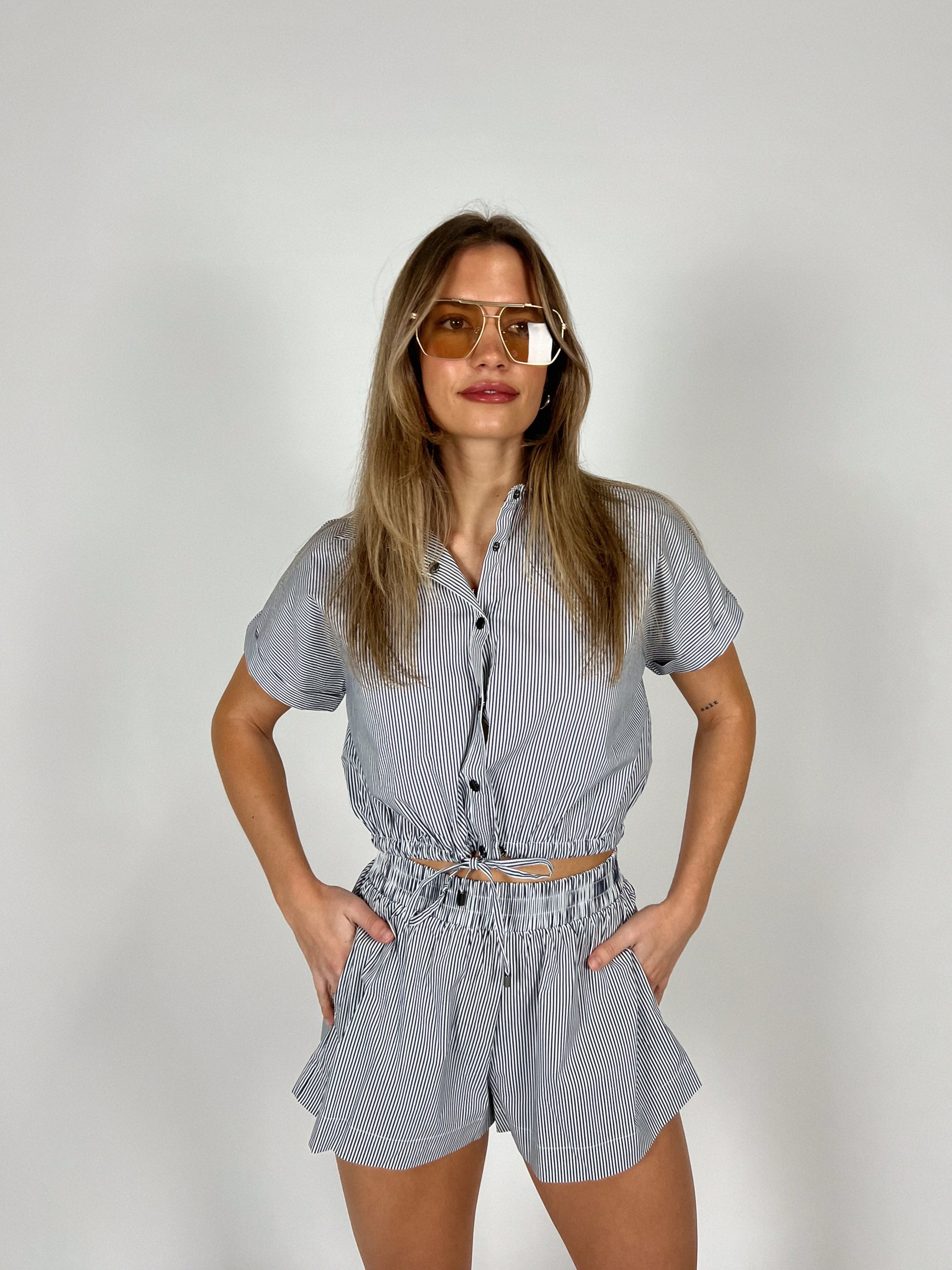 No nonsense here. Just this cute set. This lightweight two piece set features a classic navy and white pinstripe with an easy button front top...
