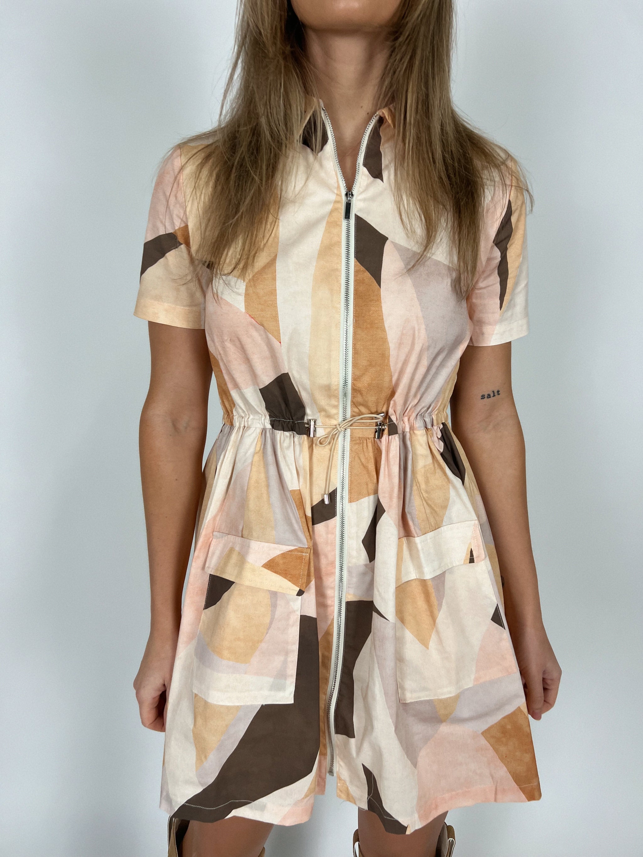 A statement dress that brings color, shape, and ease. Featuring a warm tones abstract print, this short sleeve dress is finished with a full front...