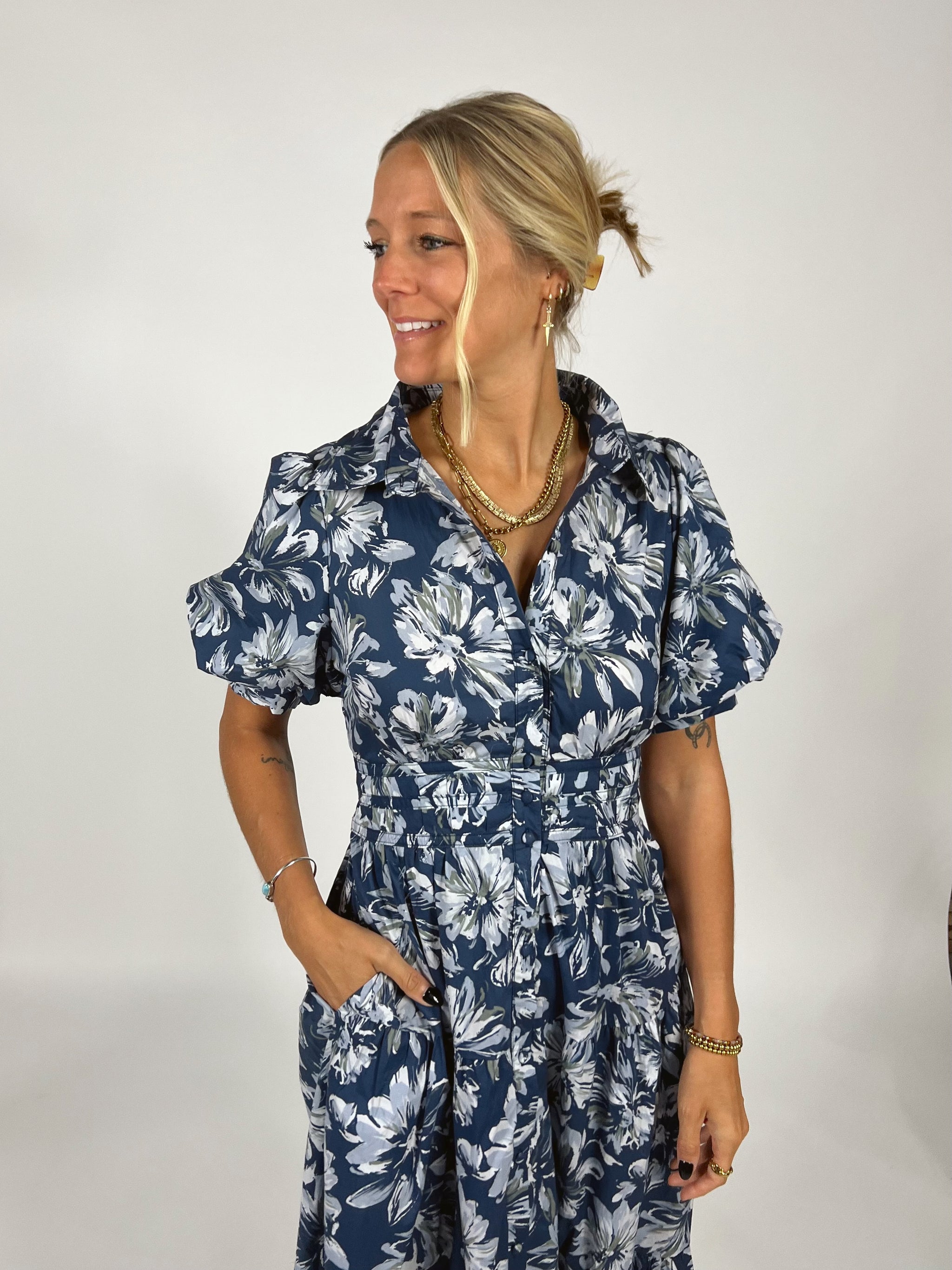 Meet your new timeless statement piece. This midi dress pairs a rich navy backdrop with bold white florals, creating an effortlessly elegant silhouette. With its...